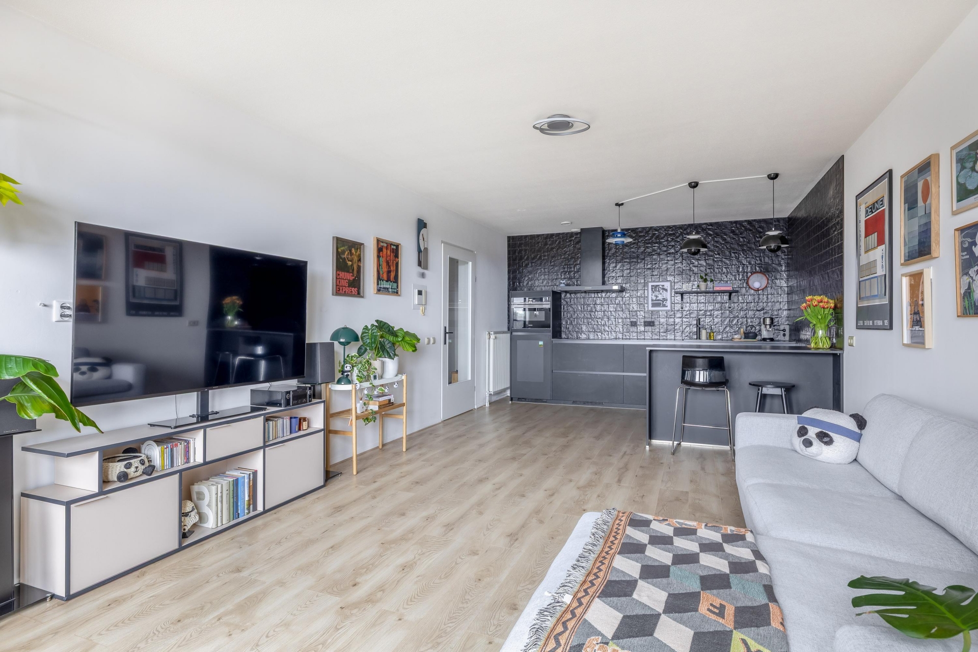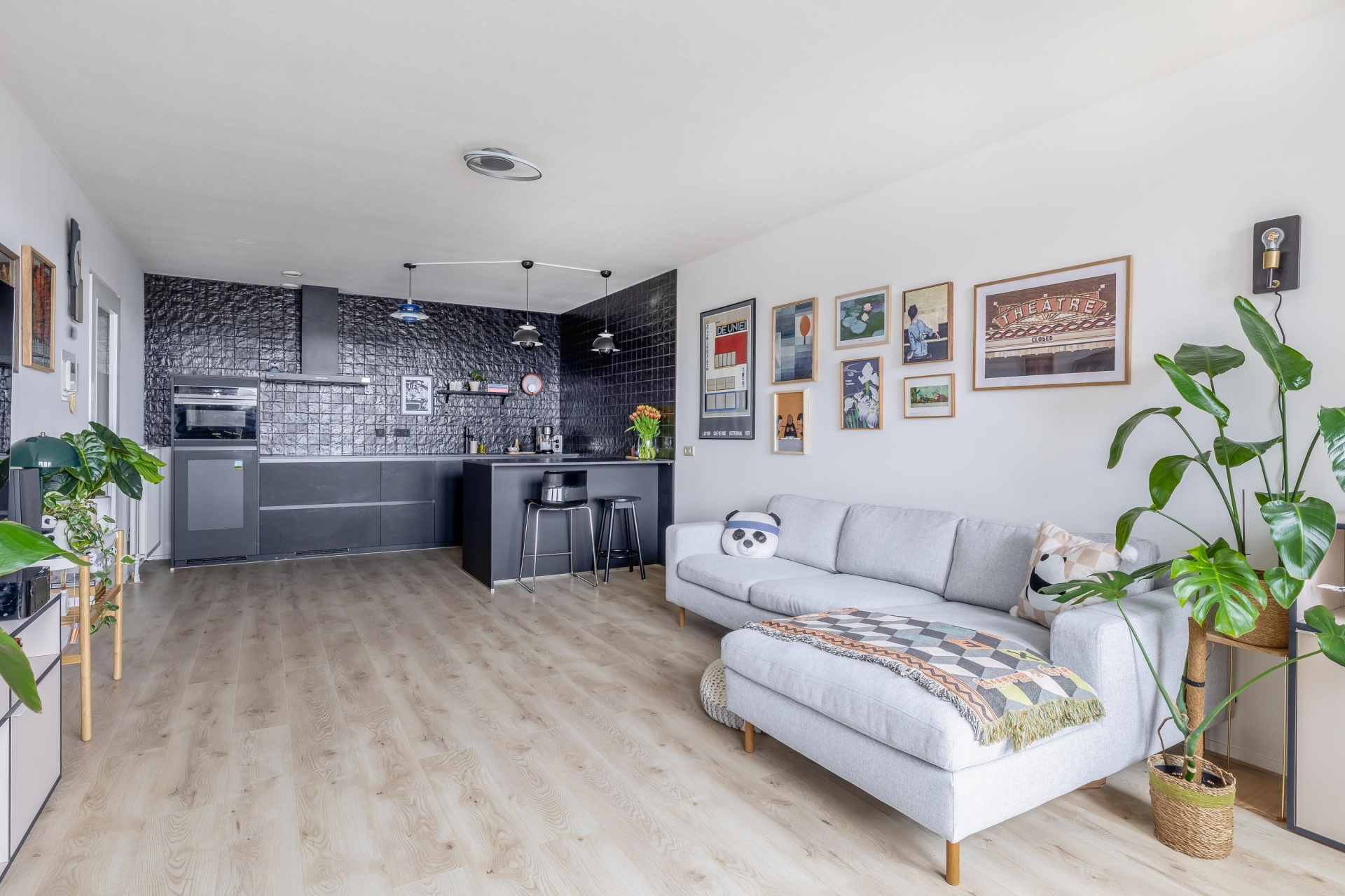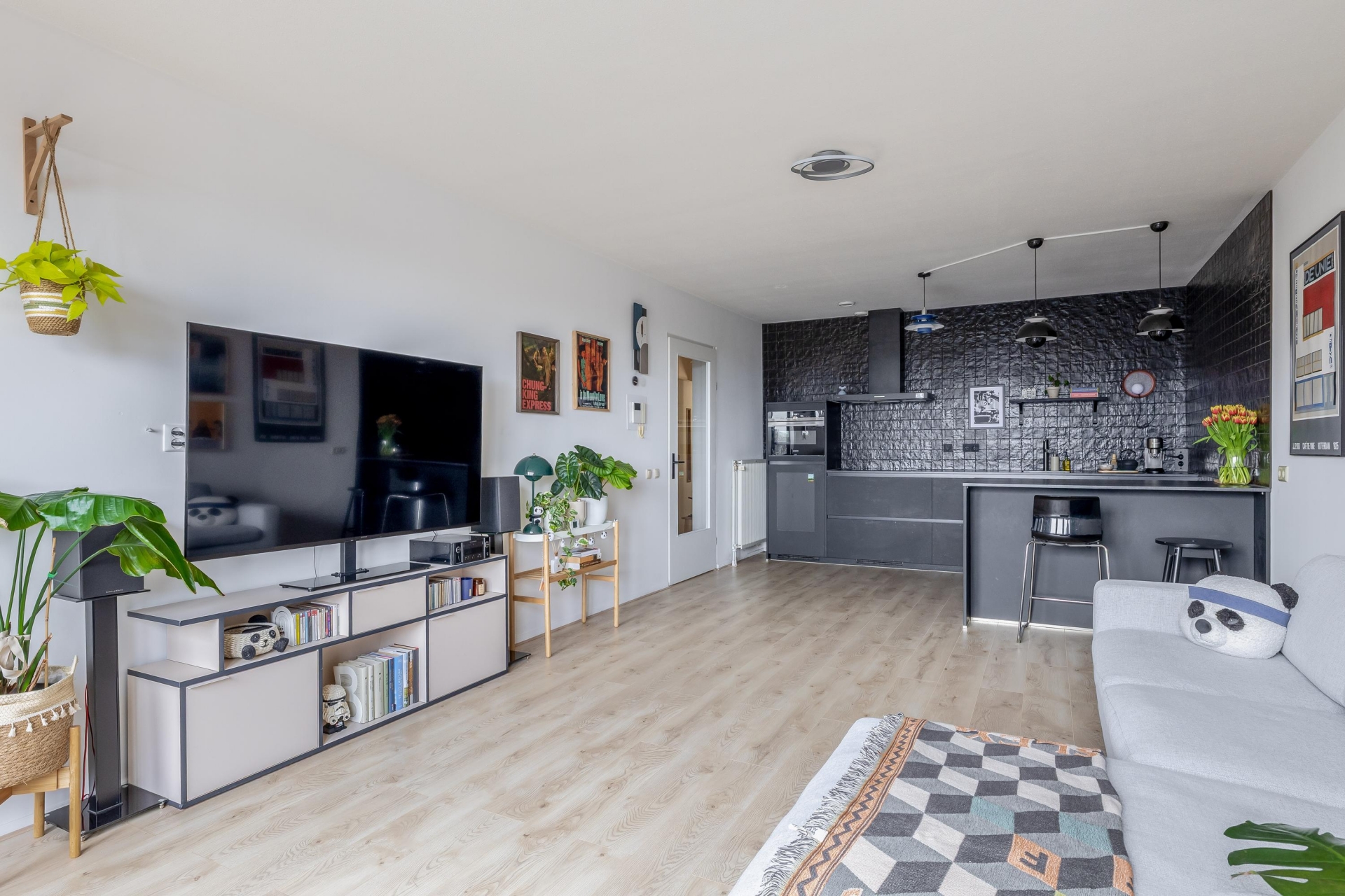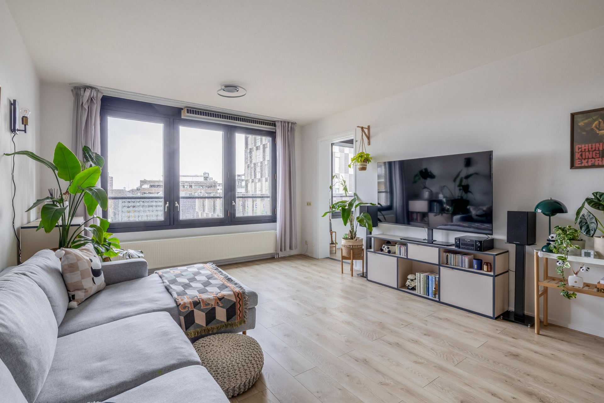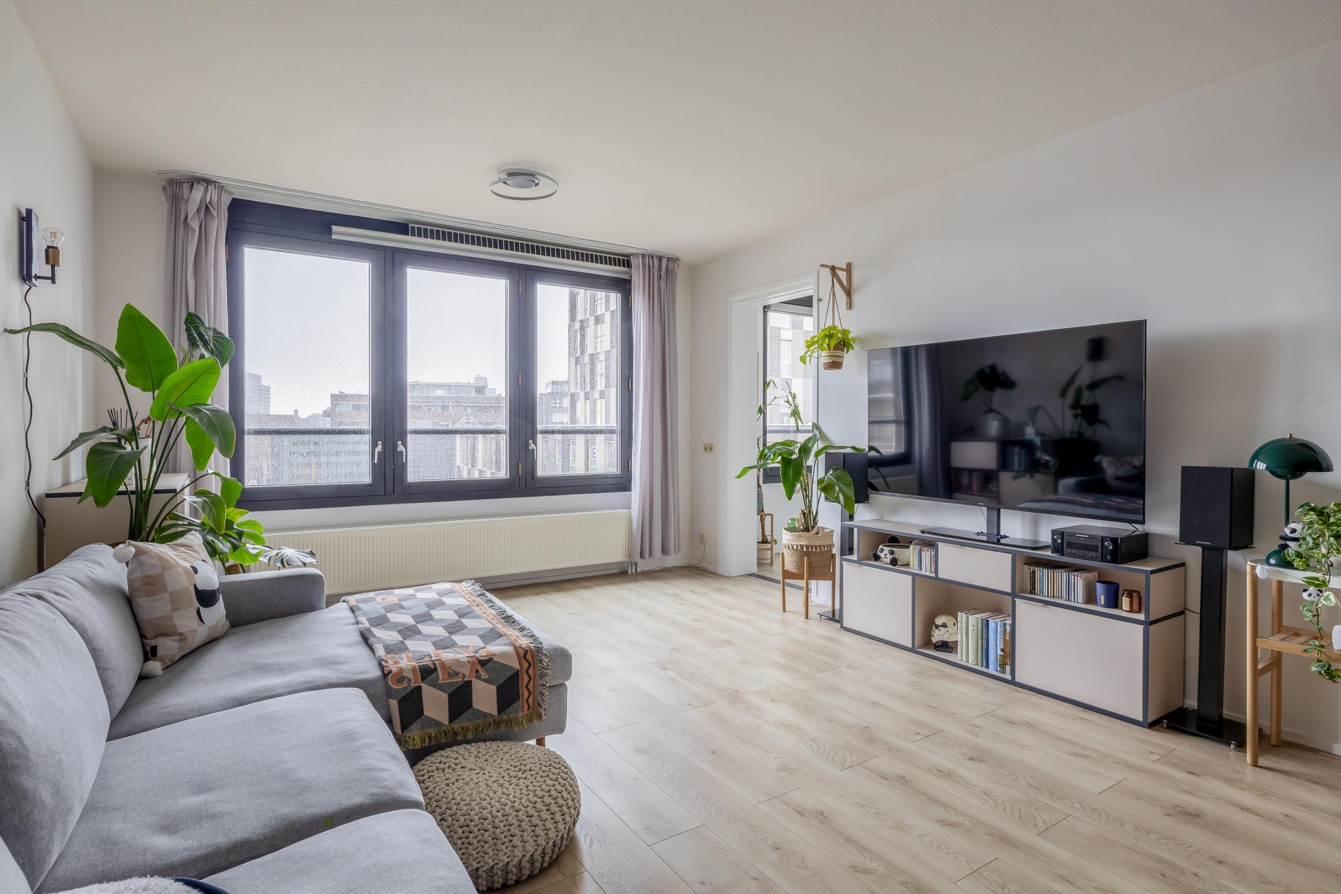 De woonkamer is ruim opgezet en biedt voldoende plek voor een gezellige zithoek en een eethoek. Dankzij de brede raampartijen voelt de ruimte nog groter aan en geniet je hier van een mooi uitzicht richting de stad. De afwerking is strak en neutraal, waardoor je hier direct je eigen stijl kunt toevoegen.