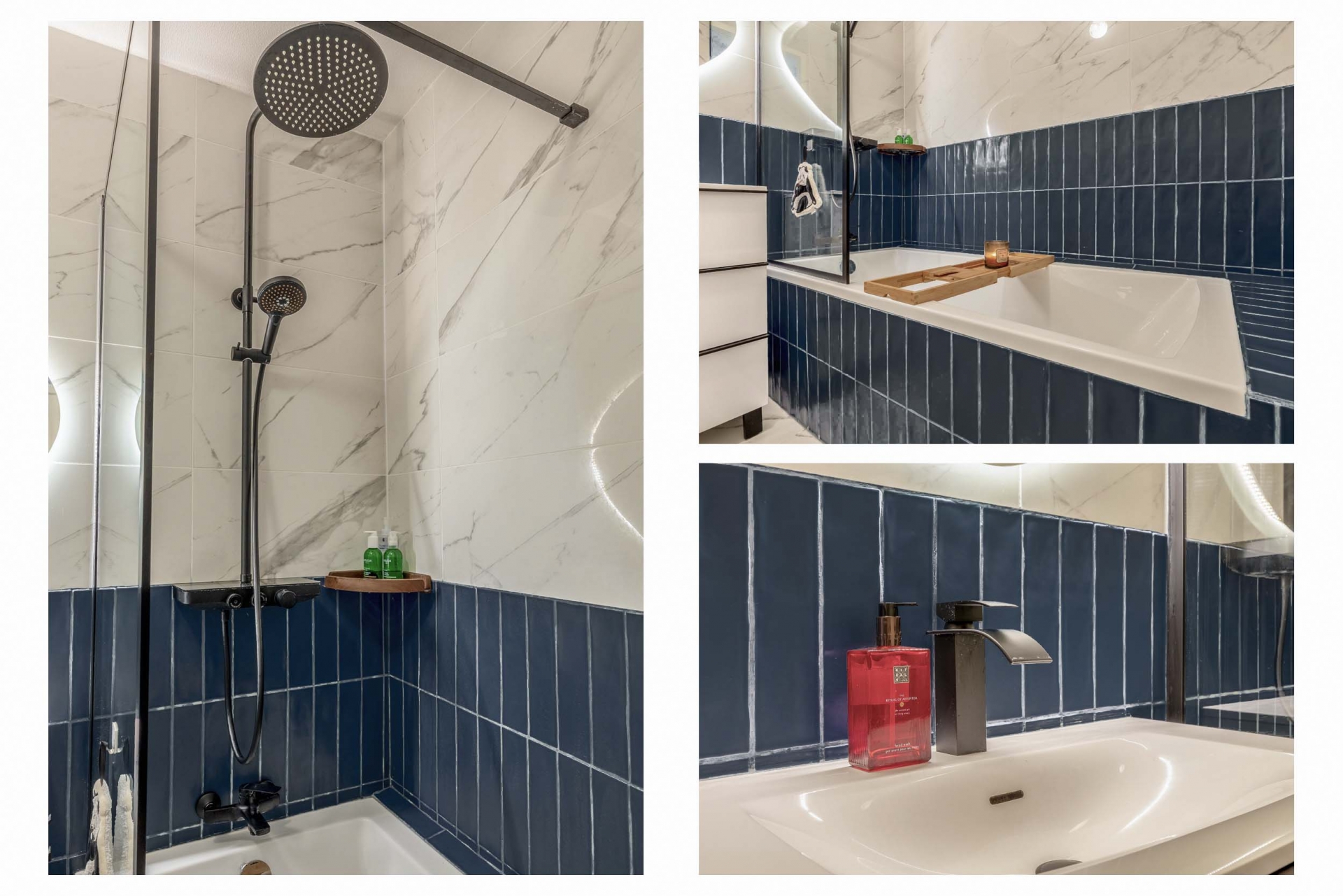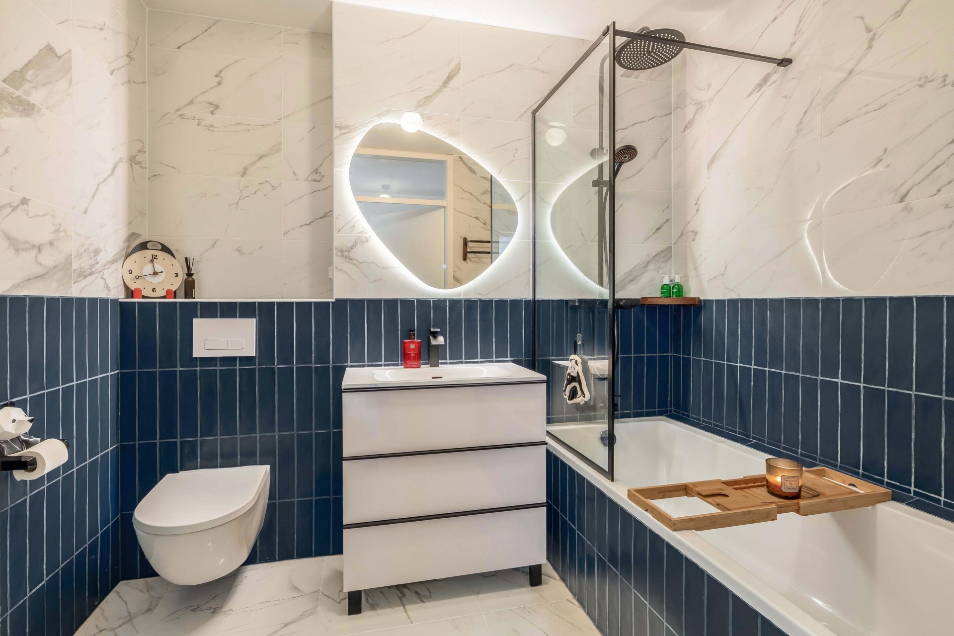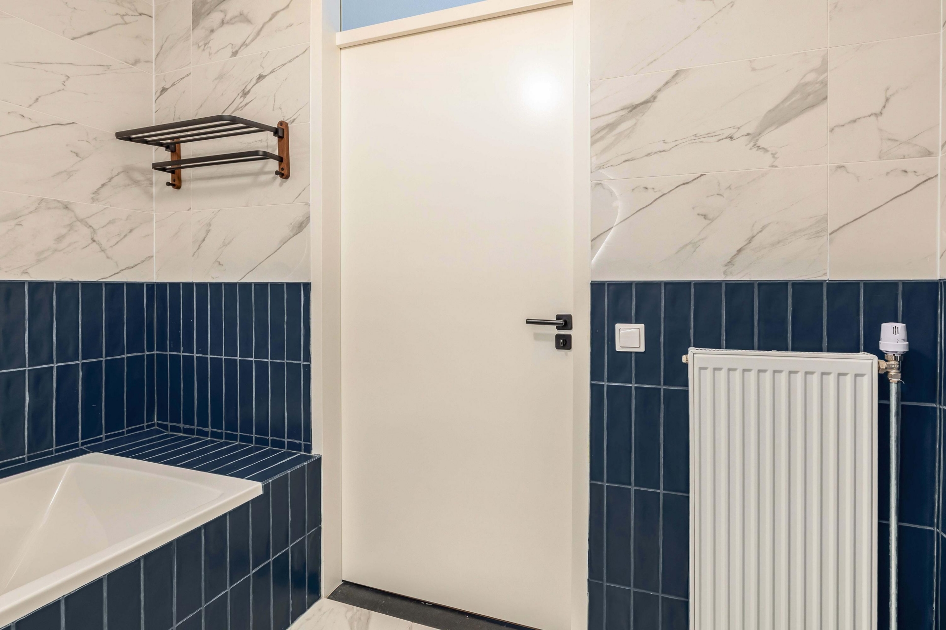De badkamer is in 2022 vernieuwd en dat zie je direct terug in de afwerking. De combinatie van lichte wandtegels en blauwe accenten geeft het geheel een frisse en eigentijdse uitstraling. Je beschikt hier over een ligbad met douche, een wastafelmeubel en een toilet. Alles is netjes afgewerkt en klaar voor gebruik.