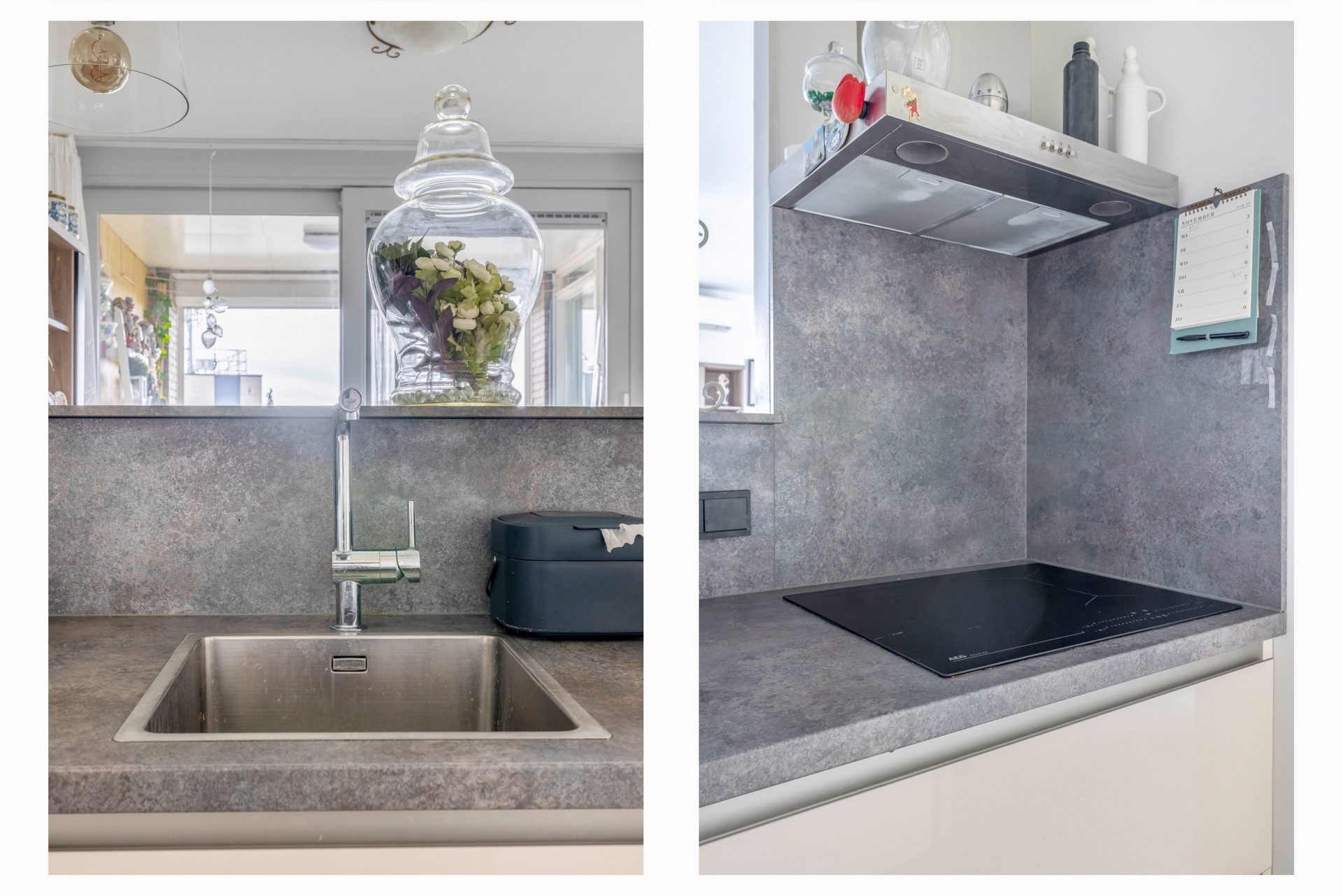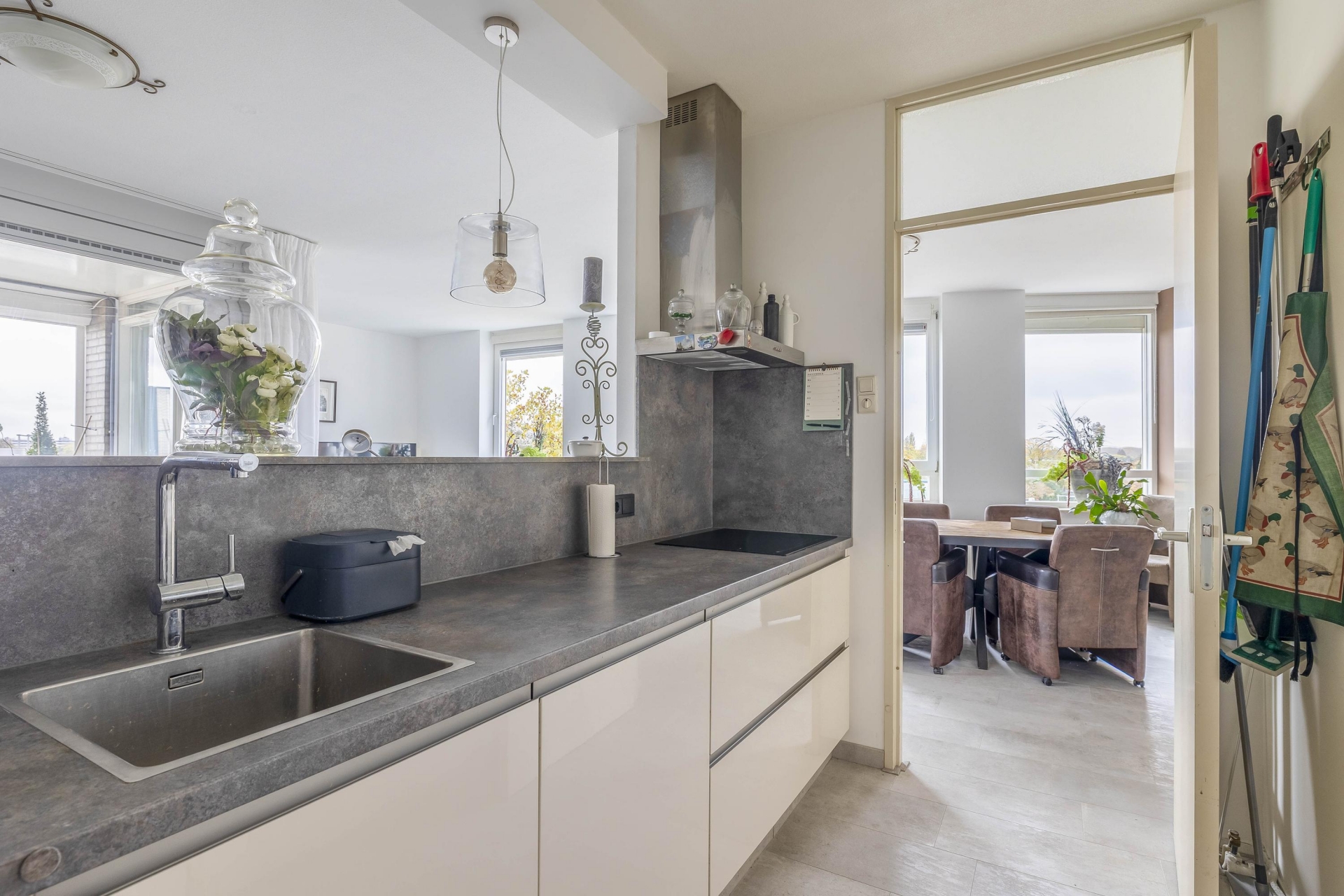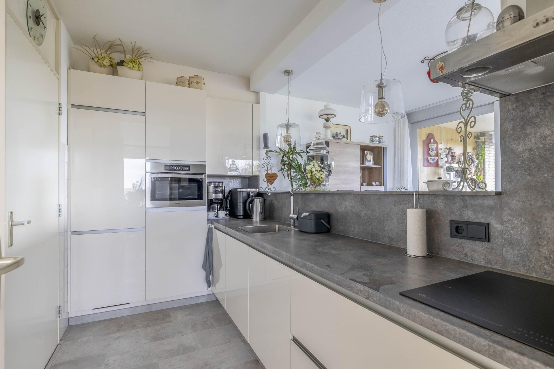 De halfopen keuken is uitgevoerd in een nette L-opstelling en voorzien van diverse inbouwapparatuur: vaatwasser, koelkast, vriezer, combi-oven, inductiekookplaat en recirculatie afzuigkap. Vanuit de keuken is de grote bergruimte met wasmachine aansluiting bereikbaar.