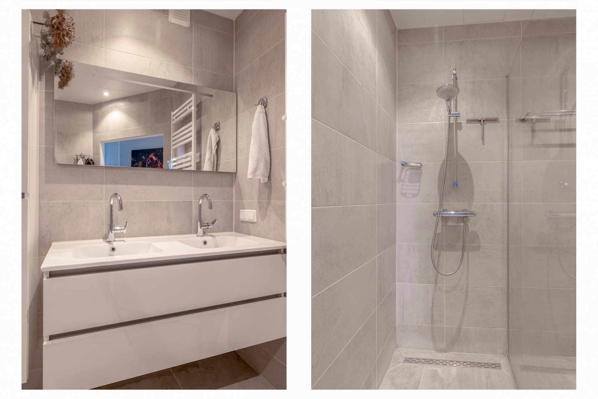 De moderne badkamer is uitgerust met, inloopdouche, urinoir, wastafelmeubel en elektrische radiator. Separaat Japans toilet met fonteintje.