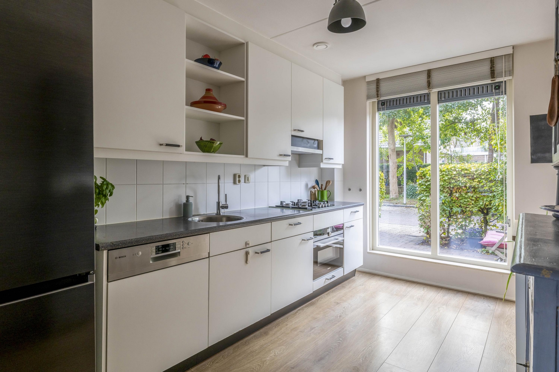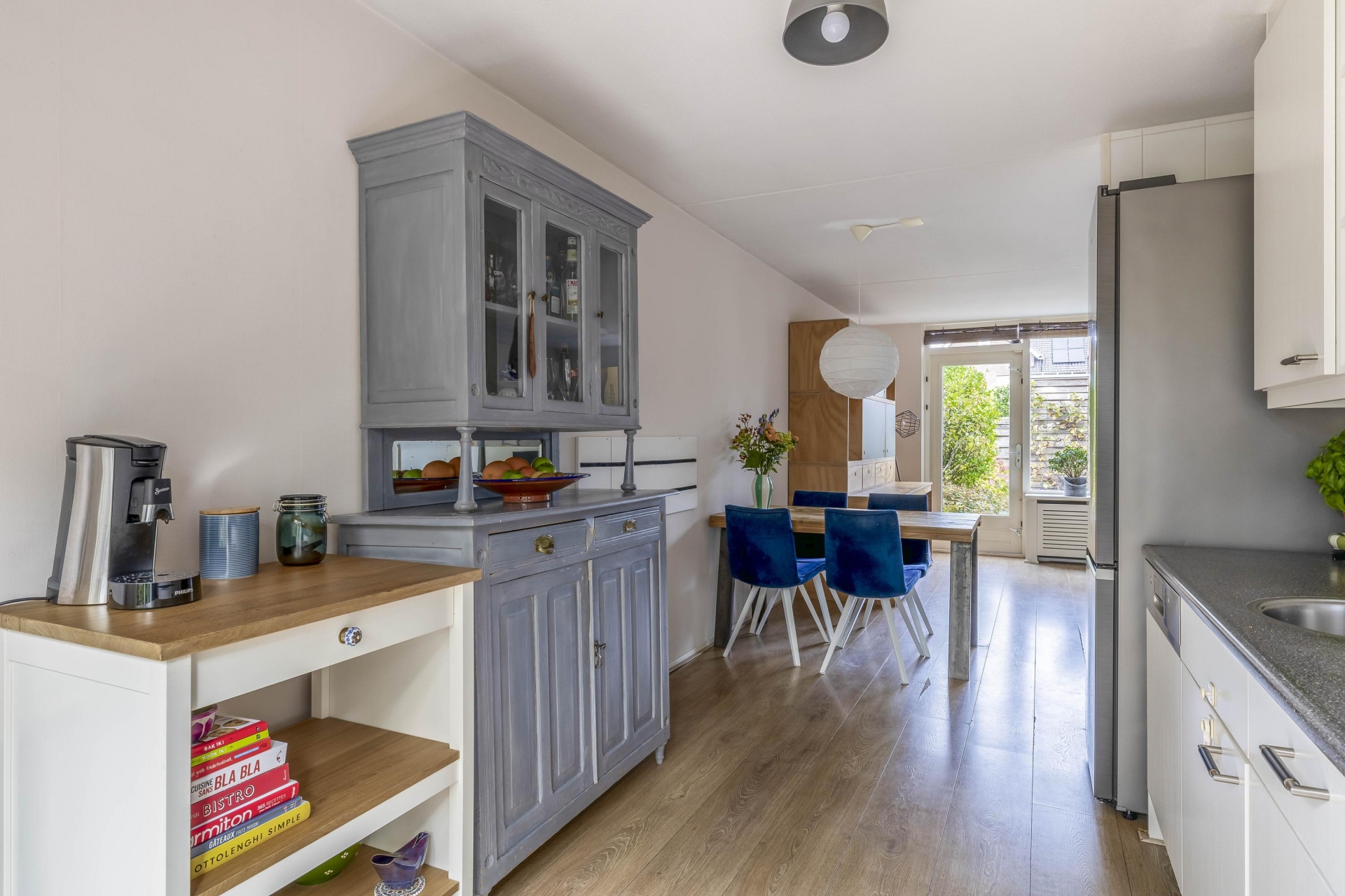 Entree via de hal met moderne meterkast, trapopgang en toiletruimte met fonteintje. De lichte doorzonwoonkamer biedt een prettige leefruimte en staat in open verbinding met de nette keuken. Deze is voorzien van diverse inbouwapparatuur waaronder een vaatwasser, 4-pits kookplaat en combi-oven. Vanuit de woonkamer is er toegang tot de goed aangelegde, zonnige achtertuin met vrijstaande houten berging en achterom.