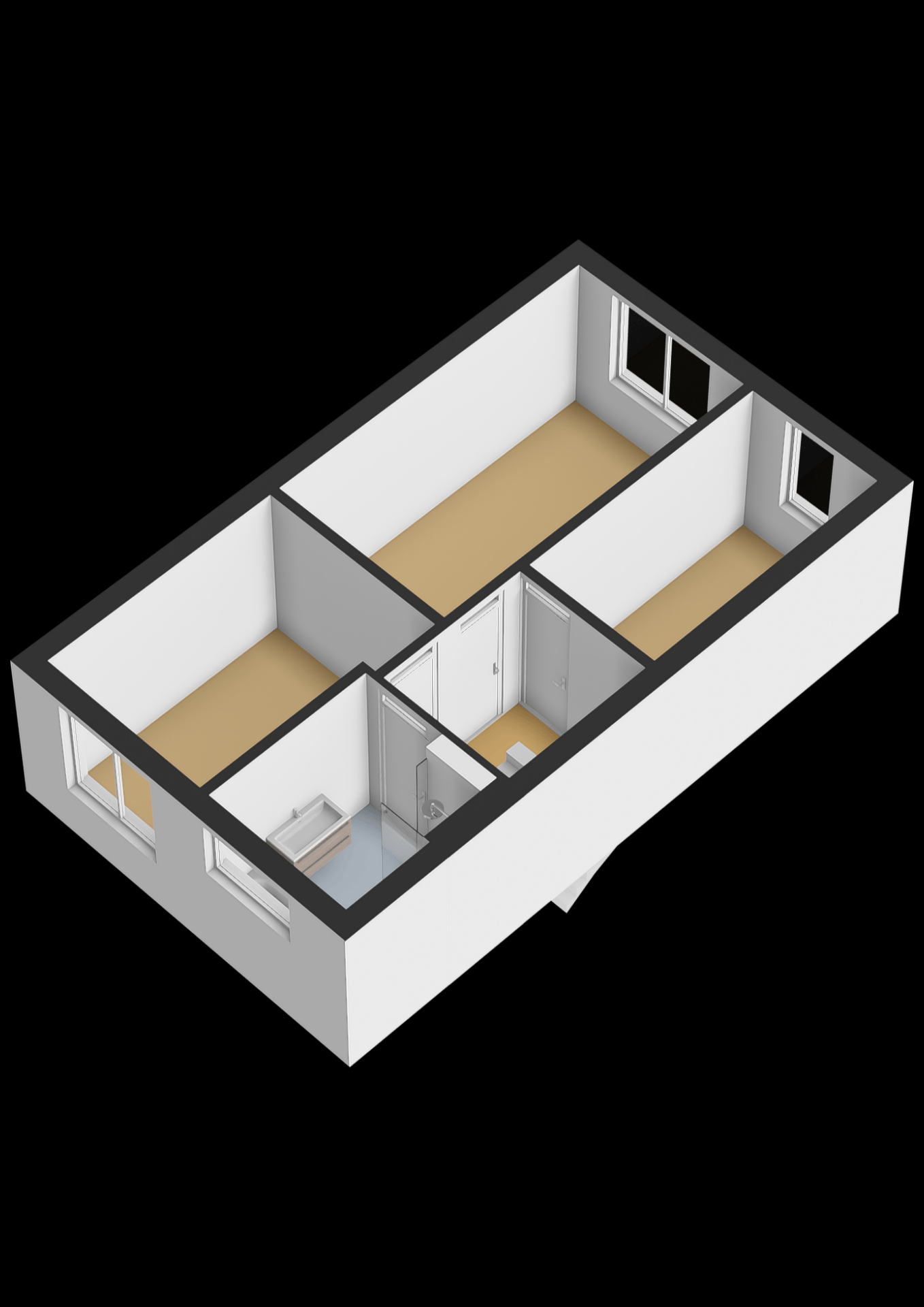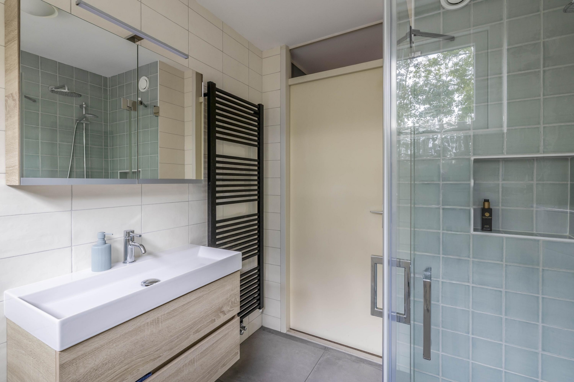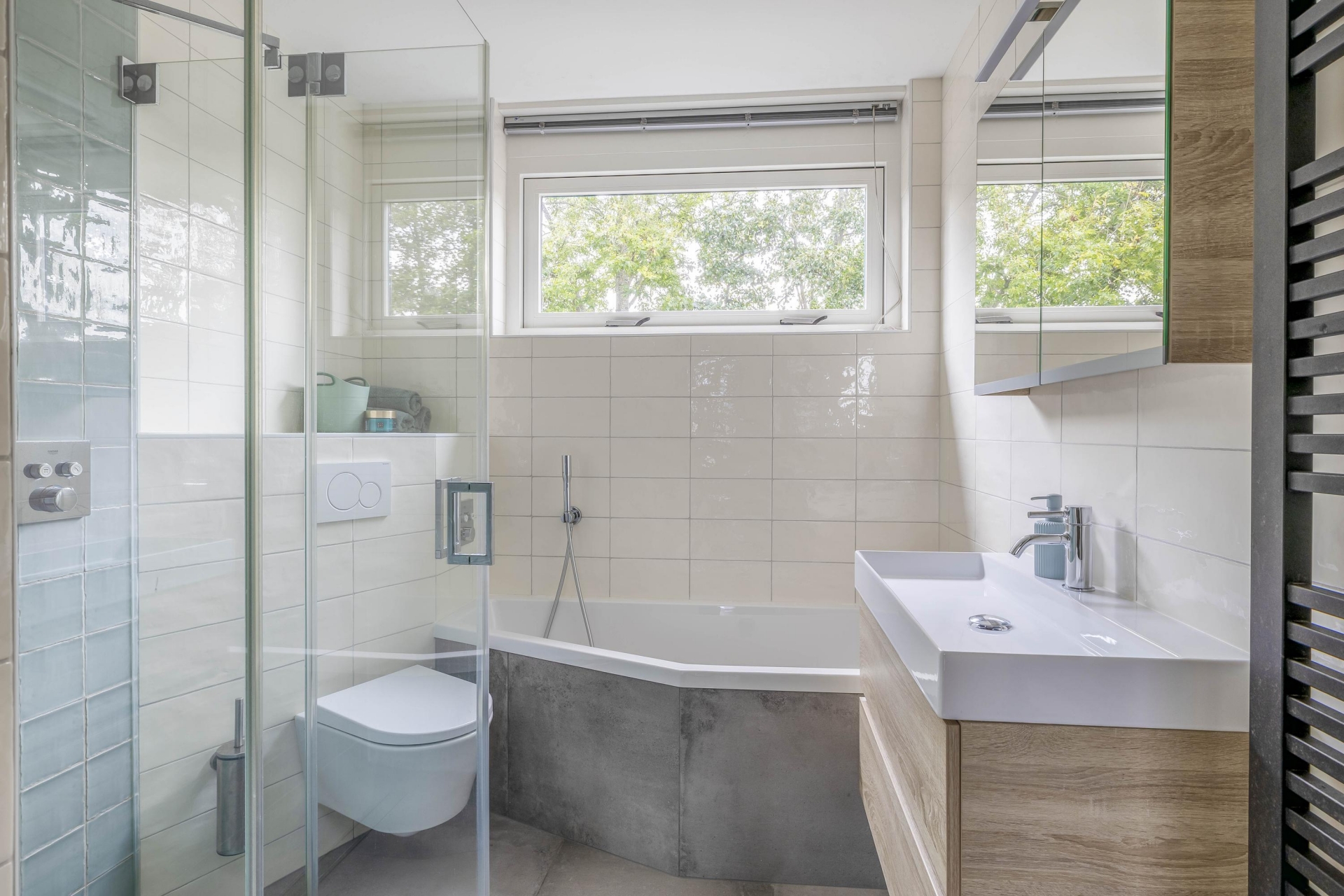 Overloop met toegang tot drie slaapkamers. Aan de achterzijde bevinden zich twee slaapkamers, waaronder de hoofdslaapkamer. De derde, ruime slaapkamer ligt aan de voorzijde. Ook aan de voorzijde ligt de moderne badkamer, uitgerust met inloopdouche, ligbad, wastafelmeubel, tweede toilet en een uitzetraam voor natuurlijke ventilatie.