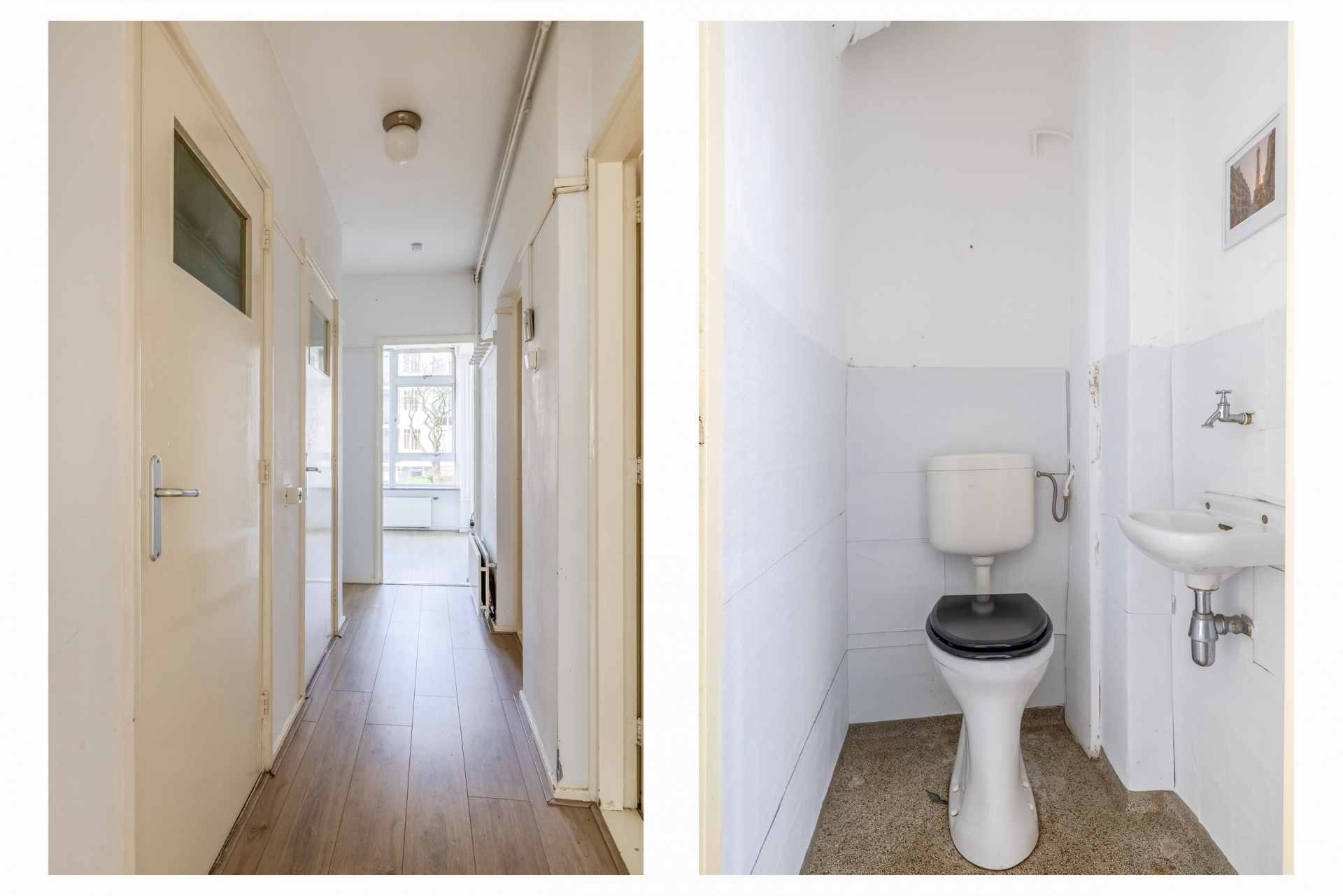 centrale entree; trap naar 1e verdieping: entree/hal, toilet met fontein, badkamer met douche en wastafelmeubel, lichte woonkamer aan de voorzijde, voorzijkamer, welke via een toog met de woonkamer verbonden is. Keuken met eenvoudig blok en toegang naar het achterbalkon; Riante achterslaapkamer en 2e achtergelegen ruime slaapkamer met toegang naar het achterbalkon. In de balkonkast is de CV-installatie geïnstalleerd.