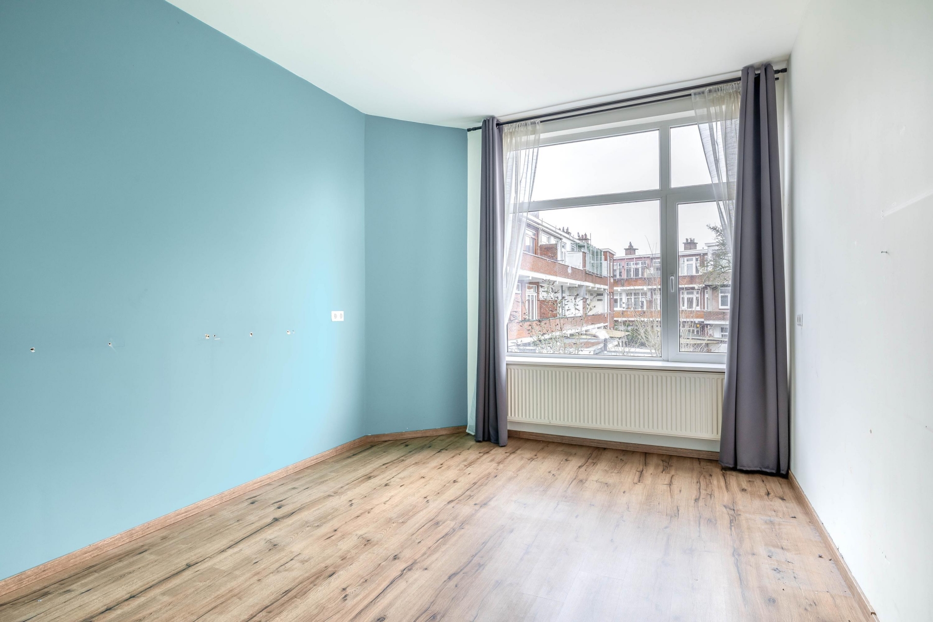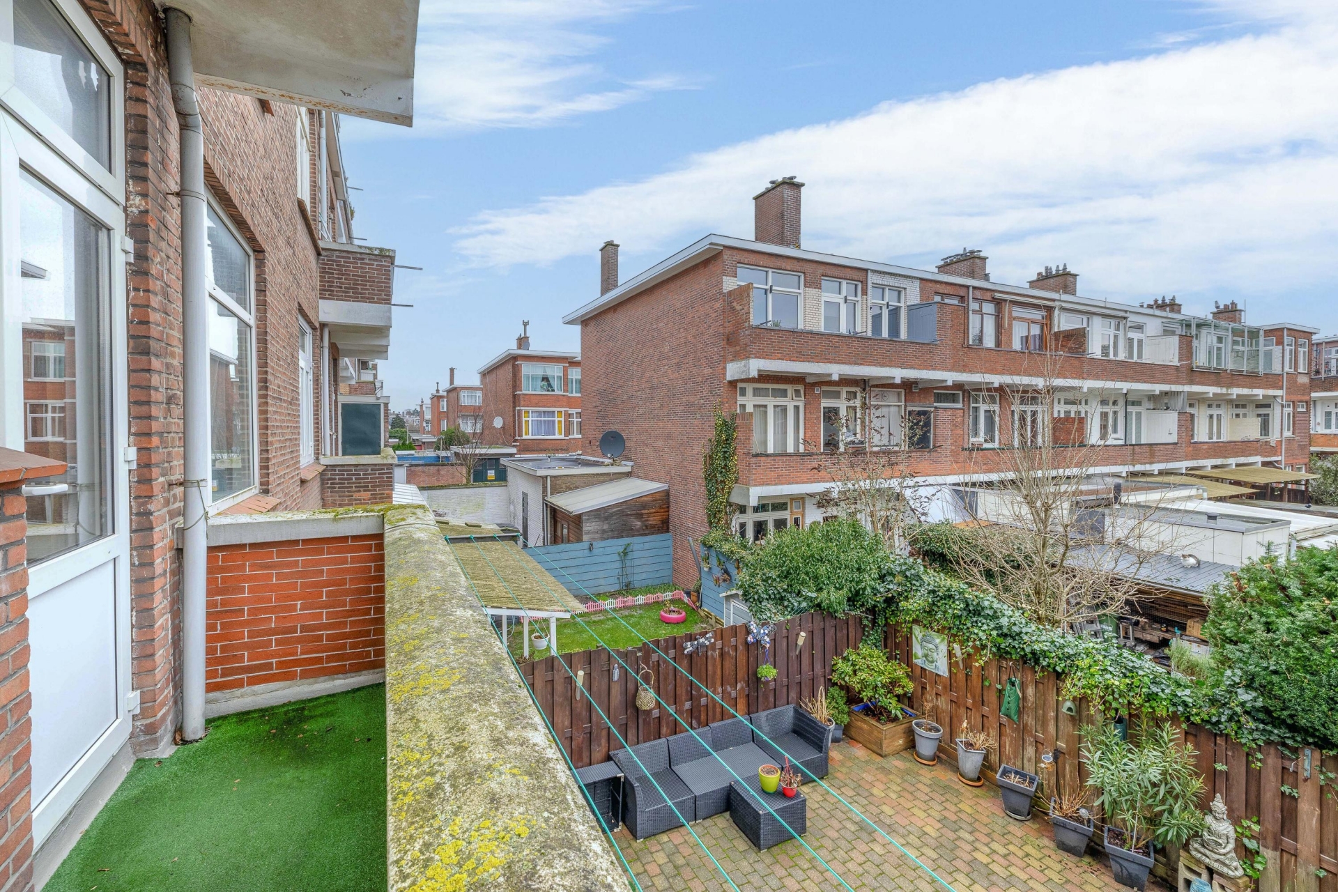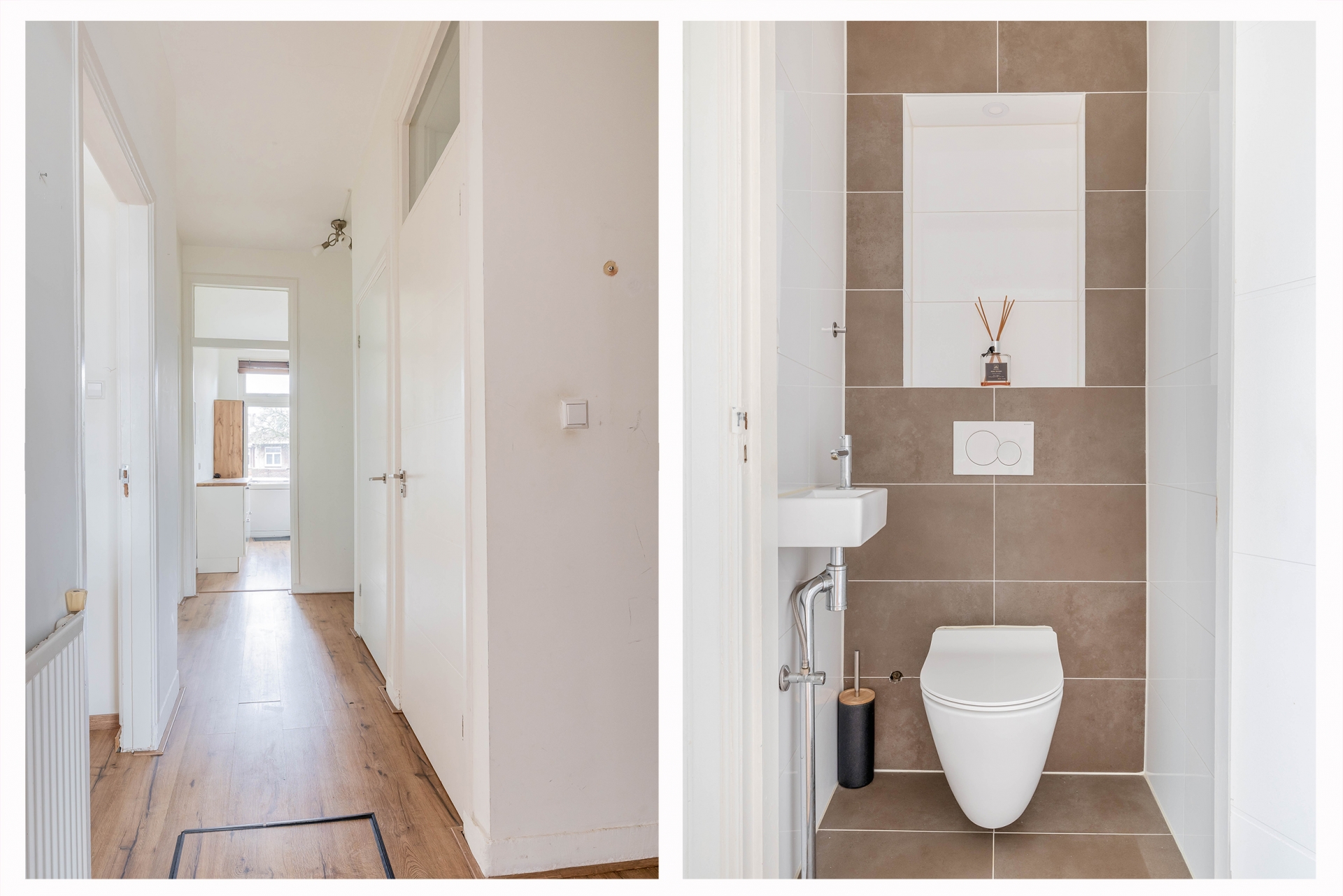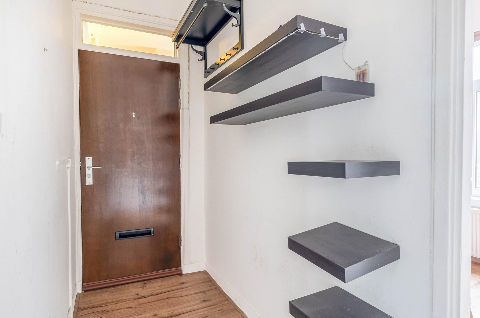 Haags portiek naar de 1e etage; entree woning middels gang, voorzien van kast met aansluiting voor wasmachine en toilet met fontein; slaapkamer aan de voorzijde; woonkamer, voorzien van laminaat; moderne keuken, voorzien van oven, kookplaat, afzuigkap, vaatwasser en opstelplaats voor de c.v.-ketel; achterkamer (nu in gebruik als slaapkamer); slaapkamer aan de achterzijde; doucheruimte, voorzien van inloopdouche en wastafelmeubel; achterbalkon, voorzien van balkonkast.