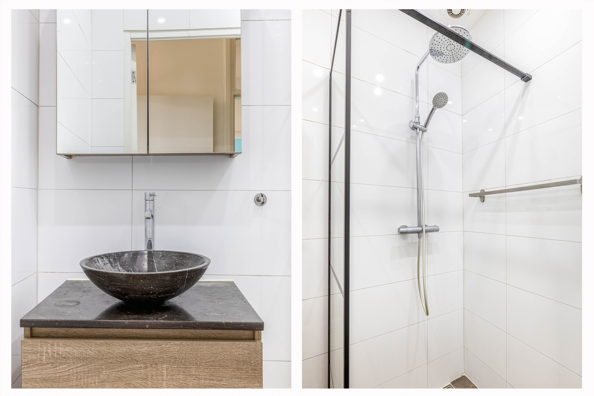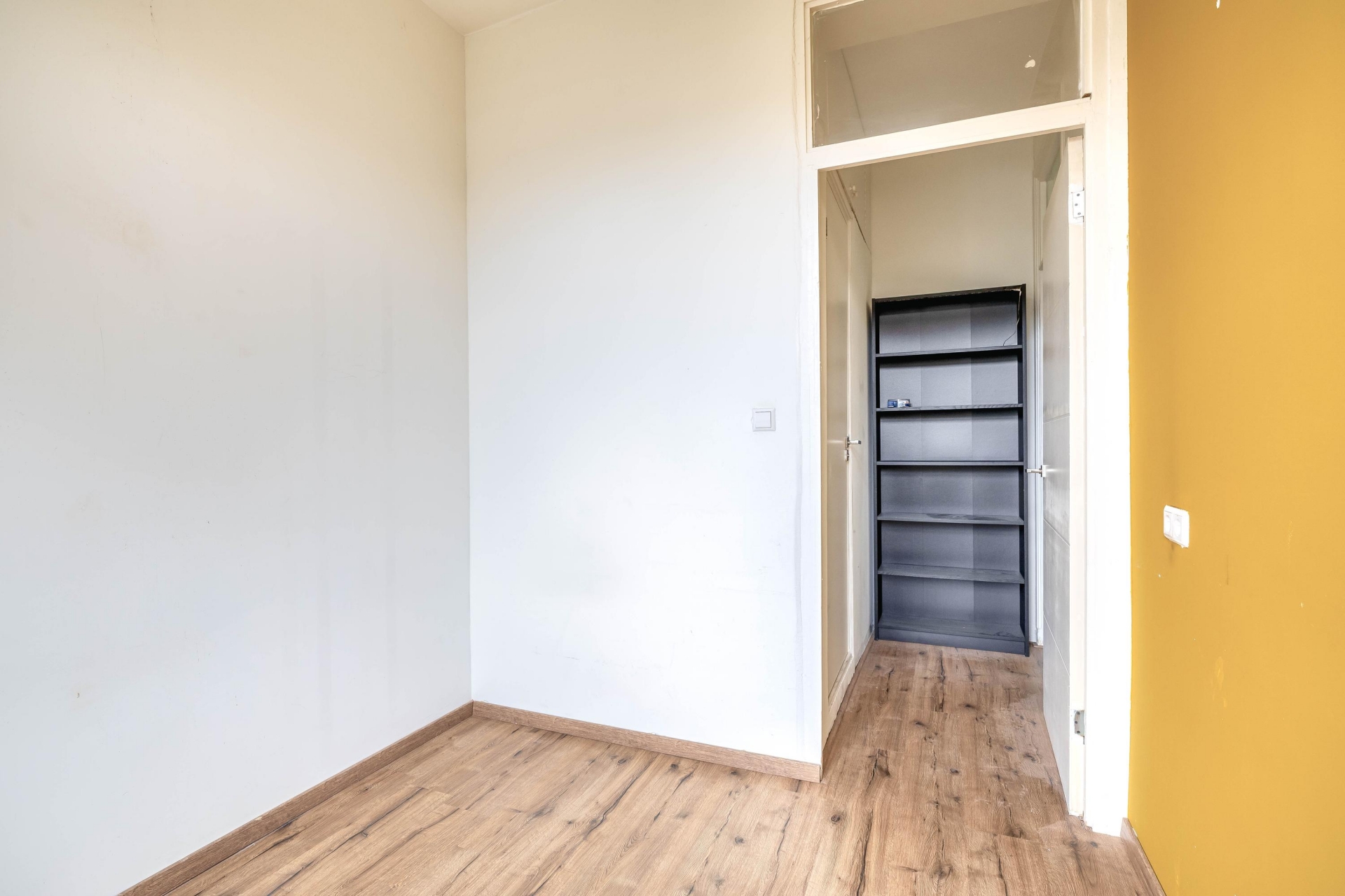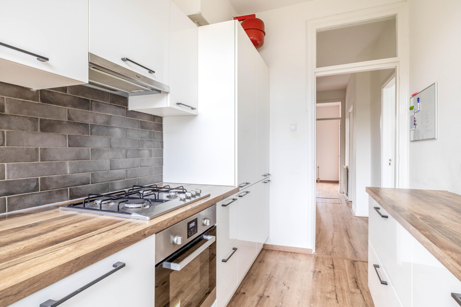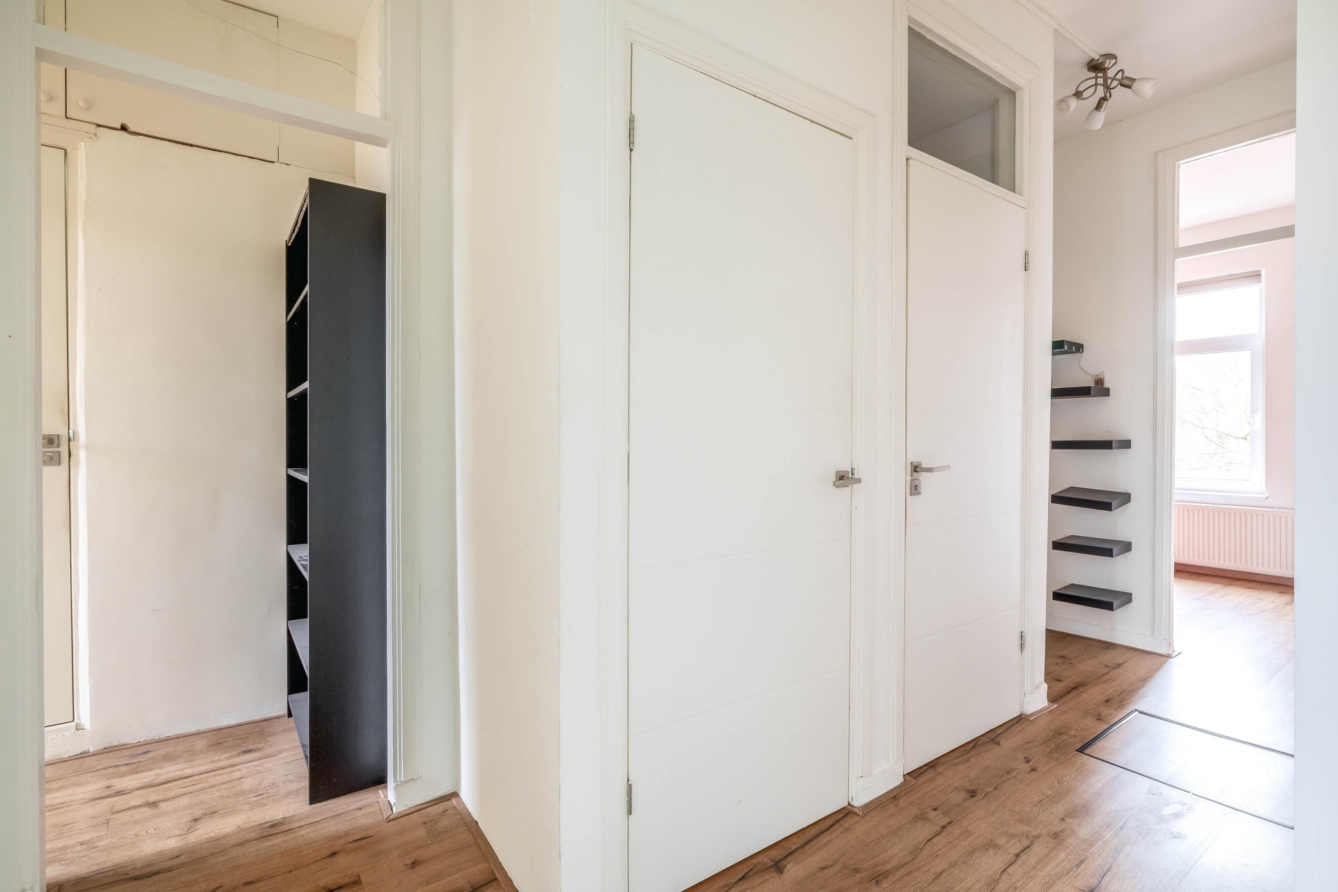Haags portiek naar de 1e etage; entree woning middels gang, voorzien van kast met aansluiting voor wasmachine en toilet met fontein; slaapkamer aan de voorzijde; woonkamer, voorzien van laminaat; moderne keuken, voorzien van oven, kookplaat, afzuigkap, vaatwasser en opstelplaats voor de c.v.-ketel; achterkamer (nu in gebruik als slaapkamer); slaapkamer aan de achterzijde; doucheruimte, voorzien van inloopdouche en wastafelmeubel; achterbalkon, voorzien van balkonkast.