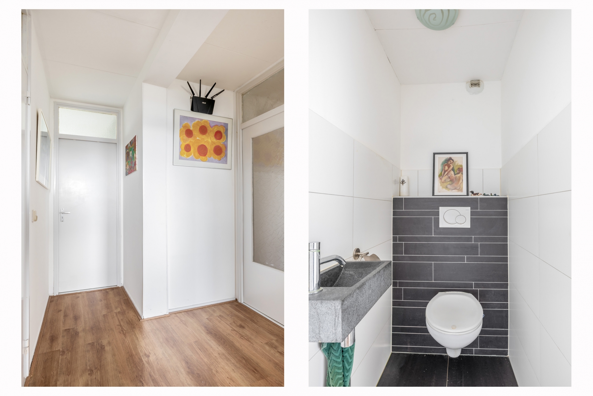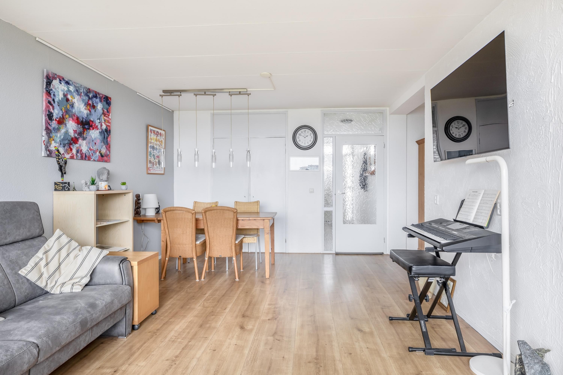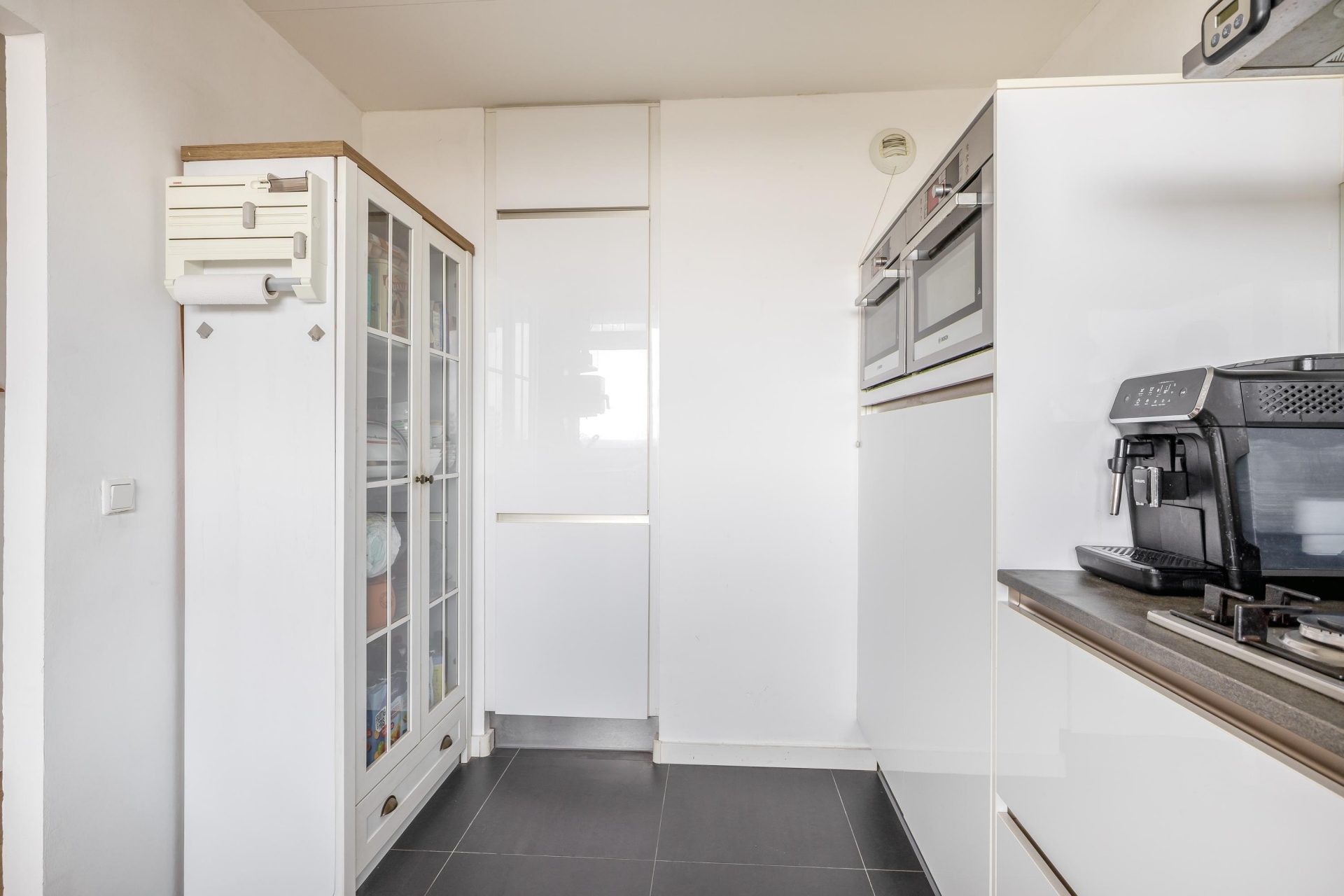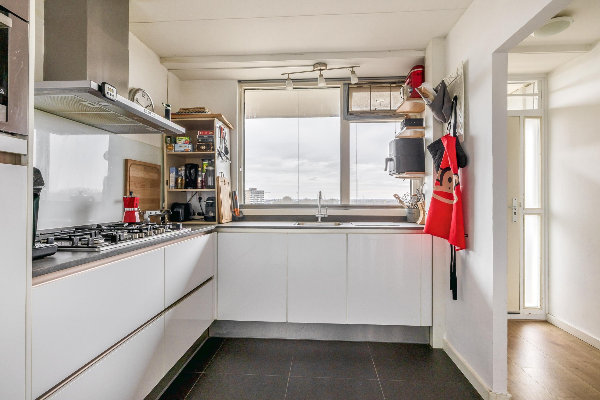 Zodra je de woonkamer binnenstapt, valt direct het licht en het uitzicht op. Door de grote raampartijen kijk je vanaf de negende verdieping vrij weg over Zoetermeer, wat zorgt voor een prettig en ruimtelijk gevoel. De woonkamer biedt volop plek voor zowel een gezellige zithoek als een ruime eettafel. Of je nu rustig wilt ontspannen na een lange dag of vrienden over de vloer hebt, dit is een fijne plek om samen te komen. Vanuit de woonkamer heb je via een kleine hal toegang tot het balkon, gelegen op het noordwesten. Hier geniet je in de middag en avond van de zon, met als extra bonus het weidse uitzicht.