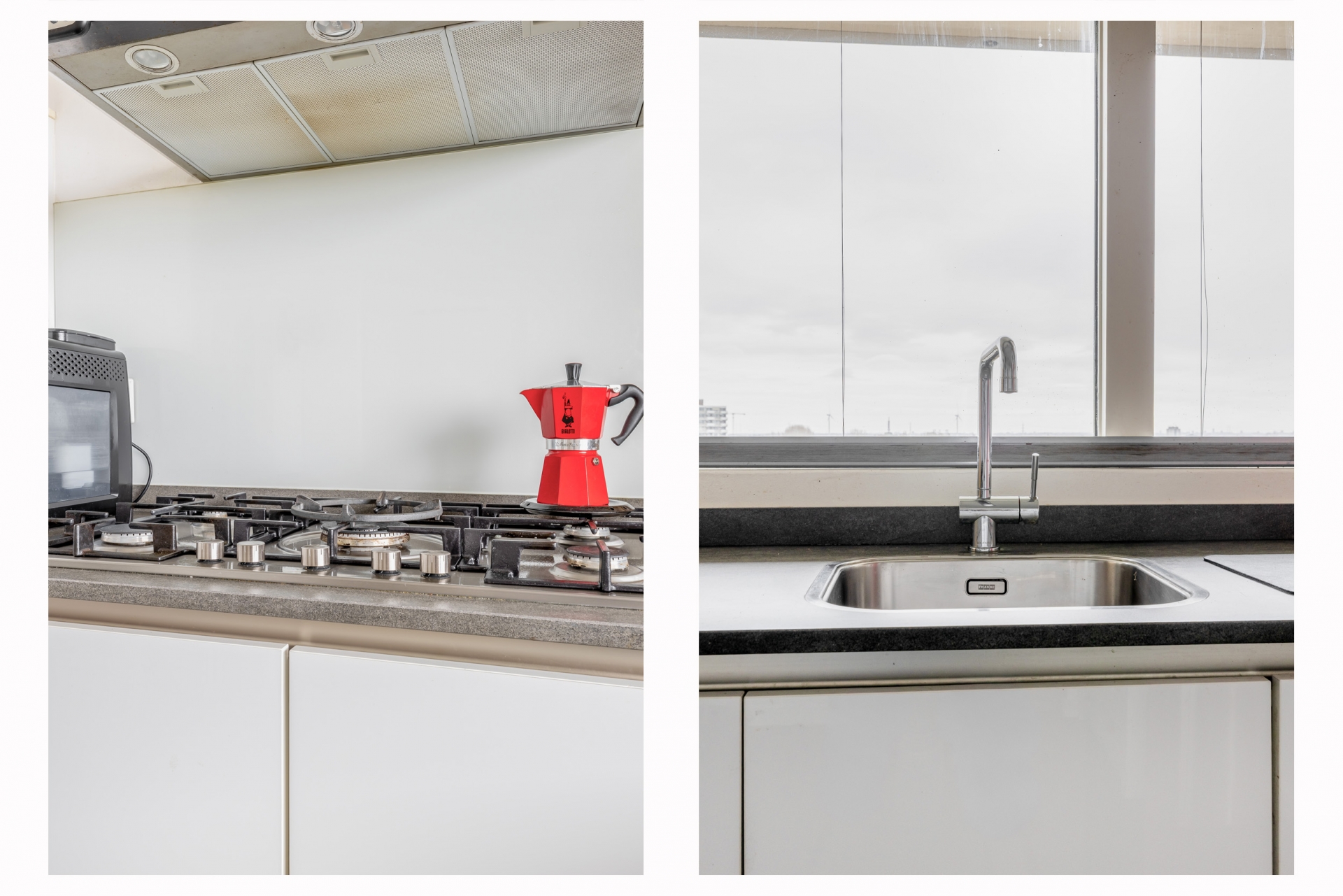 De keuken is uitgevoerd in een strakke, hoogglans witte opstelling en is praktisch ingericht. Je beschikt hier over diverse inbouwapparatuur zoals een gaskookplaat, afzuigkap, oven, magnetron, koelkast, vriezer, vaatwasser en wasmachine. Daarnaast zitten er keukenkastjes in met een zeer efficiënte bergruimte. Alles wat je nodig hebt om uitgebreid te koken of juist snel iets op tafel te zetten.