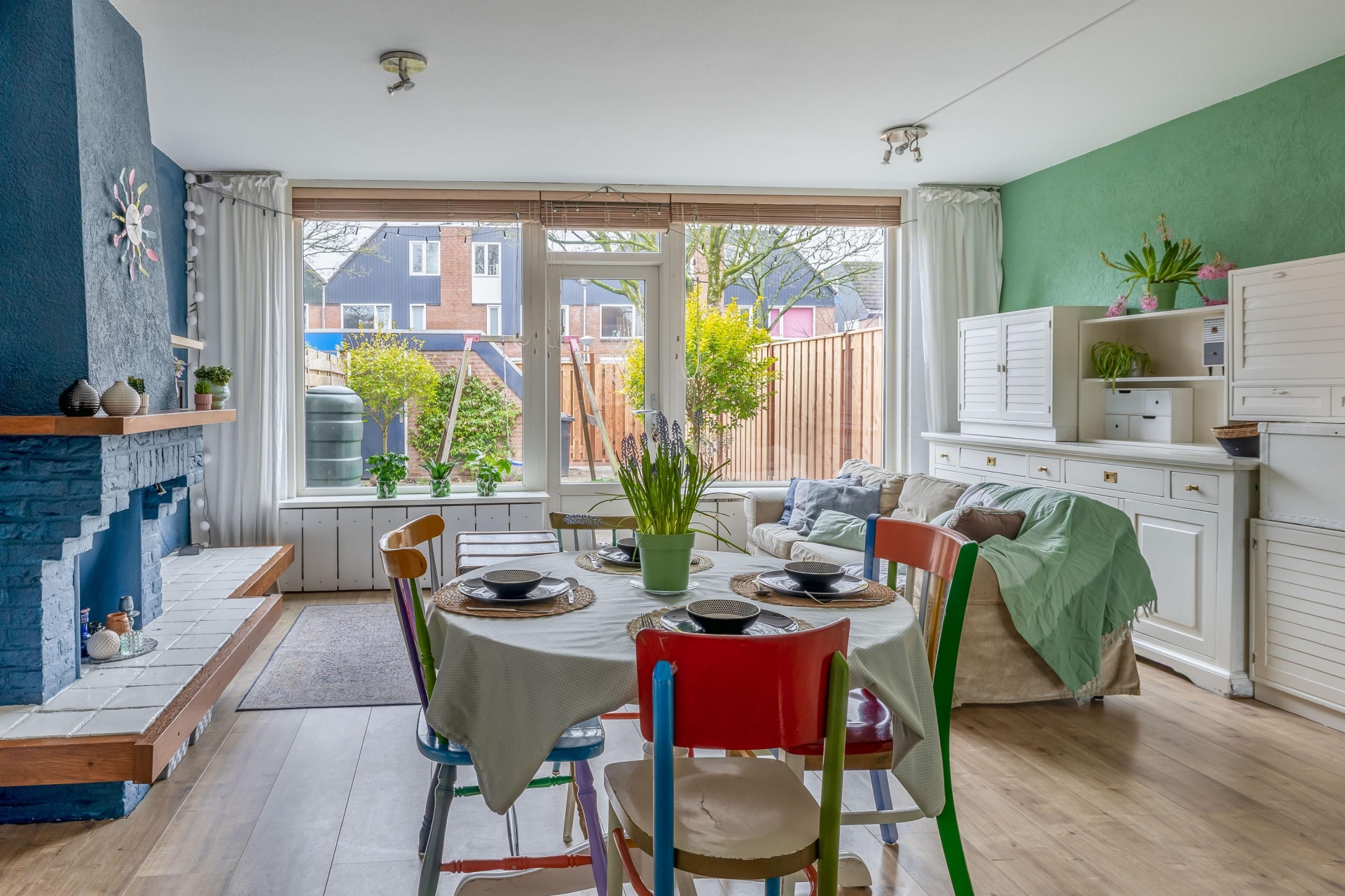 De woonkamer is tuingericht en dankzij de grote raampartij en deur naar buiten valt er veel daglicht binnen. Vanuit de zithoek kijk je zo de achtertuin in, wat zorgt voor een prettige, open sfeer.