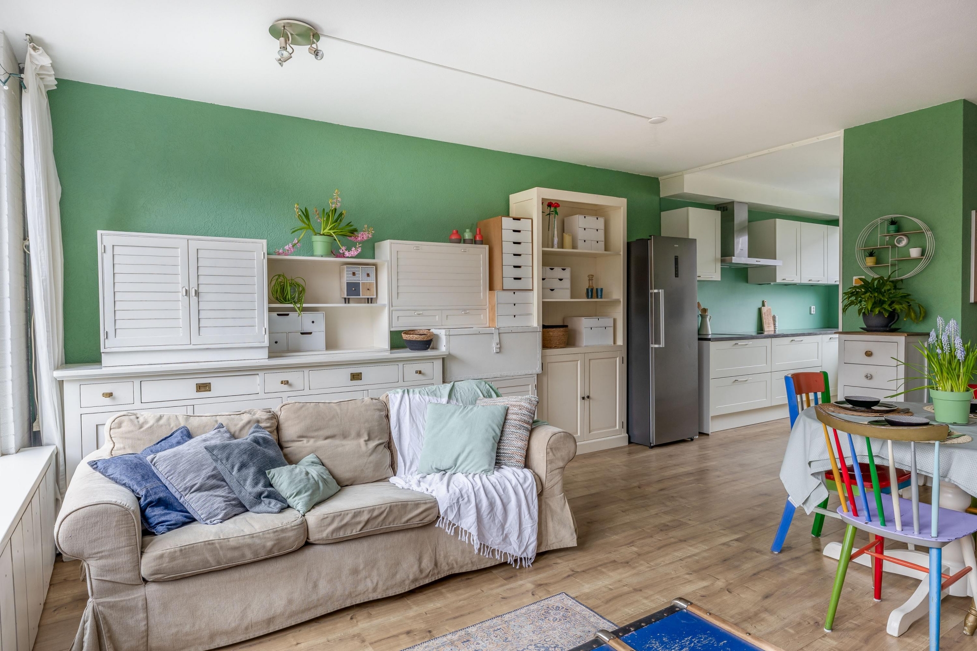 Er is volop ruimte voor een royale zithoek en een grote eettafel. De basis is netjes en verzorgd. Wil je een andere kleur op de muur of de binnendeuren moderniseren? Dan kun je hier met relatief eenvoudige ingrepen een heel eigentijdse uitstraling creëren.