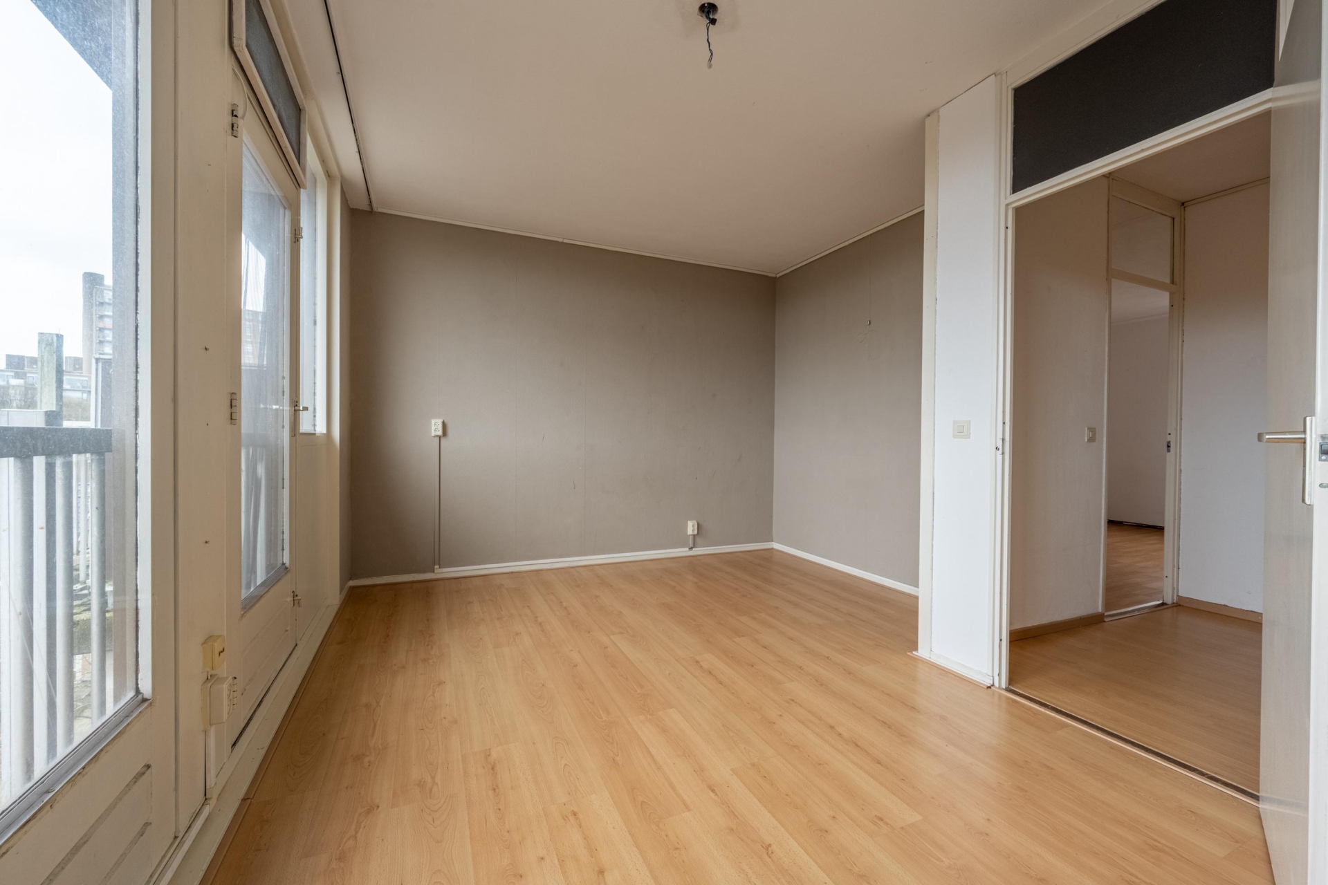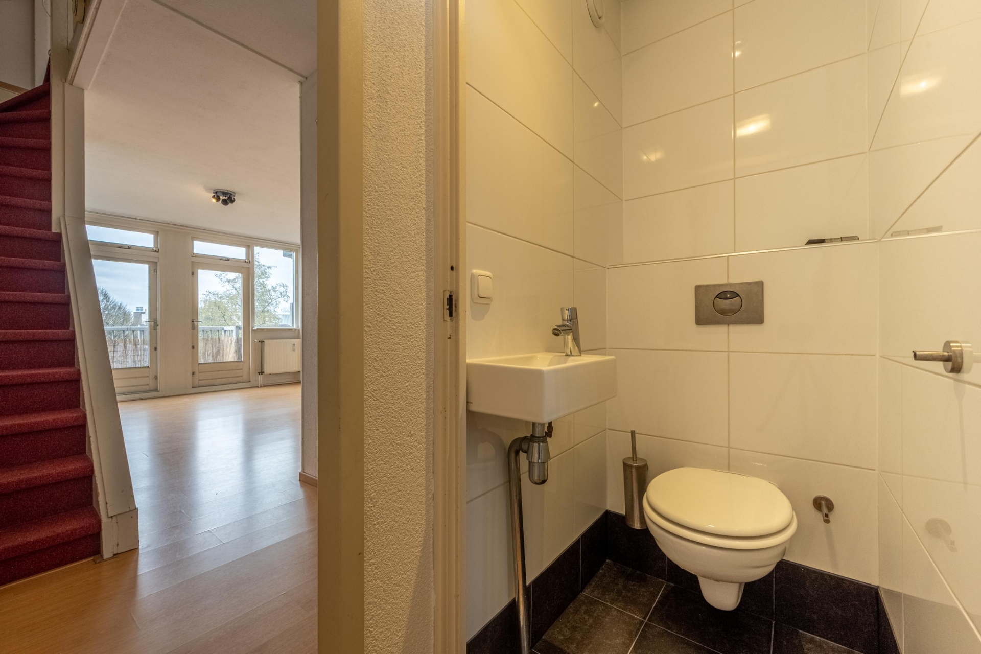 De begane grond begint met een nette entree en een modern toilet. Vanuit hier stap je de lichte en ruime woonkamer binnen, waar je meteen de ruimte en het daglicht opmerkt. Dankzij de brede raampartijen en de dubbele deuren naar het balkon voelt deze verdieping extra ruim aan. Op het balkon kun je lekker buiten zitten met een kop koffie of een goed boek.