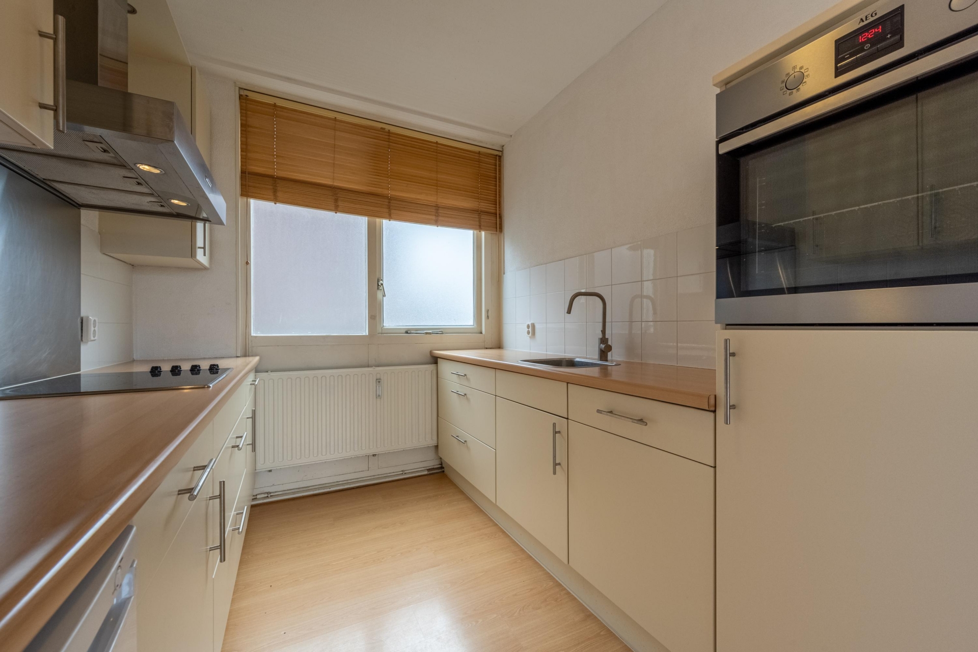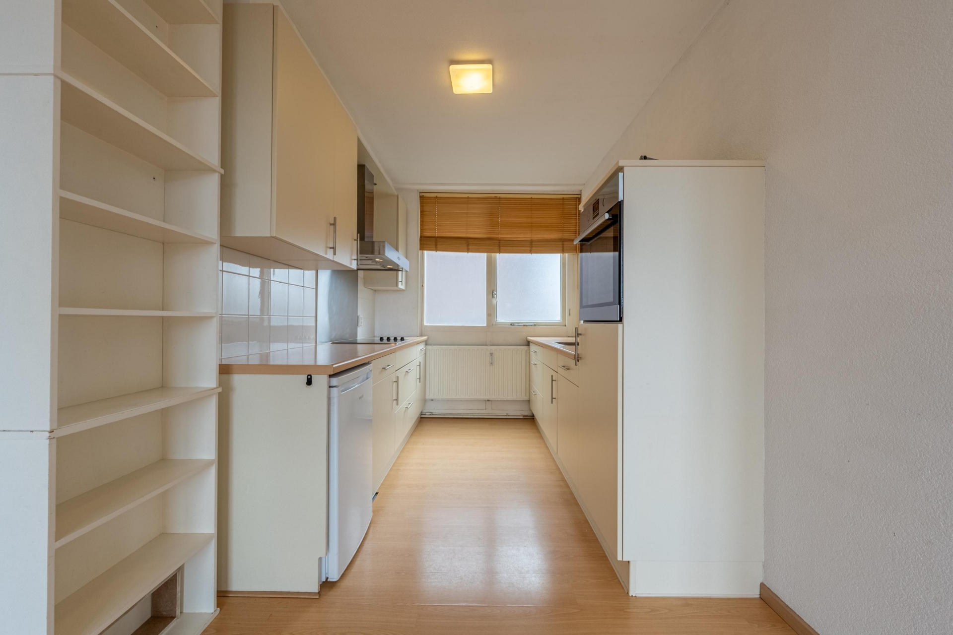 De open keuken aan de voorzijde heeft een efficiënte opstelling en is voorzien van diverse inbouwapparatuur: onder meer een keramische kookplaat, vaatwasser, koelkast en oven. Dankzij de ruime indeling kun je hier prima koken én tegelijk onderdeel blijven van het gezelschap in de woonkamer. Onder de trap is een handige bergkast voor je voorraad of stofzuiger.