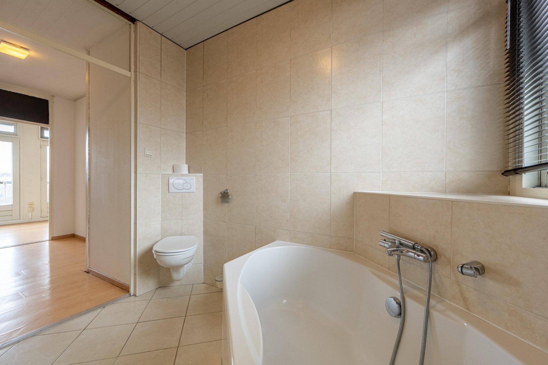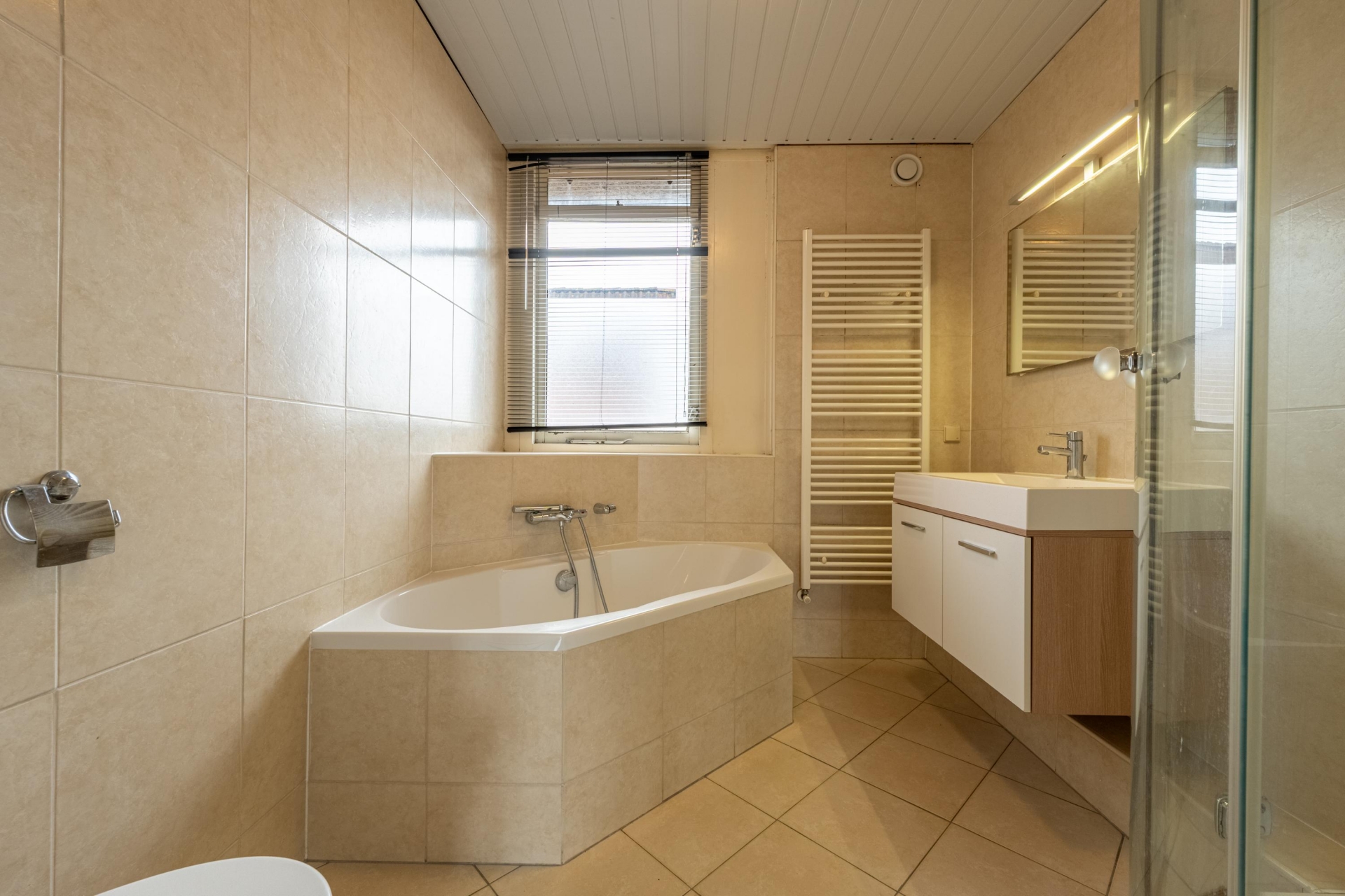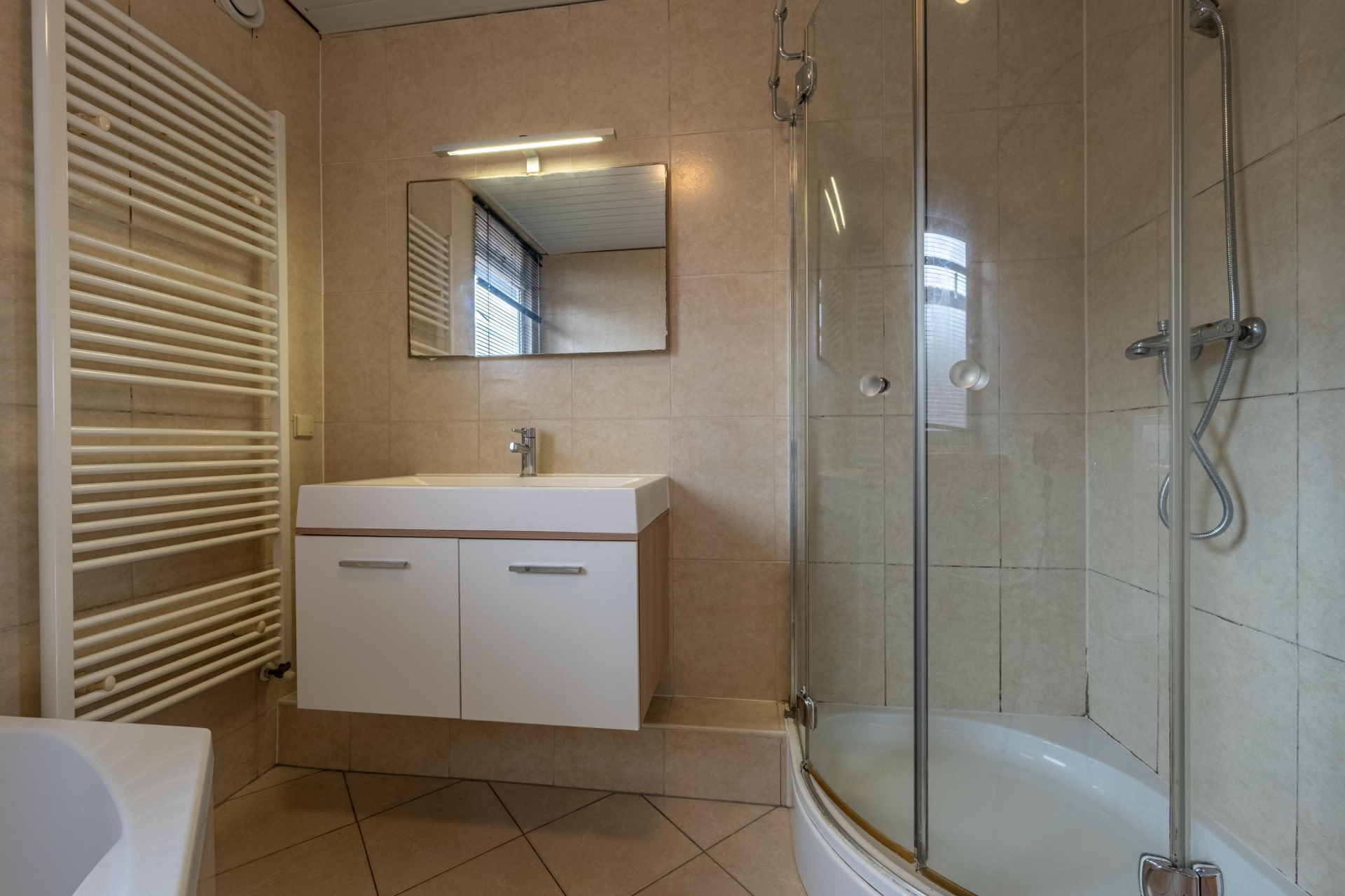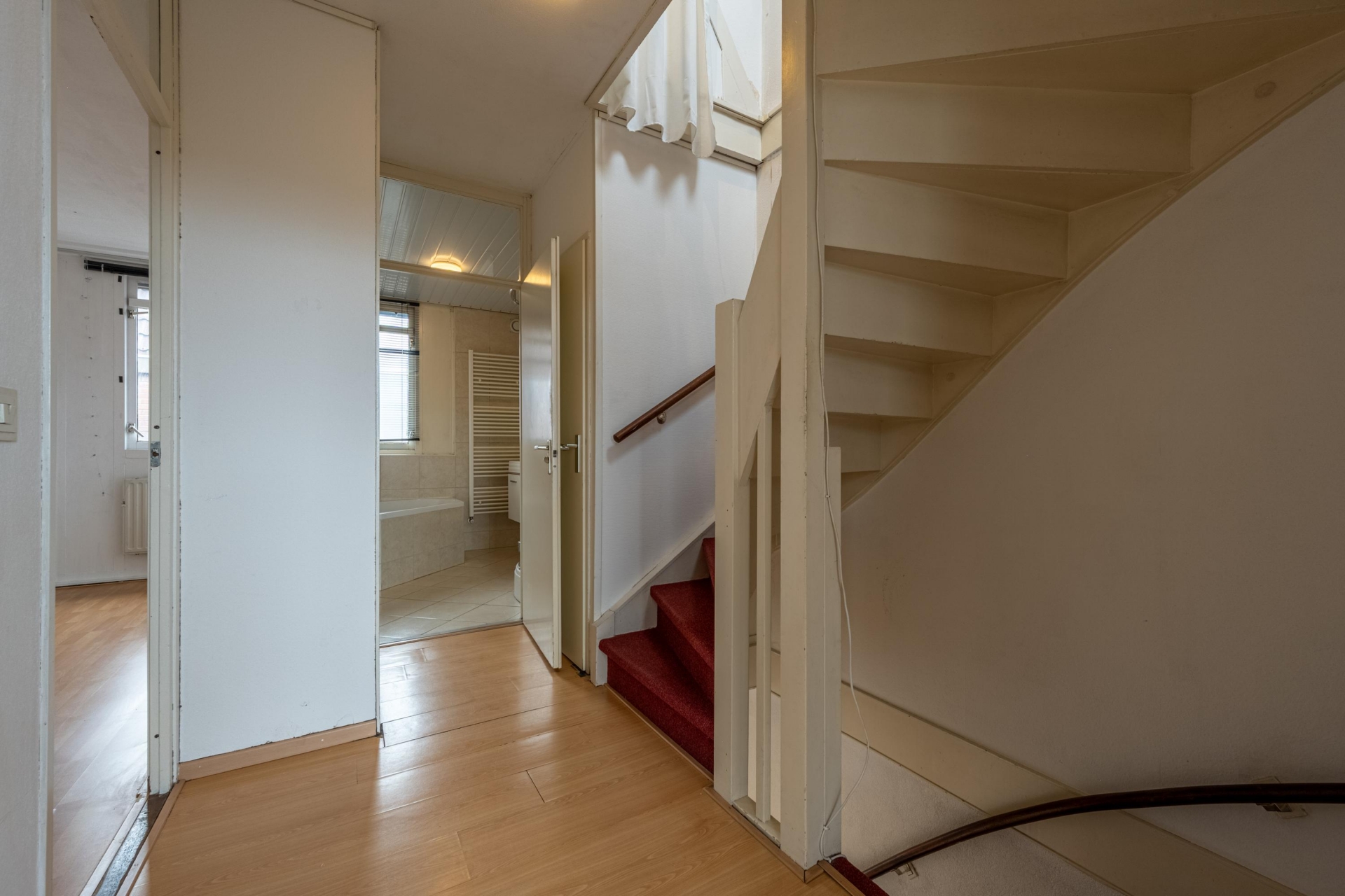 Op de eerste verdieping vind je twee ruime slaapkamers. De grootste ligt aan de achterzijde en heeft een Frans balkon voor extra licht en lucht. De tweede kamer is eveneens van goed formaat en multifunctioneel inzetbaar: kinderkamer, werkplek of logeerkamer; het past allemaal. De badkamer is royaal en compleet: een inloopdouche, ligbad, tweede toilet, wastafelmeubel én een designradiator.