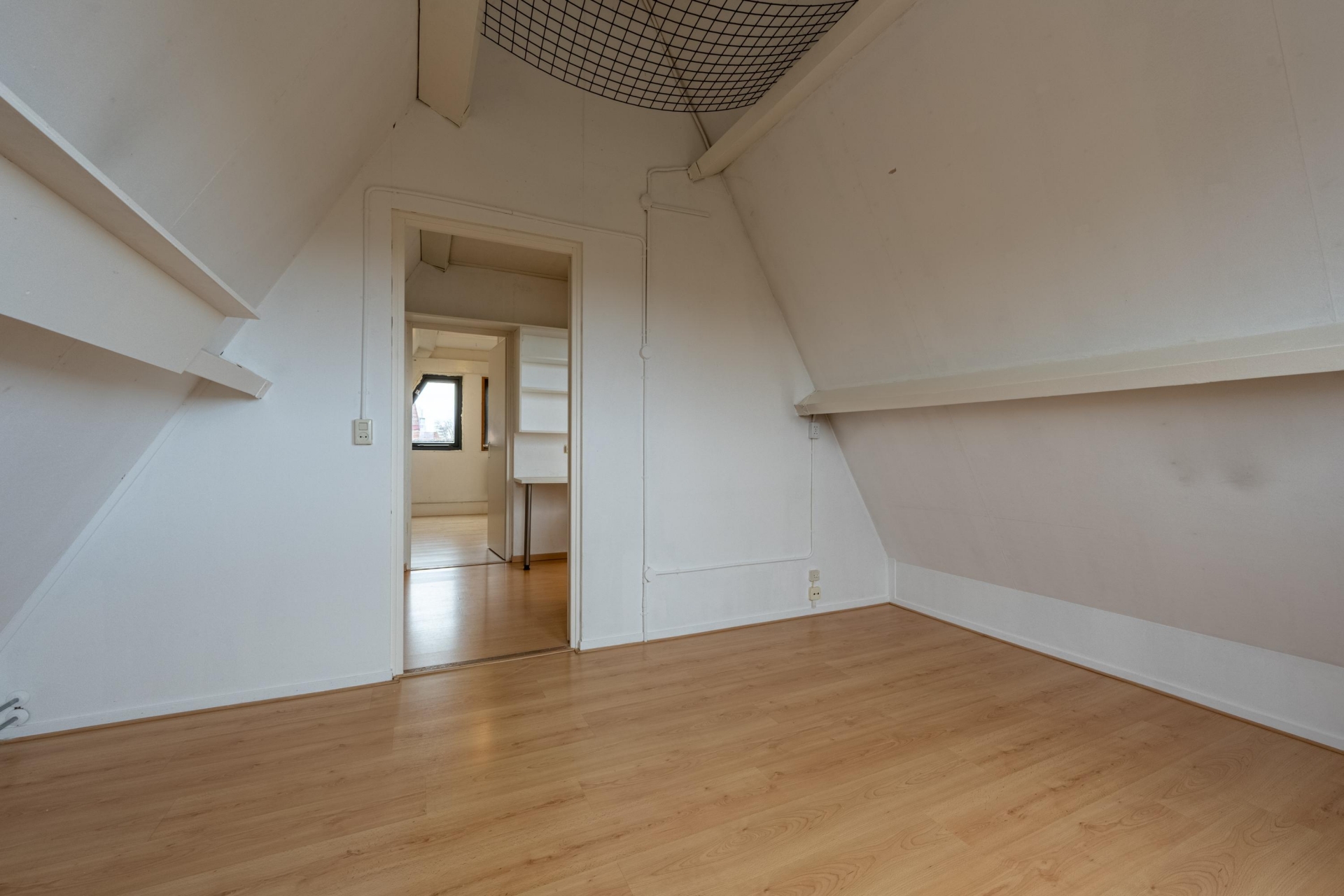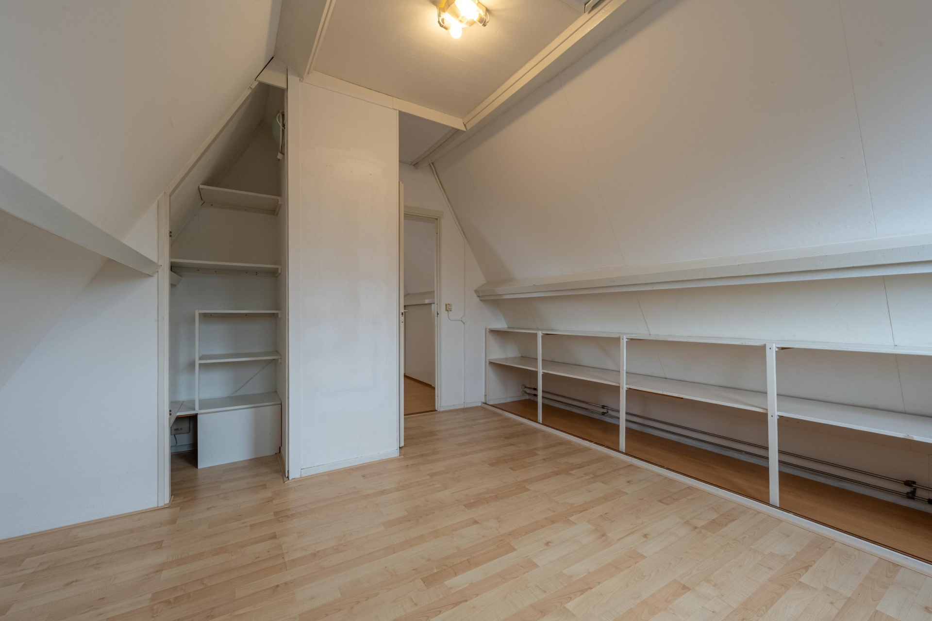 De tweede verdieping verrast met nog twee slaapkamers. De slaapkamer aan de voorzijde heeft een indrukwekkend hoge nok, wat zorgt voor een uniek ruimtelijk gevoel. De andere slaapkamer aan de achterzijde heeft toegang tot een vliering – ideaal voor koffers, kerstspullen of extra opbergruimte.