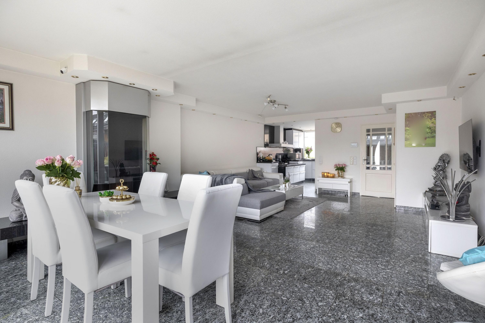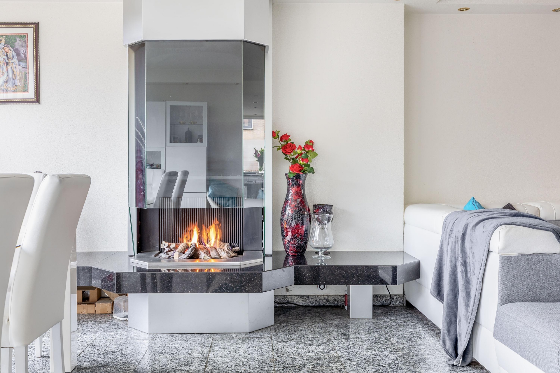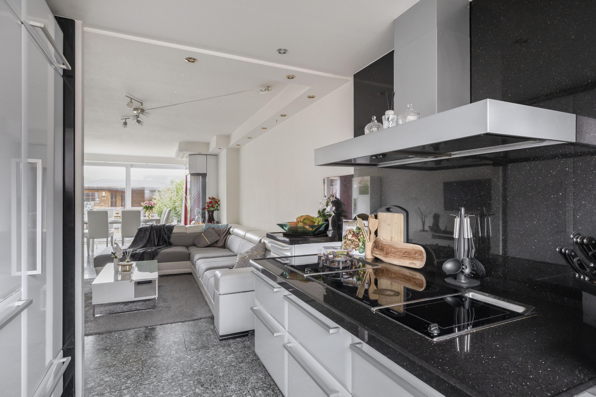 In de entreehal en living ligt een doorlopende natuurstenen granieten vloer met vloerverwarming. Rondom de Boley gashaard is hetzelfde graniet gebruikt voor een mooie en brede schouw wat enerzijds voor meer karakter en sfeer zorgt en anderzijds volledig in lijn is met de stijl in de keuken.