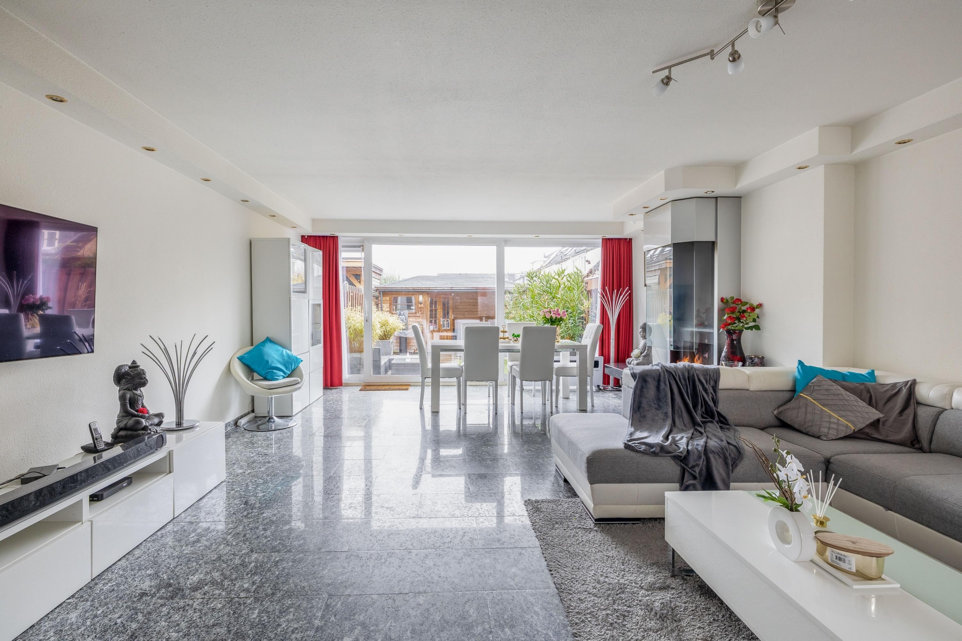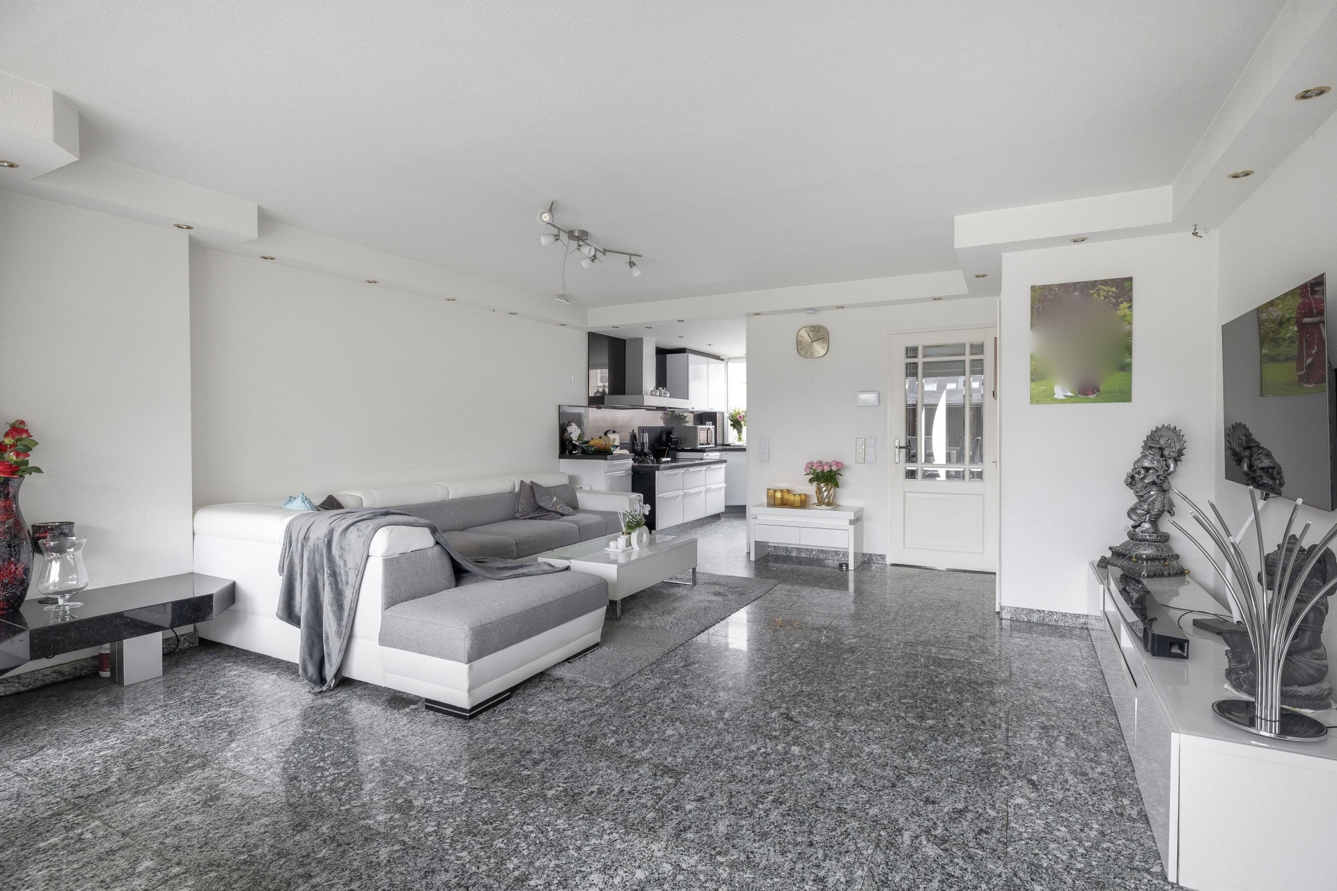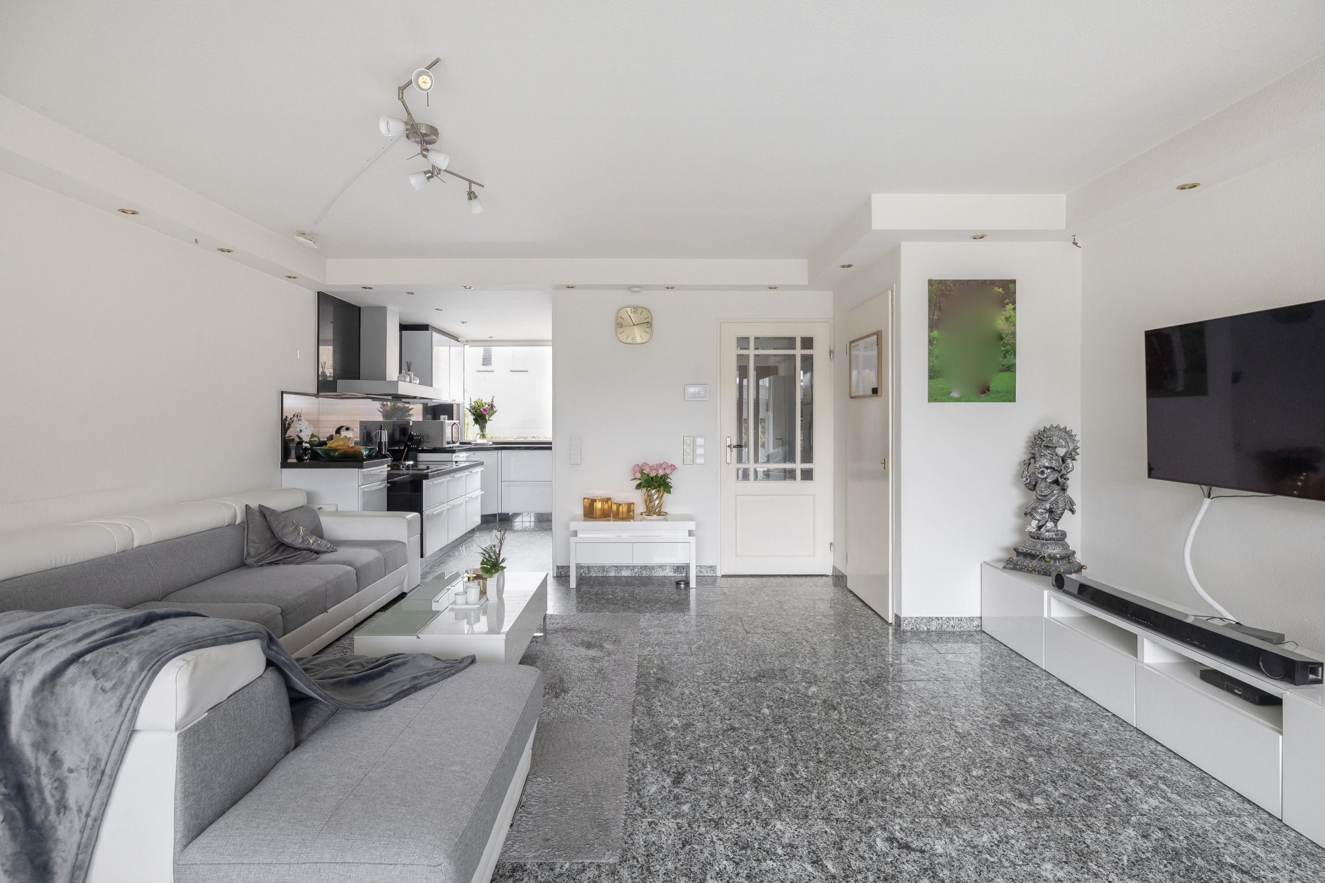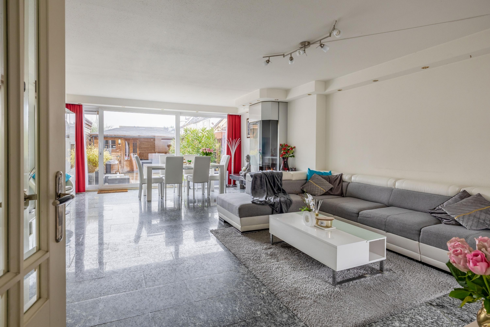 In de entreehal en living ligt een doorlopende natuurstenen granieten vloer met vloerverwarming. Rondom de Boley gashaard is hetzelfde graniet gebruikt voor een mooie en brede schouw wat enerzijds voor meer karakter en sfeer zorgt en anderzijds volledig in lijn is met de stijl in de keuken.