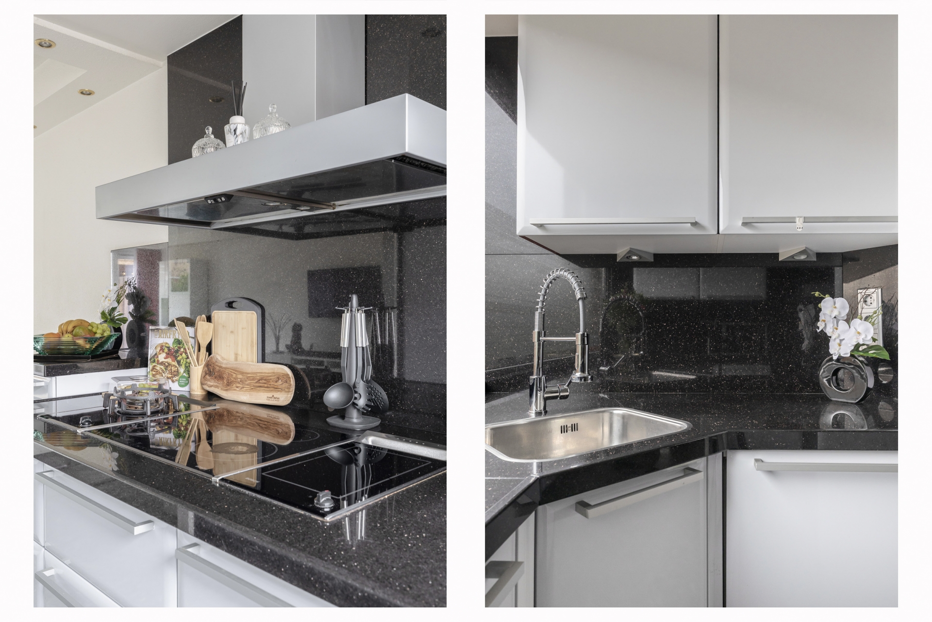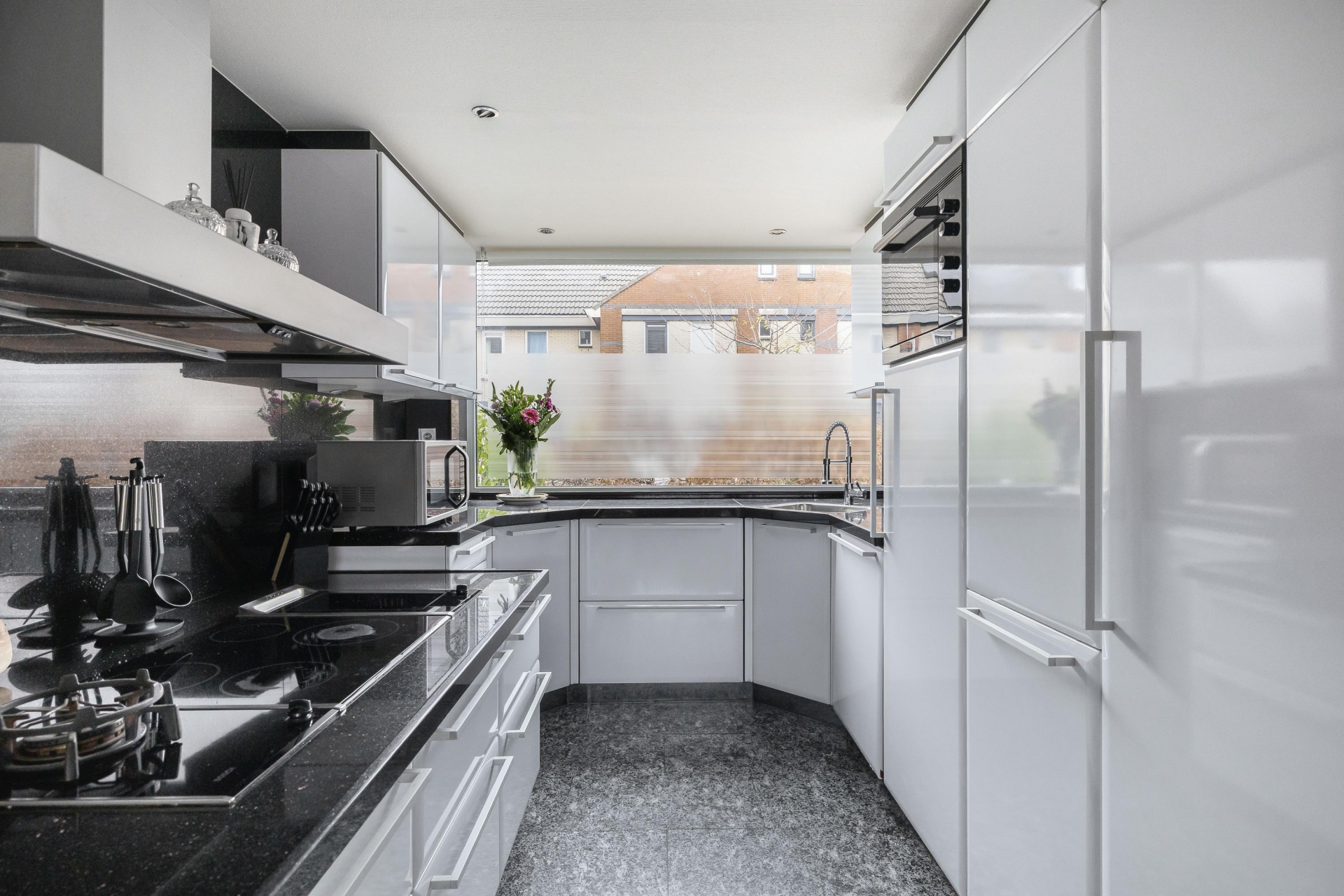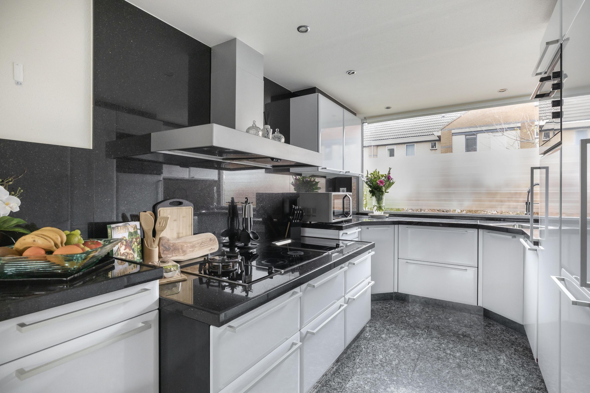 De keuken is van het merk Eggersman en is oorspronkelijk in de kleur hoogglans bordeauxrood, maar voor een meer ruimtelijke, tijdloze en neutrale look, is de keuken in 2018 gewrapt in de kleur hoogglans wit. De keuken is in U opstelling geplaatst. In de keuken bevinden zich een ruime apothekerskast, koelkast, grote vriezer, vaatwasser, inductie kookplaat, wokbrander, extra keramische kookplaat, afzuigkap, draaicarrousel en granieten aanrechtblad.
