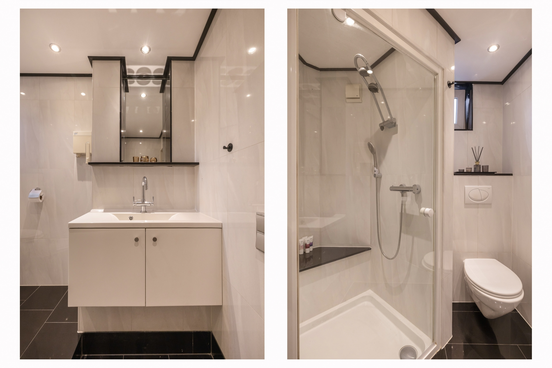 Op de eerste etage treffen we vanaf de overloop 3 slaapkamers aan: twee slaapkamers (8m² & 10m²) aan de achterzijde (tuinzijde) en een slaapkamer (13m²) met inbouwkast aan de voorzijde. Naast de slaapkamer aan de voorzijde bevindt zich ook de badkamer. Deze luxe en lichte badkamer is geheel betegeld met natuurstenen tegels en voorzien van inbouwspots, vloerverwarming, een wand closet, wastafelmeubel en een fraaie ingebouwde doucheruimte met daarin verwarmd zitplateau. De wandcloset is gemaakt van hetzelfde graniet als gebruikt in de keuken en de woonkamer (schouw). Over de gehele eerste etage ligt, met uitzondering van de badkamer, een fraaie doorlopende laminaat vloer.