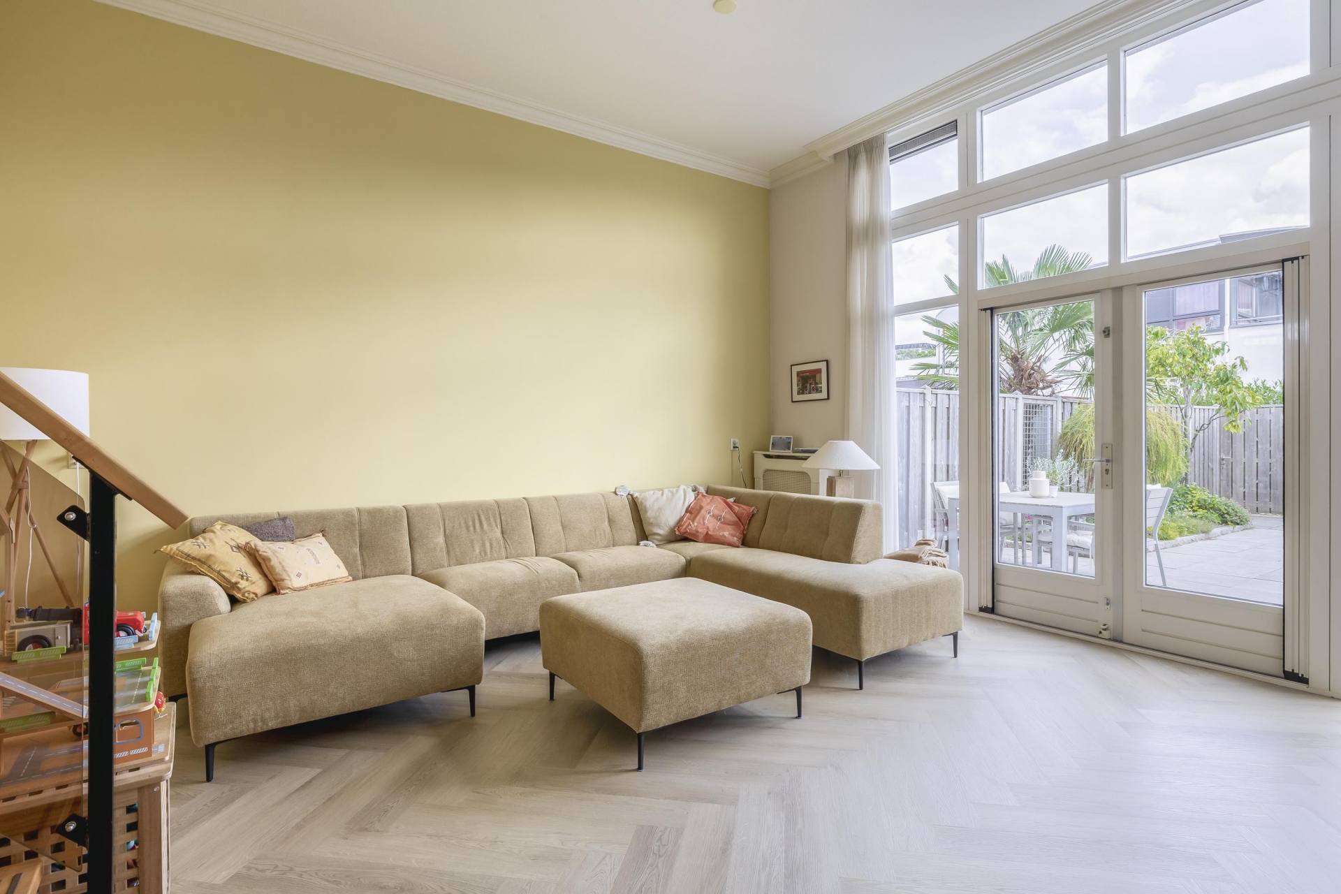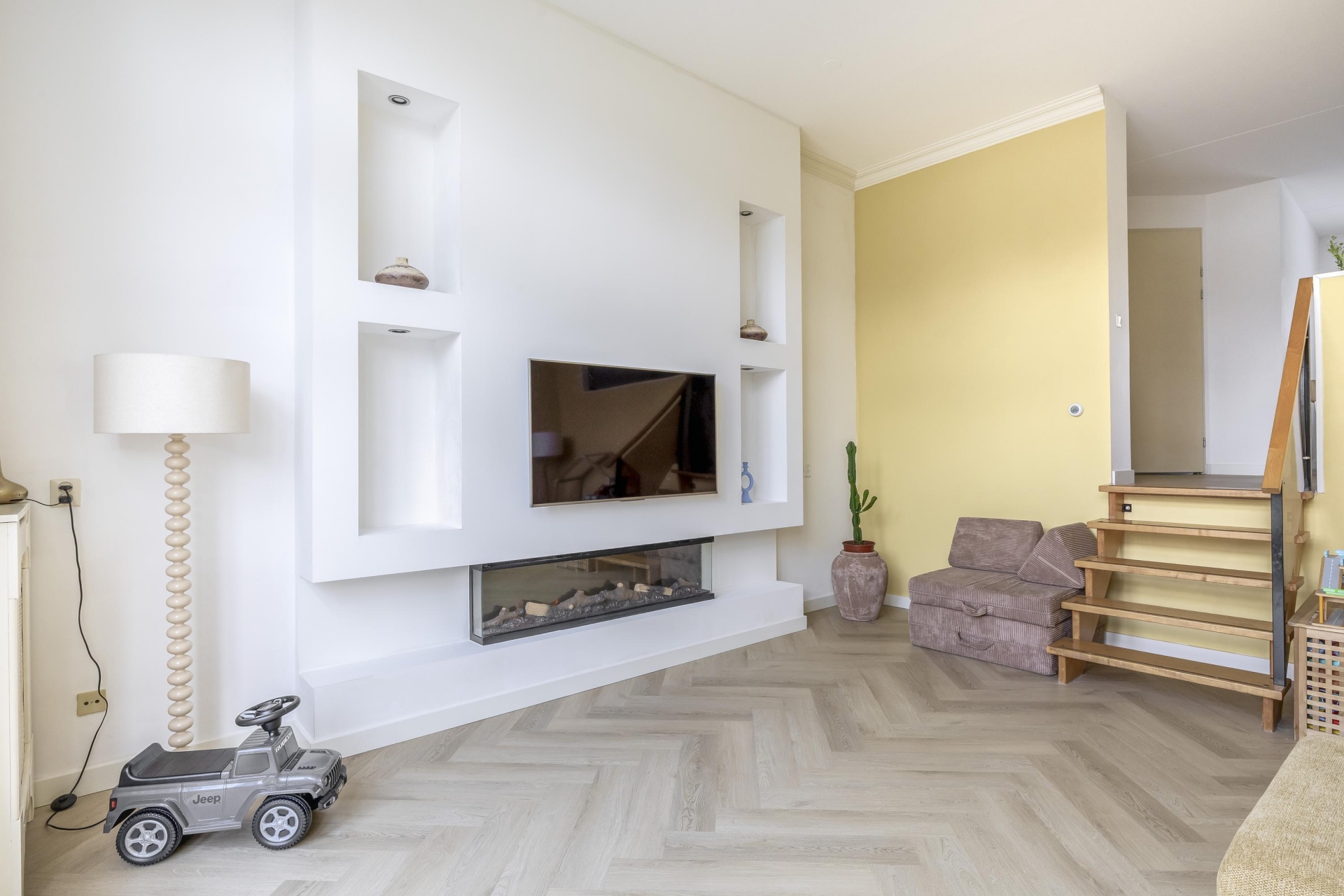 Wat meteen opvalt zodra je binnenkomt, is de unieke indeling. De woonkamer ligt verdiept ten opzichte van de keuken, waardoor je niet alleen extra hoogte ervaart, maar ook een fantastisch zicht naar buiten hebt. De grote raampartijen laten het daglicht rijkelijk binnenstromen, en de openslaande deuren verbinden binnen moeiteloos met buiten. De woonkamer voelt warm en uitnodigend aan en biedt voldoende plek voor een royale zithoek.