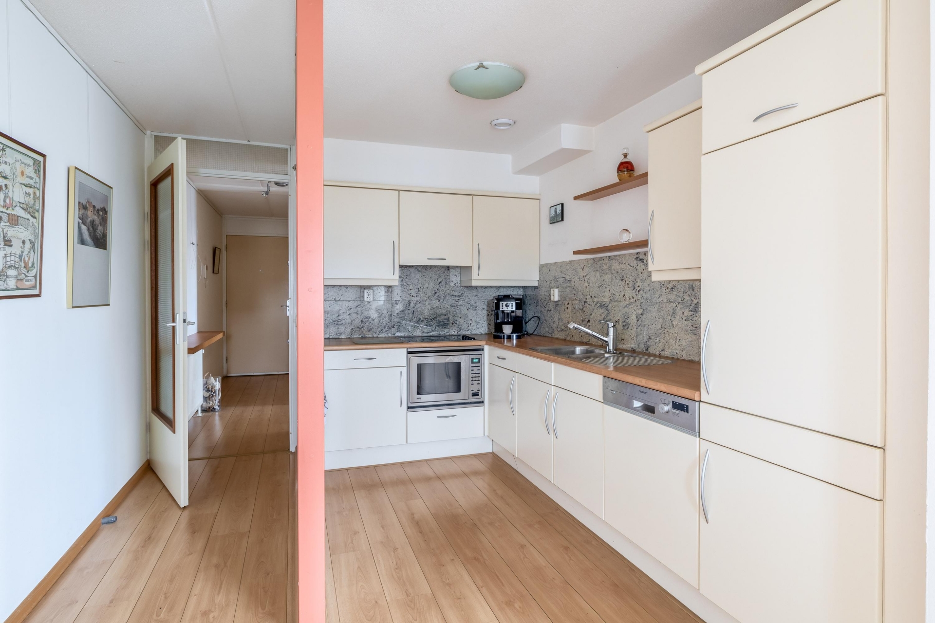 Bij binnenkomst van het appartement treft u een ruime hal met toegang tot diverse vertrekken. Aan het einde van de hal komt u uit in de ruime woonkamer met halfopen keuken. De keuken beschikt over alle benodigde inbouwapparatuur. De woonkamer heeft een oppervlakte van circa 30 m² en is voorzien van veel raampartijen voor de nodige daglichttoetreding. Middels een grote schuifpui is er toegang tot het balkon, welke is gelegen op het zonnige zuidwesten. Het uitzicht hiervan is de ware eyecatcher van het appartement. Gegarandeerd dat dit vrije uitzicht nooit zal vervelen. Liever een plekje in de schaduw? Dat kan met behulp van het aanwezige zonnescherm.