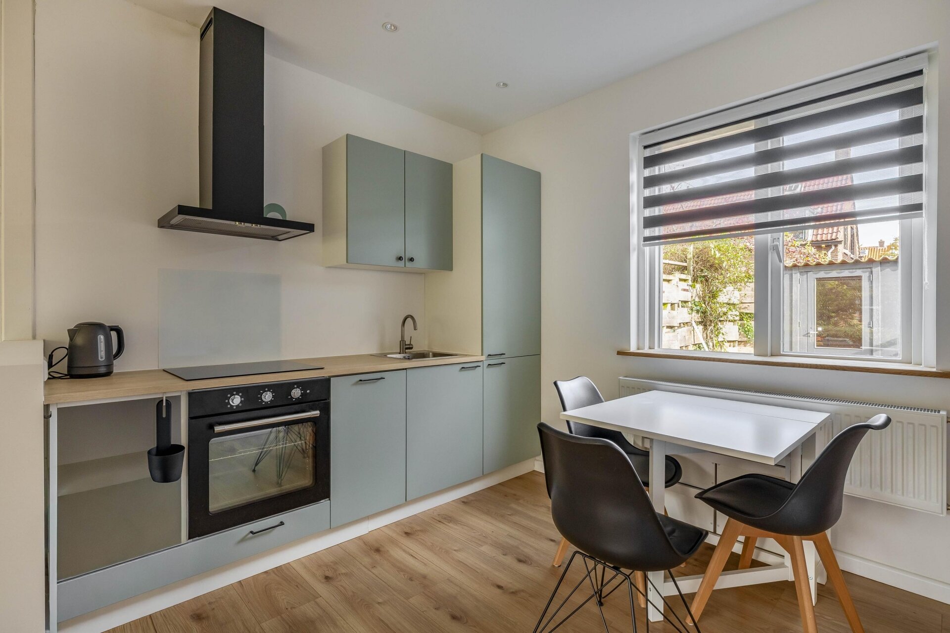 Binnenkomst is via een knusse entree alwaar een modern toilet. Eenmaal binnen valt direct de strakke afwerking op. De lichte woonkamer met laminaatvloer en grote raampartij biedt een fijne plek om te ontspannen. De open keuken is compact maar modern ingericht met een inductiekookplaat, afzuigkap, combi-oven en een koel-vriescombinatie. Alles wat je nodig hebt zit erin — en dat in een stijlvol, strak jasje.