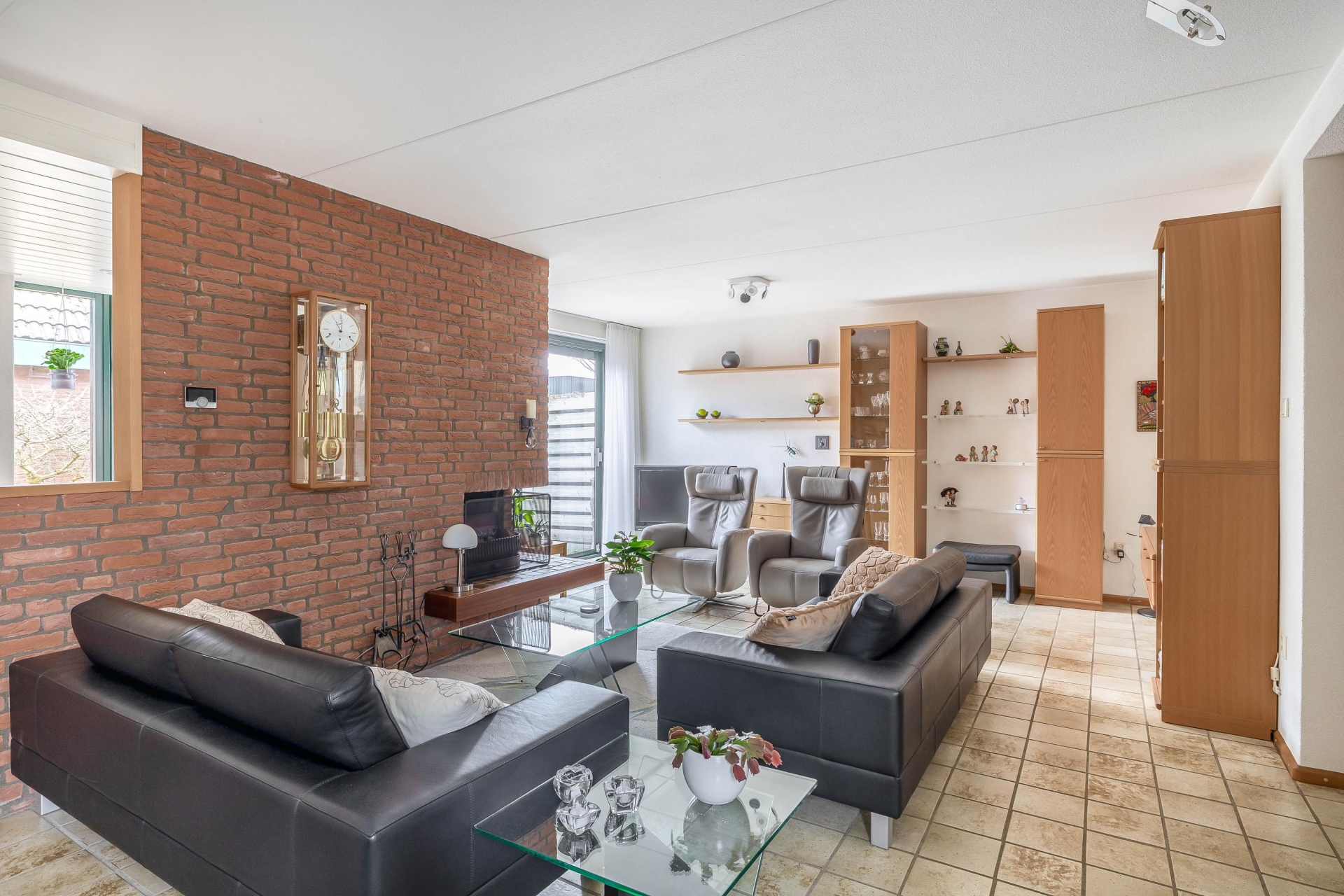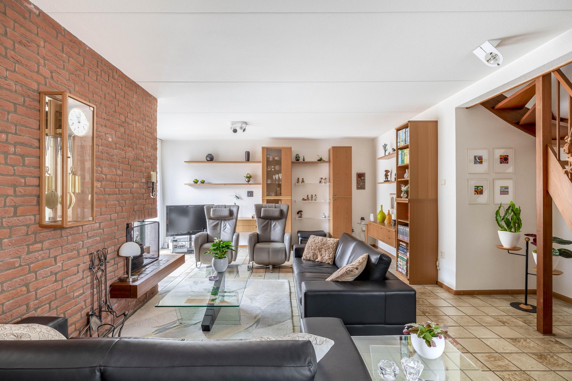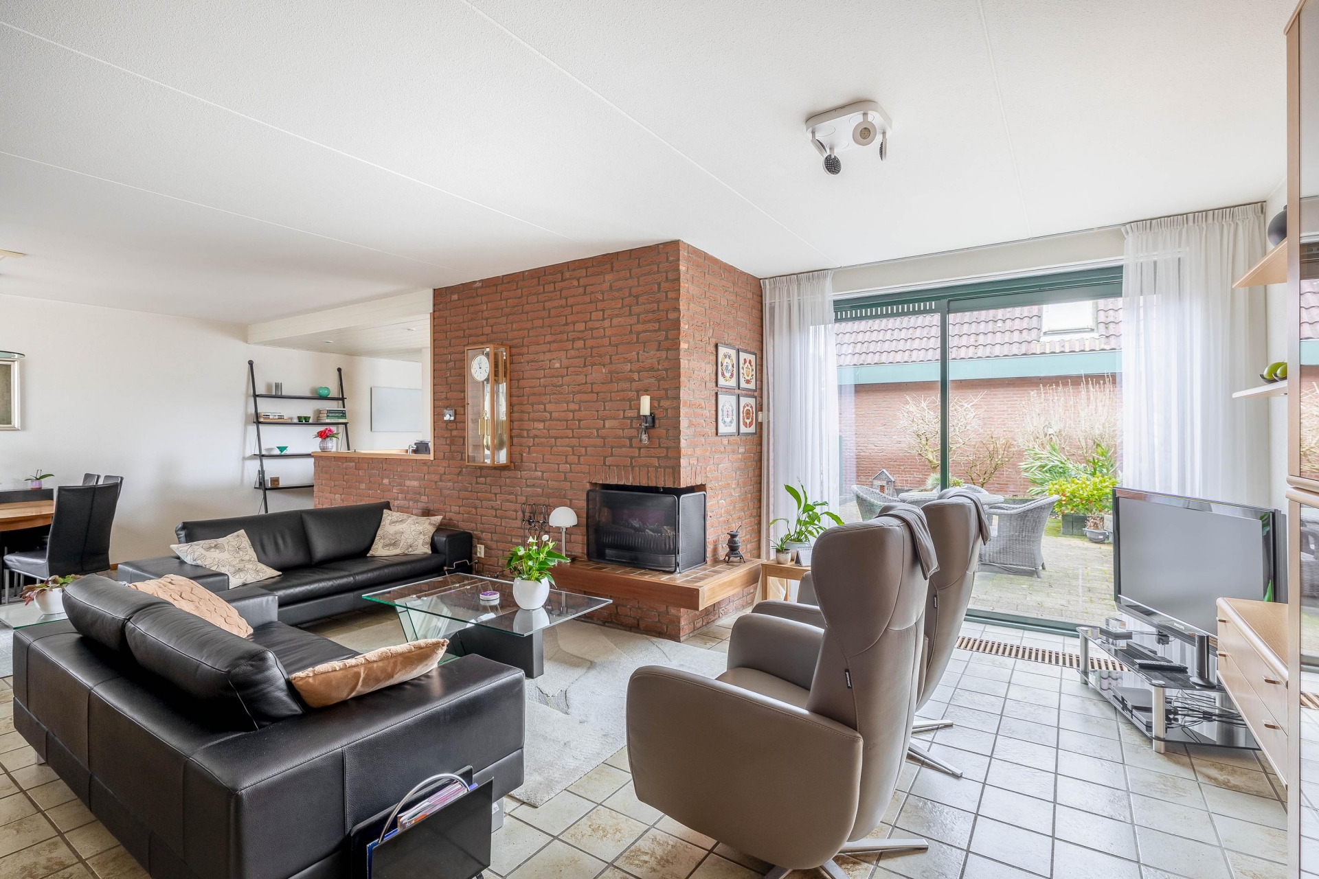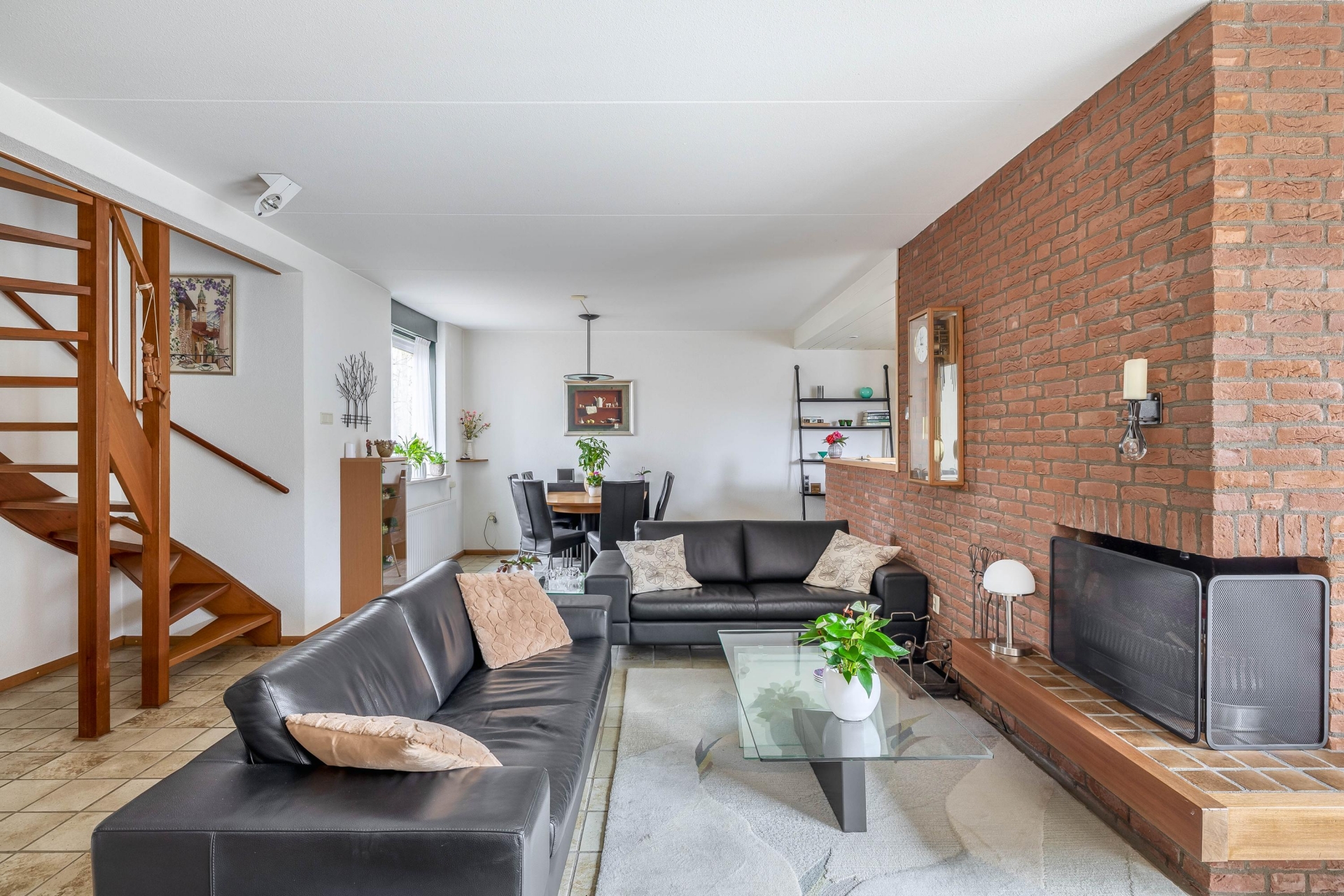 De gemetselde open haard vormt het warme middelpunt van de woonkamer. In de winter zit je hier heerlijk bij het vuur, terwijl de kinderen aan tafel spelen of hun huiswerk maken. De schuifpui aan de achterzijde verbindt binnen en buiten op een natuurlijke manier.
