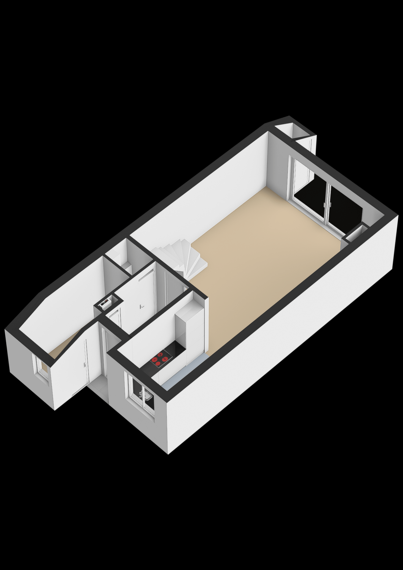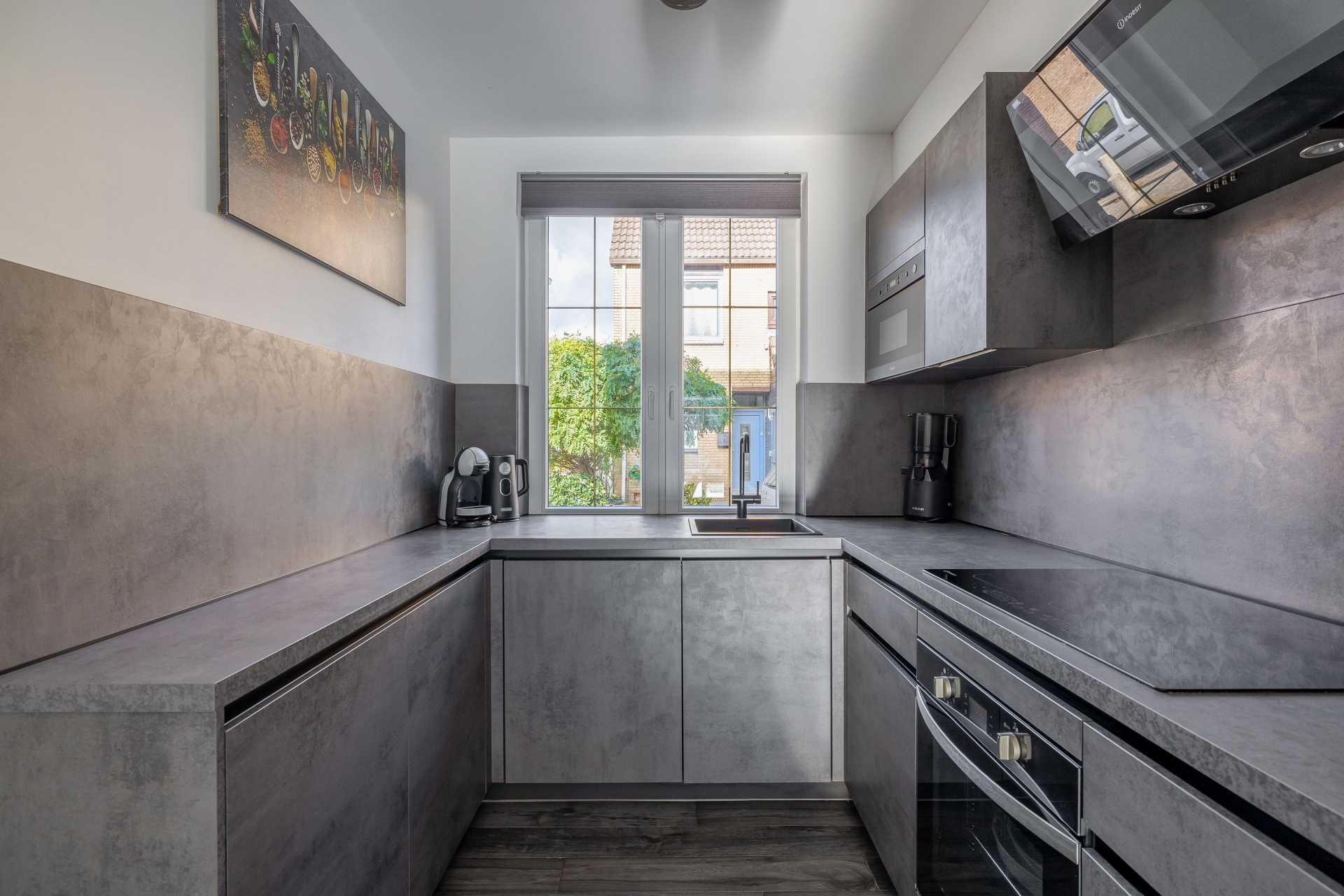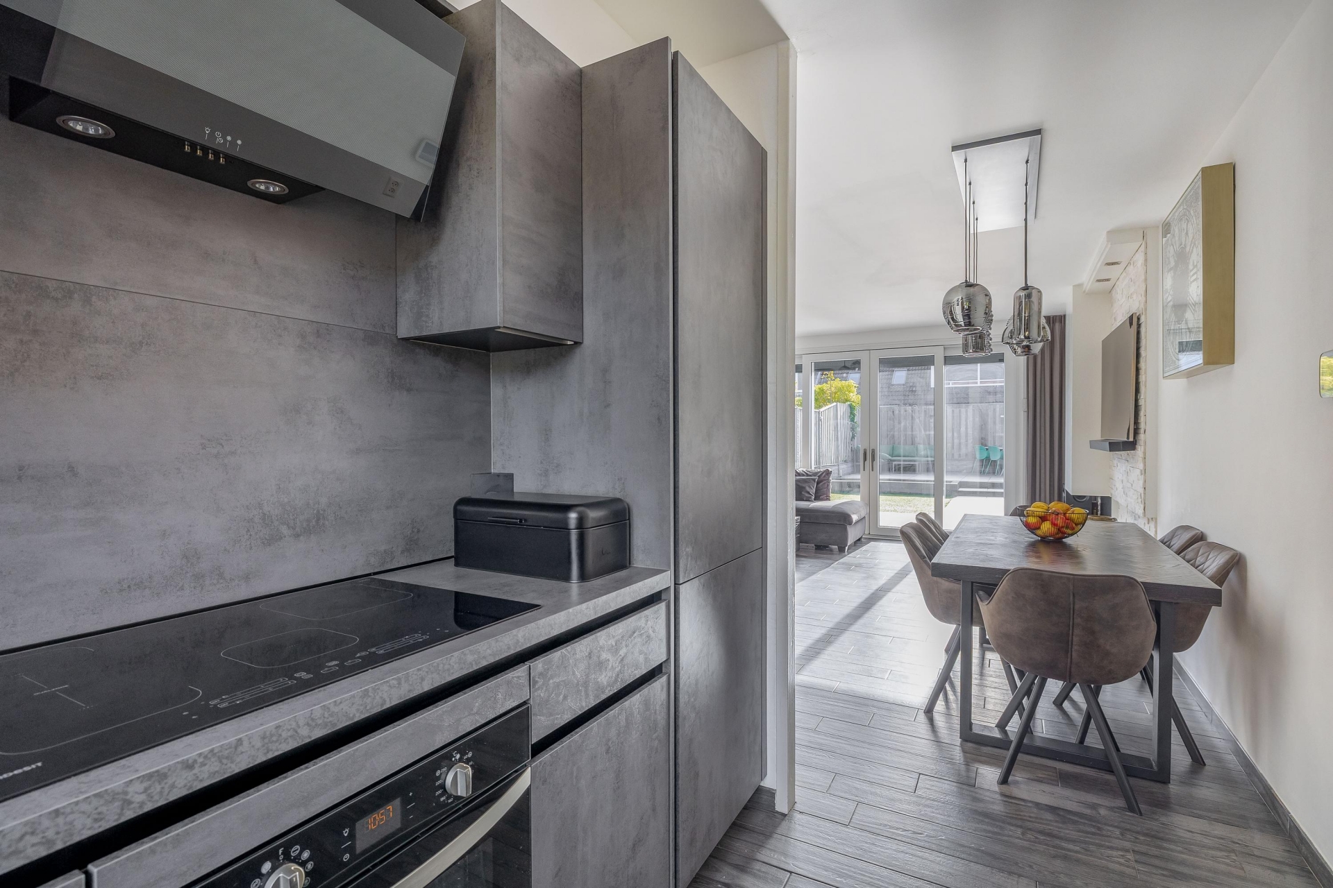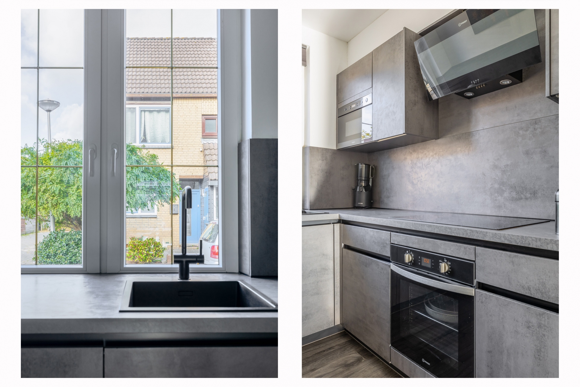 De woonkamer is dankzij de grote raampartijen en de kunststof dubbele schuifpui aan de achterzijde heerlijk licht en biedt een fijne sfeer om in te wonen. De afwerking is strak en modern, met een neutrale kleurstelling en een praktische indeling. Aan de voorzijde bevindt zich de keuken, vernieuwd in 2022, uitgevoerd in een moderne stijl met betonlook en voorzien van diverse inbouwapparatuur zoals een inductiekookplaat, combi-oven, vaatwasser en koel-/vriescombinatie. De keuken en woonkamer staan in halfopen verbinding met elkaar en vormen samen een prettige leefruimte met veel licht en comfort.