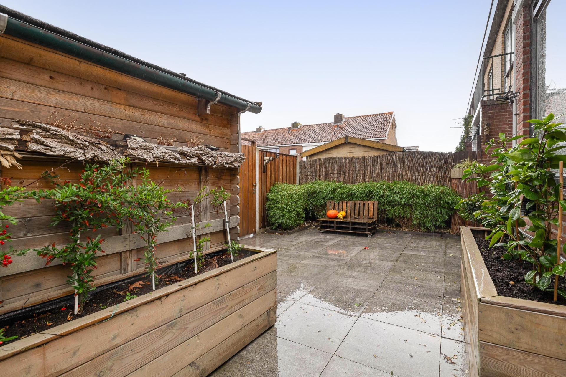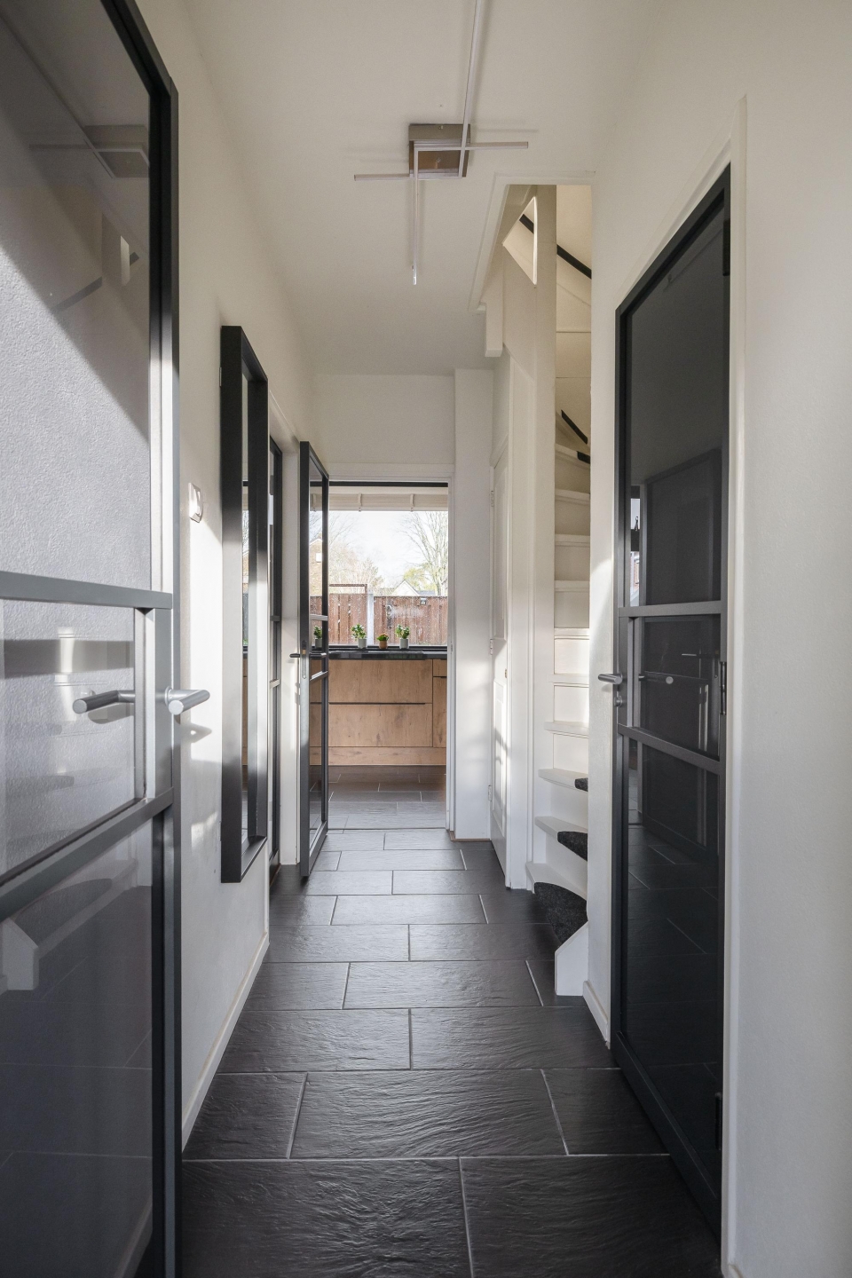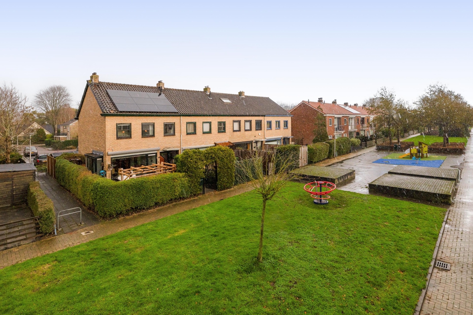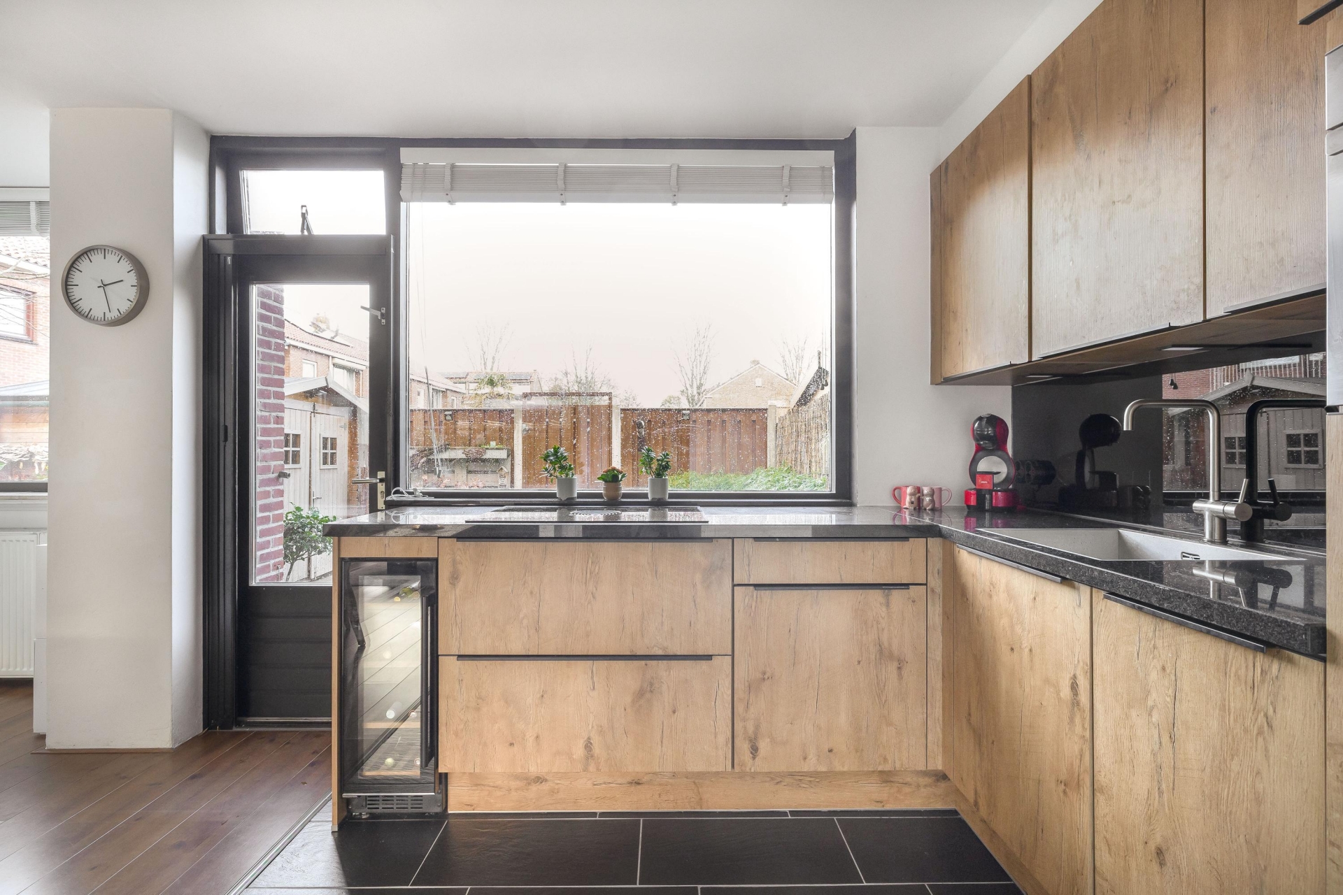 De woonkamer is ruim opgezet en heerlijk licht door de ramen, de erker en de glazen binnendeuren. Doordat het een hoekwoning betreft heb je net wat meer privacy en lichtinval dan gemiddeld. De open keuken aan de tuinzijde maakt de begane grond tot een fijne, open leefruimte. Vanuit de keuken heb je toegang tot de achtertuin op het noordoosten, waar je 's ochtends heerlijk in de zon kunt ontbijten. Aan de voorzijde ligt een goed onderhouden voortuin op het zuidwesten, perfect voor een borrel in de avondzon. Het terras heeft een automatisch bedienbaar zonnescherm met ingebouwde verlichting. Achterin de tuin staat een vrijstaande berging (voorzien van electra) voor je fietsen en gereedschap.