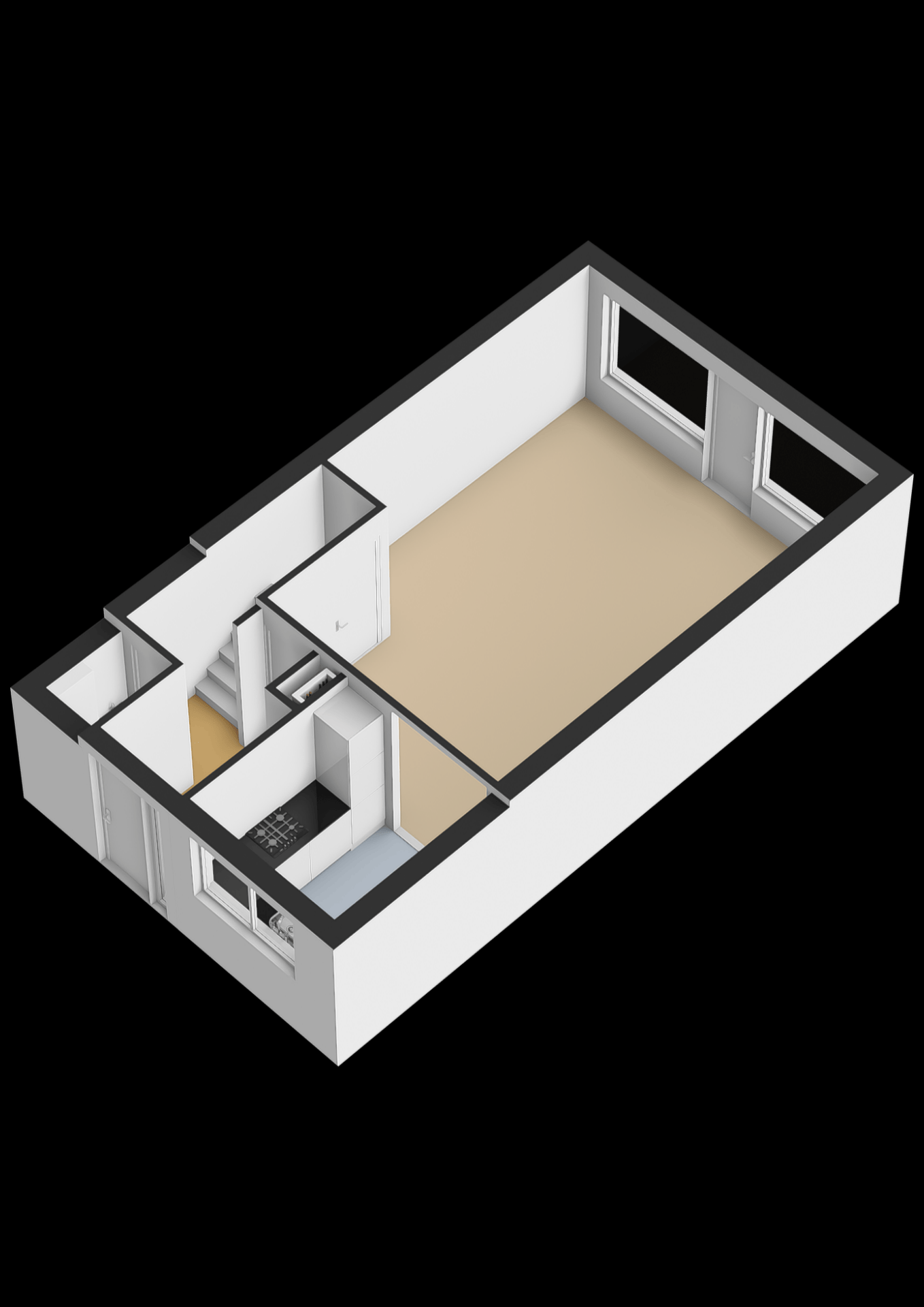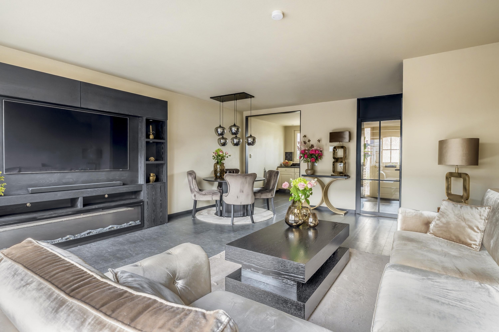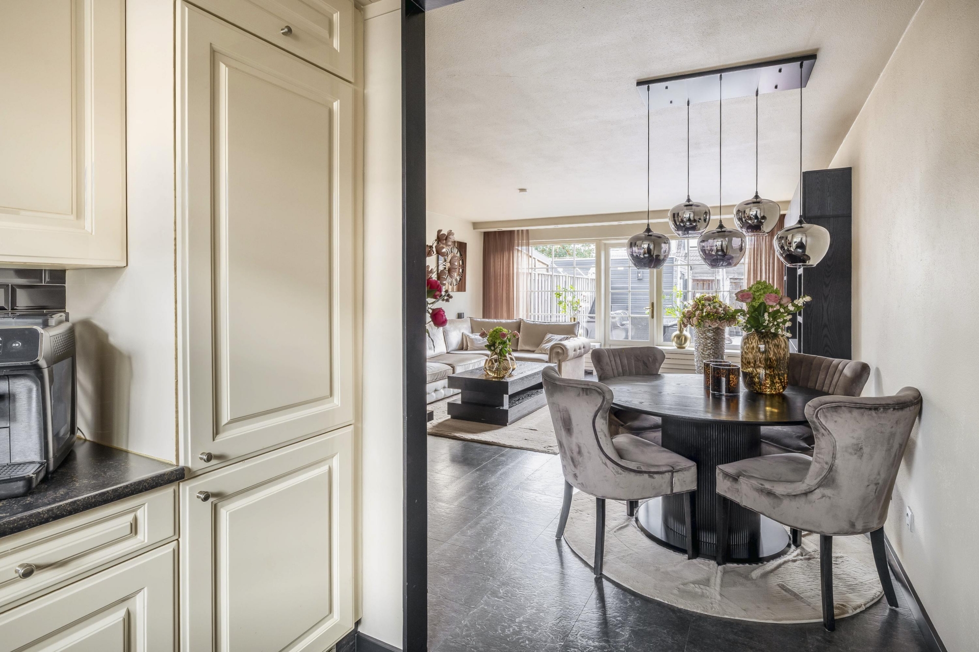 De ruime woonkamer is voorzien van grote raampartijen, wat zorgt voor een lichte ruimte. Vanuit de woonkamer is de open keuken toegankelijk. De keuken is verzorgd en voorzien van alle benodigde inbouwapparatuur.