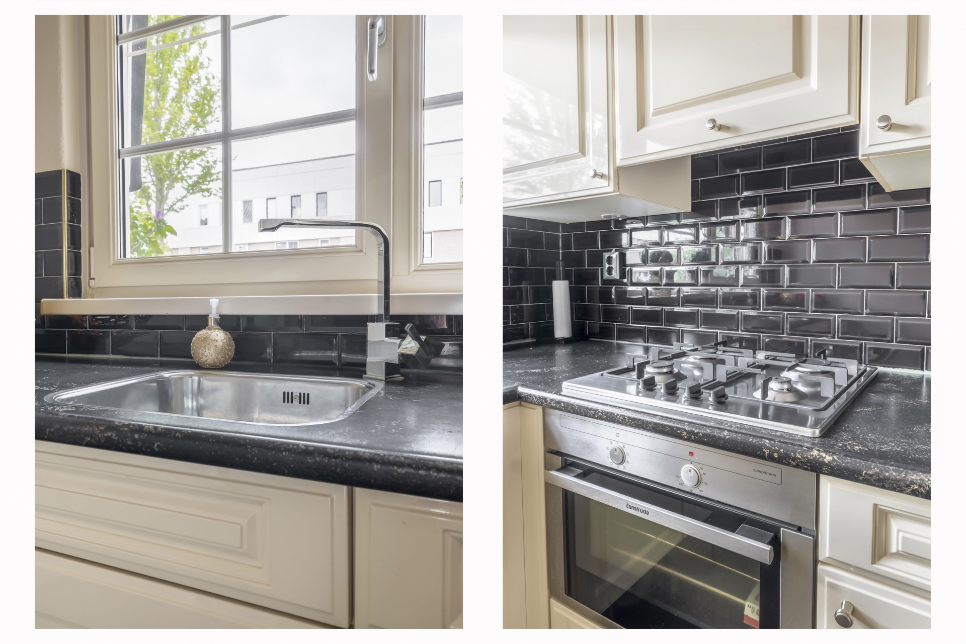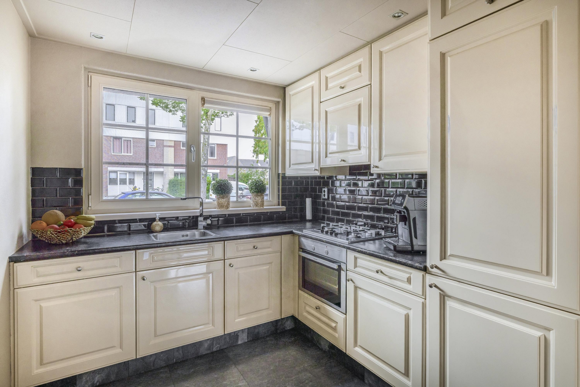 - Keuken in L-opstelling geplaatst en voorzien van een 4-pitsgaskookplaat, afzuigschouw, inbouw koelvriescombinatie ,oven en vaatwasser;