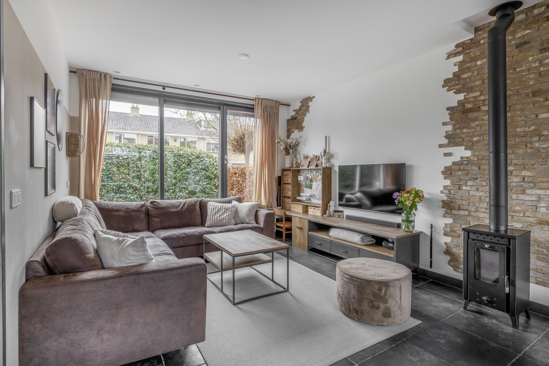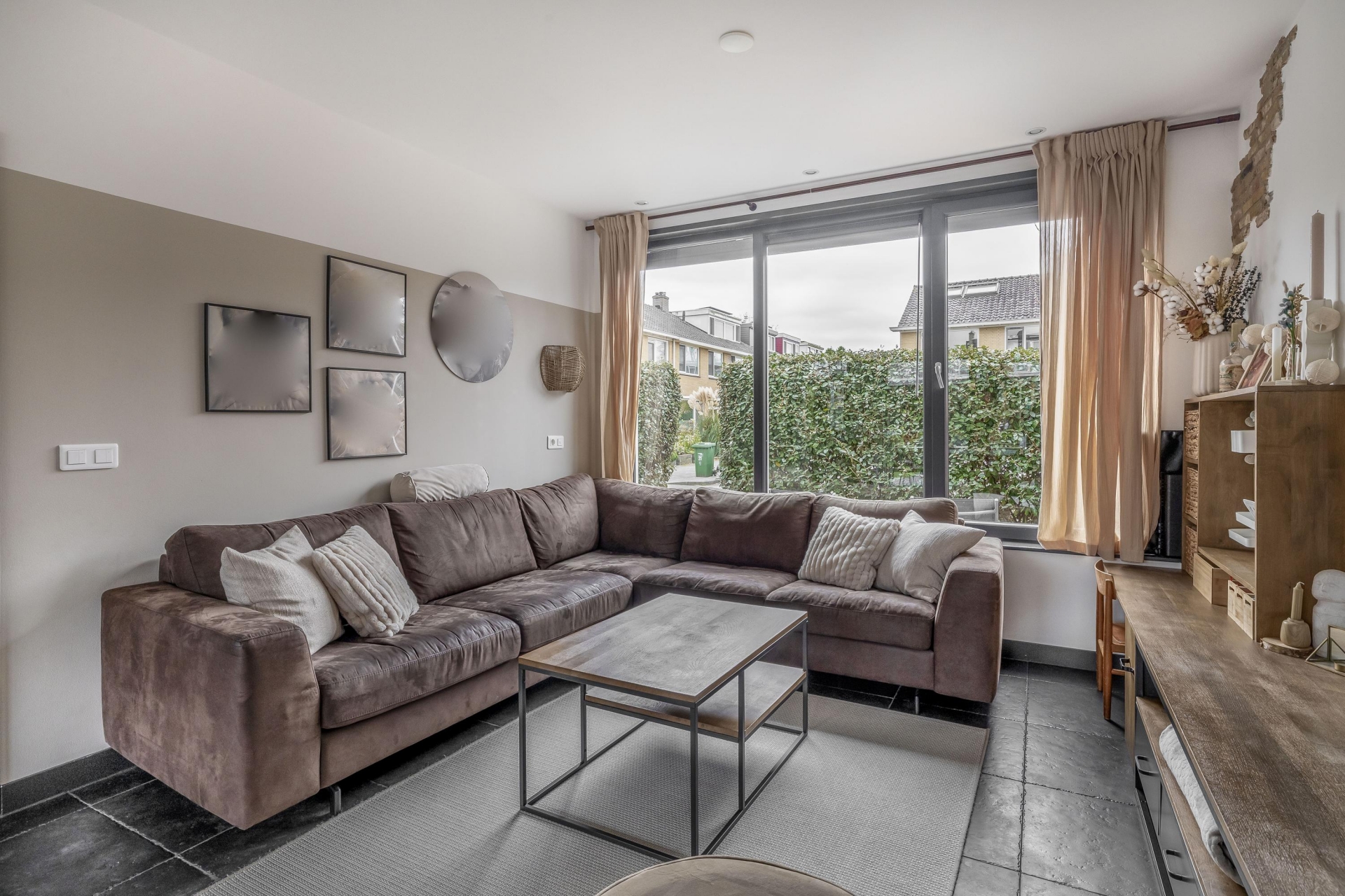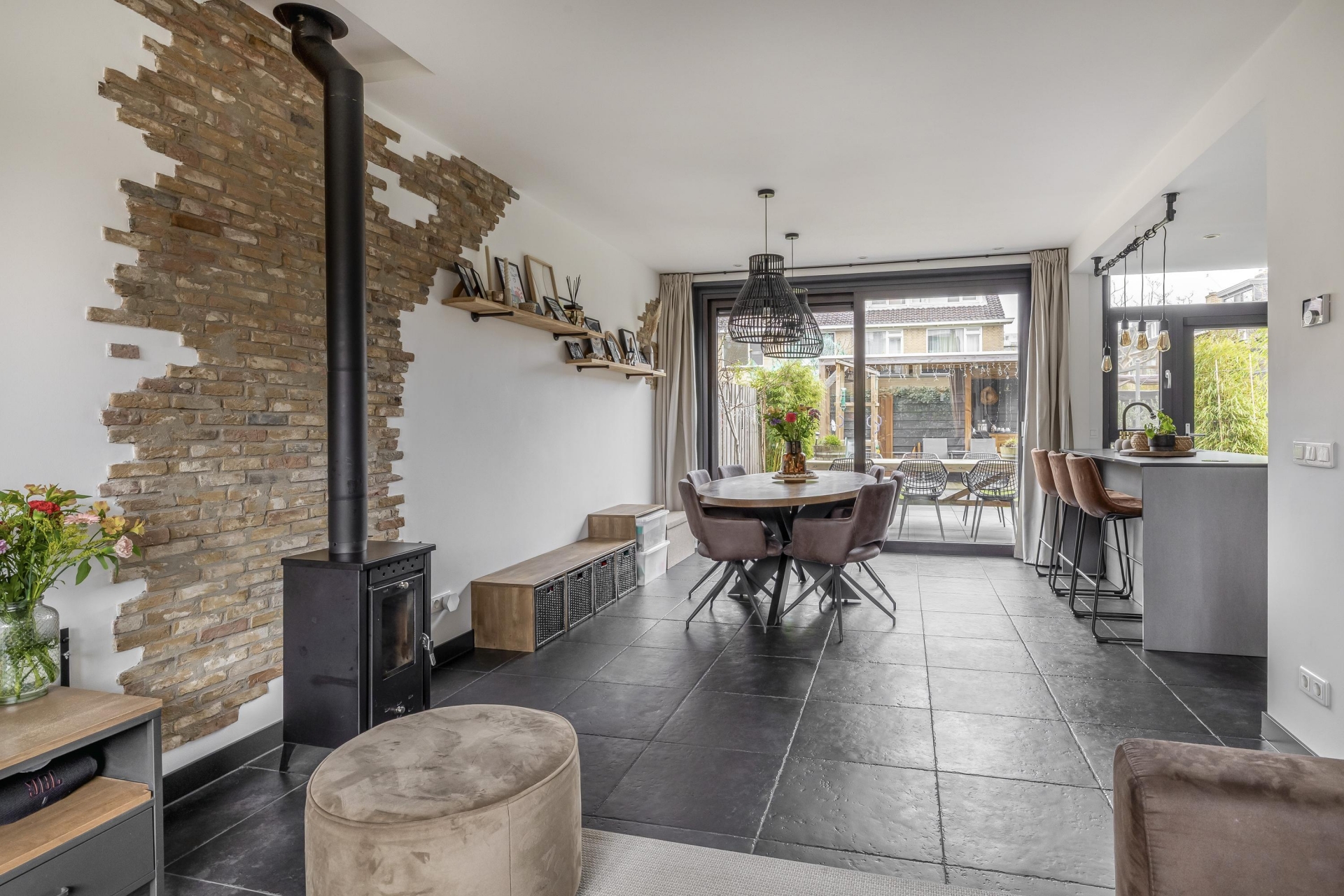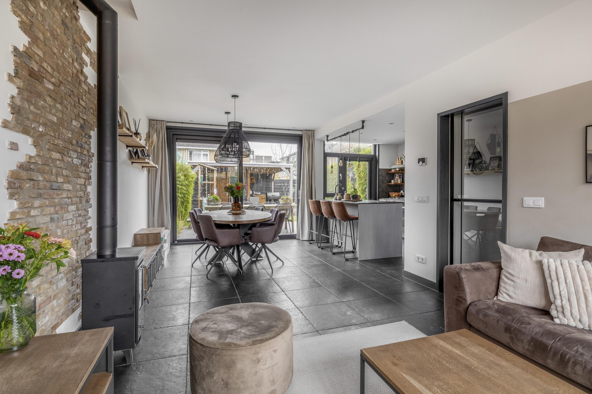 De tuingerichte eethoek en woonkamer zijn sfeervol en praktisch ingericht. Grote raampartijen zorgen voor veel daglicht en een open gevoel. De ruimte is overzichtelijk ingedeeld en afgewerkt met een robuuste tegelvloer met vloerverwarming, neutrale kleuren en moderne verlichting.