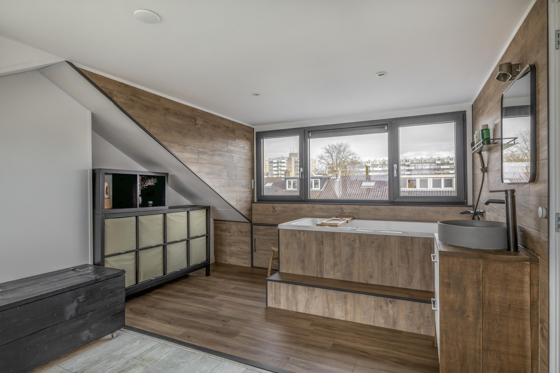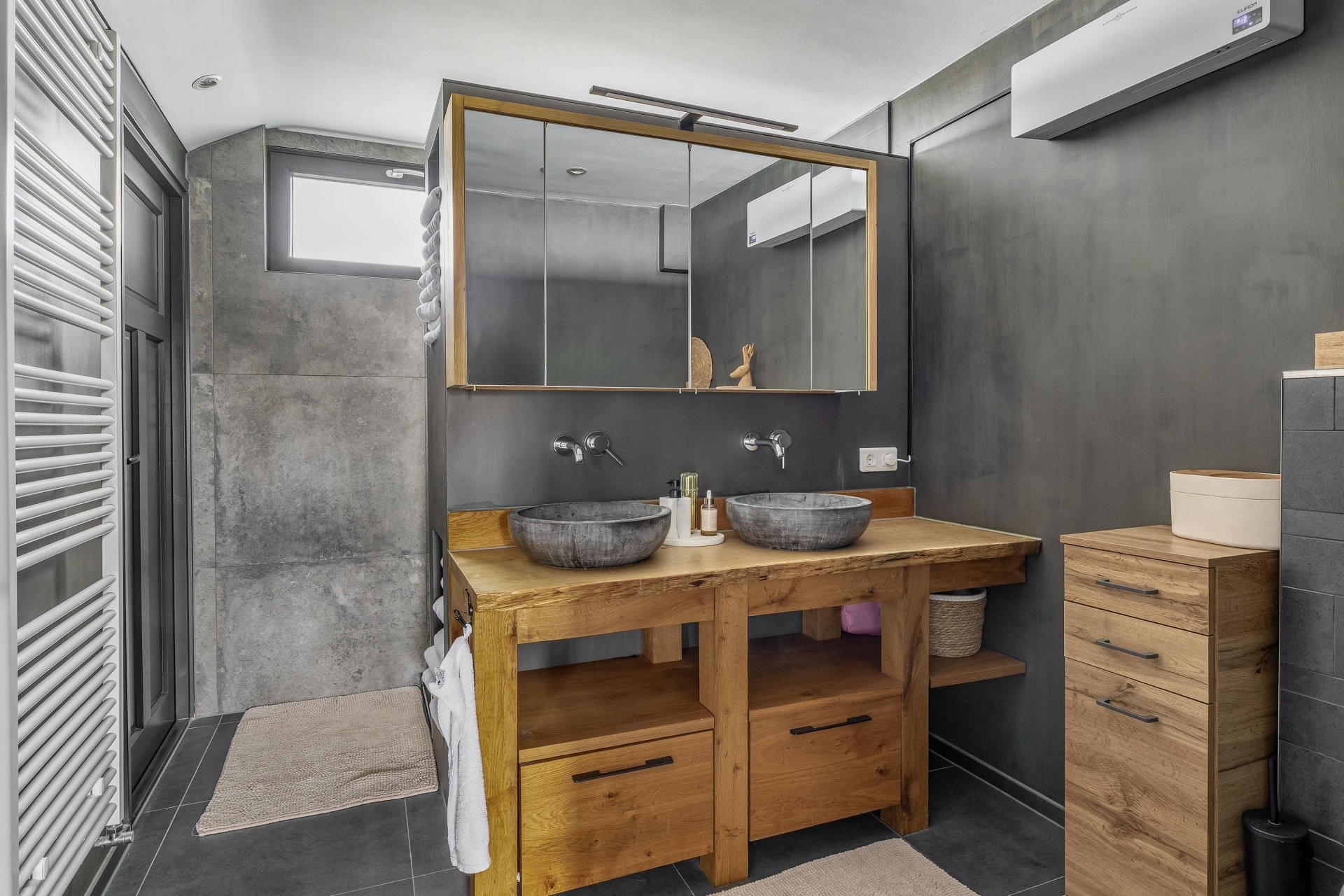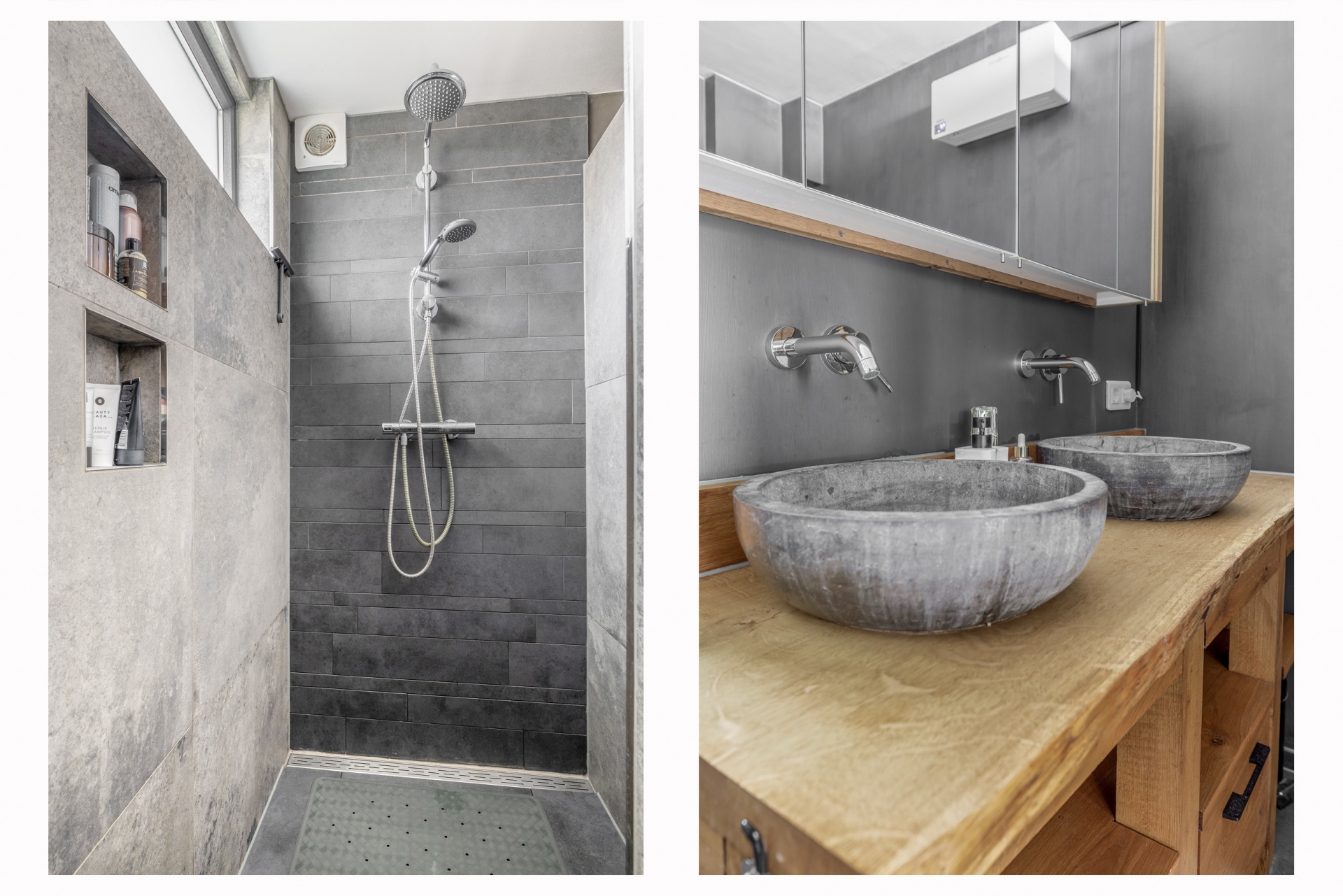 Extra fijn is dat er twee moderne badkamers zijn – nooit meer ochtendstress! Eén badkamer is uitgerust met een dubbele waskom, massief eikenhout badmeubel en een inloopdouche, strak afgewerkt in warme, natuurlijke tinten. De tweede badkamer biedt extra flexibiliteit voor bijvoorbeeld logees of tieners en heeft een heerlijk ligbad met whirlpool en wastafelmeubel.