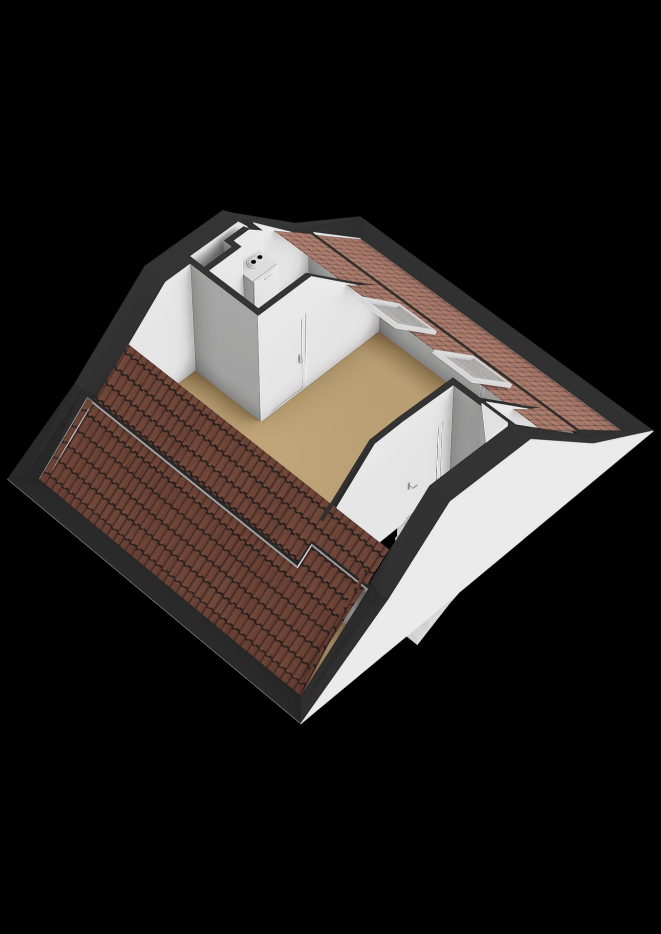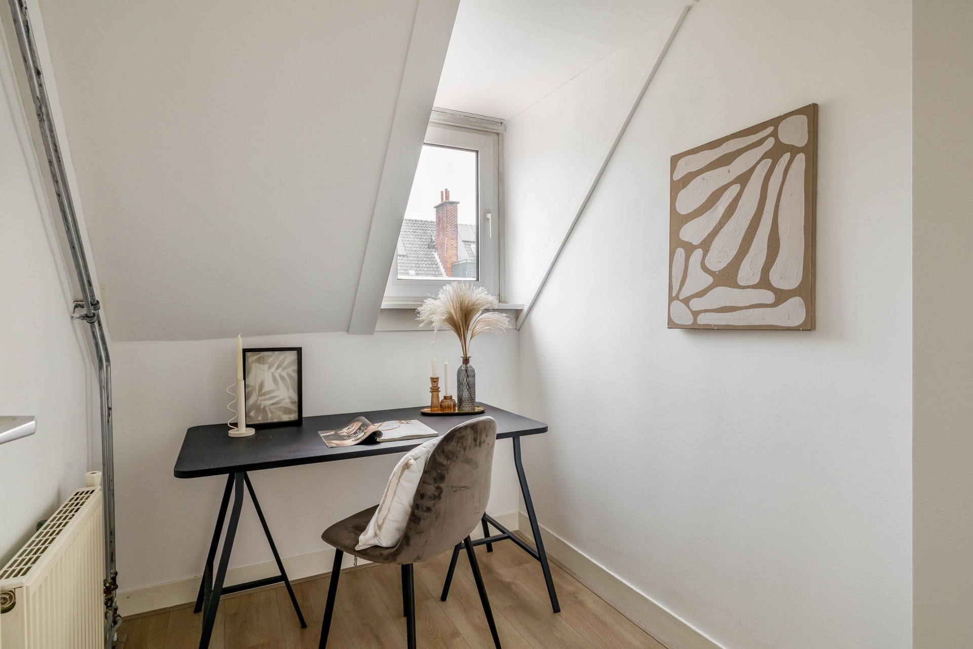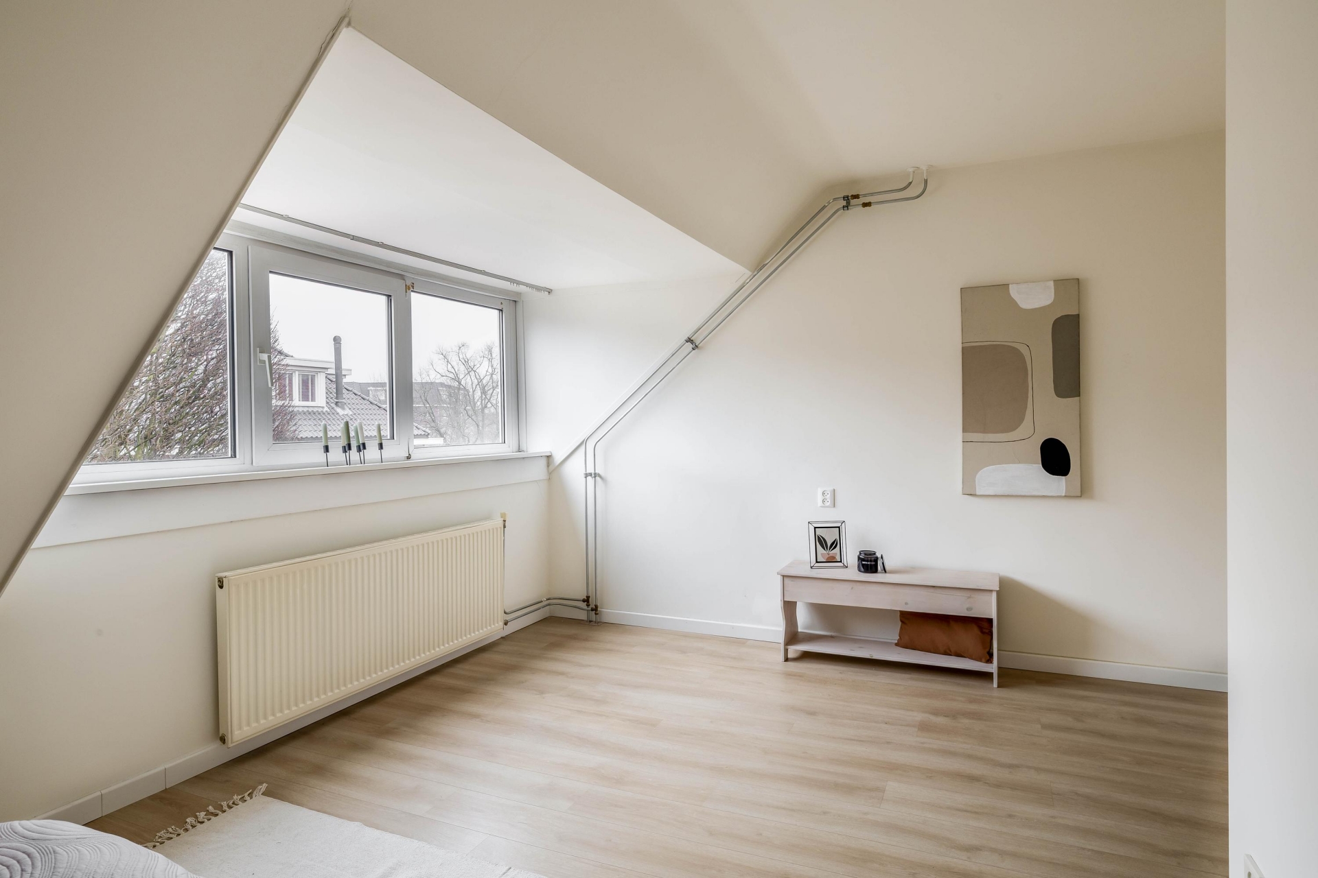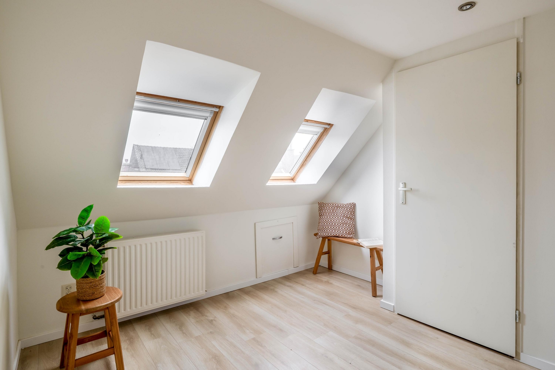 De zolderverdieping biedt een extra kamer met Velux dakramen en een afgesloten technische ruimte met de Remeha CV-combiketel (2014, eigendom), boiler en wasmachineaansluiting. Perfect als extra slaapkamer, werkruimte of hobbykamer.