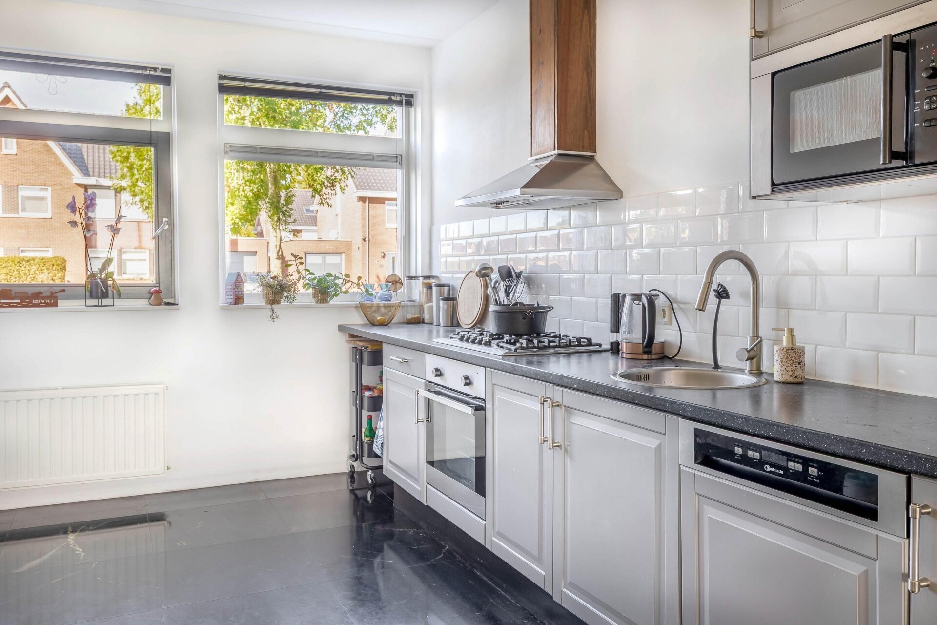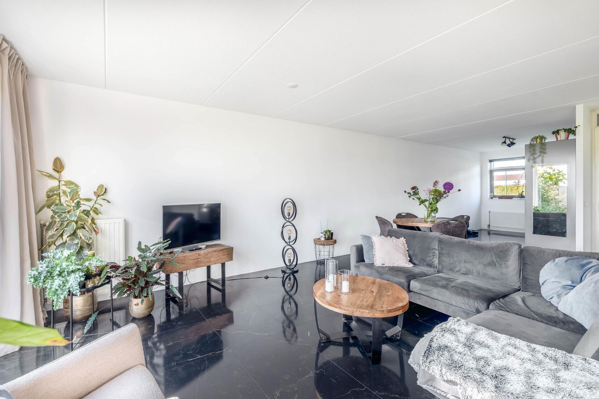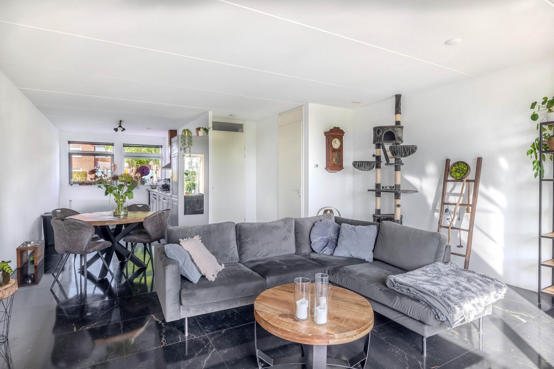 De woonkamer voelt direct ruim en aangenaam aan. Grote ramen zorgen voor veel lichtinval en een mooi uitzicht op zowel de straatzijde als de tuin. De laminaatvloer met de uitstraling van een zwarte plavuizenvloer geeft de ruimte een moderne, maar warme uitstraling. De zithoek en eethoek lopen vloeiend in elkaar over, waardoor je gemakkelijk contact houdt met je gezelschap. De halfopen keuken aan de voorzijde is praktisch ingedeeld en biedt alles wat je nodig hebt.