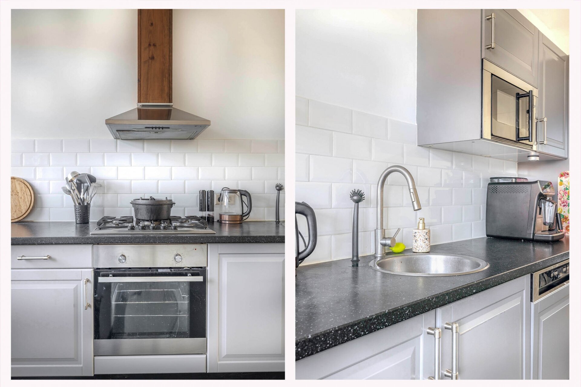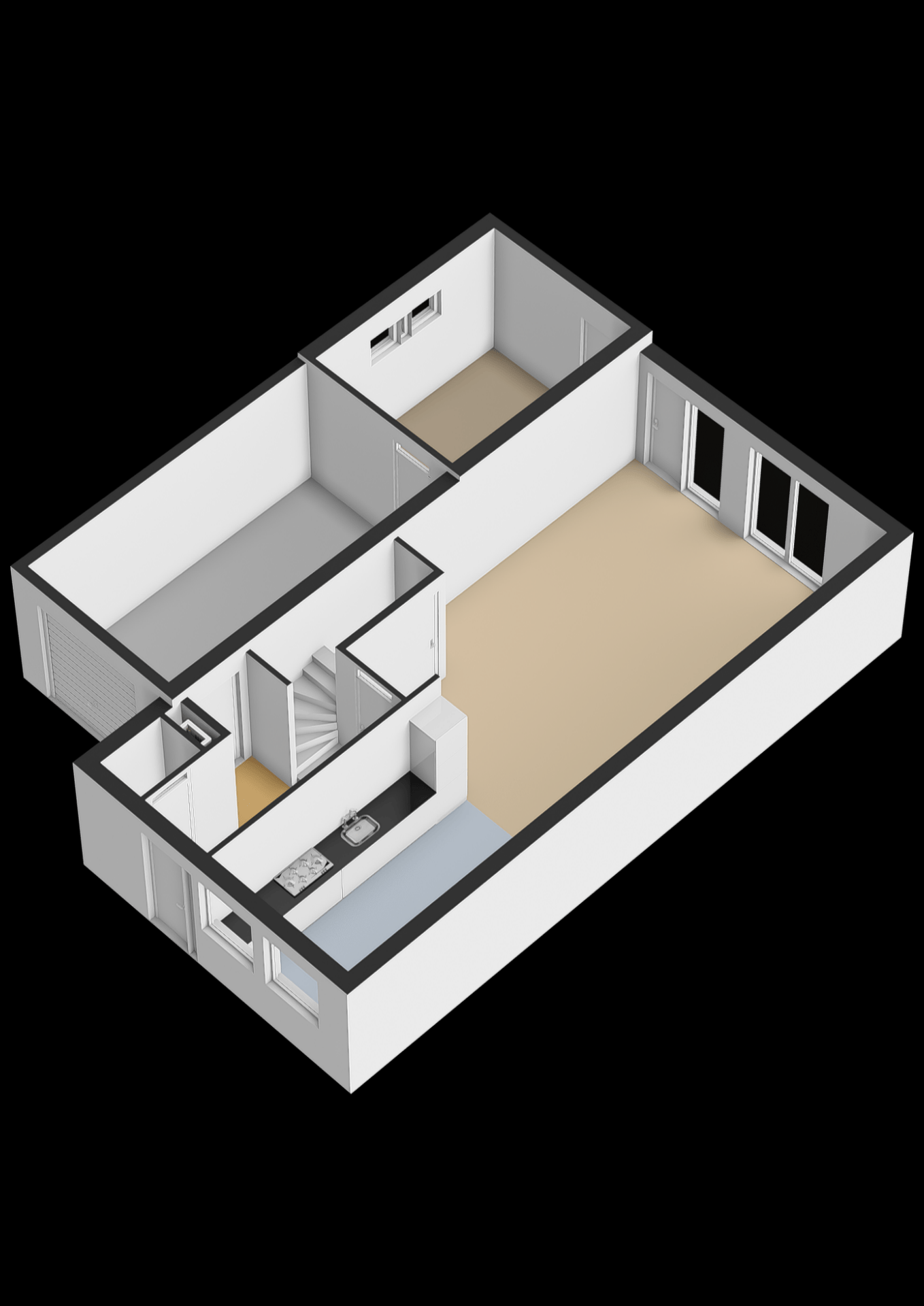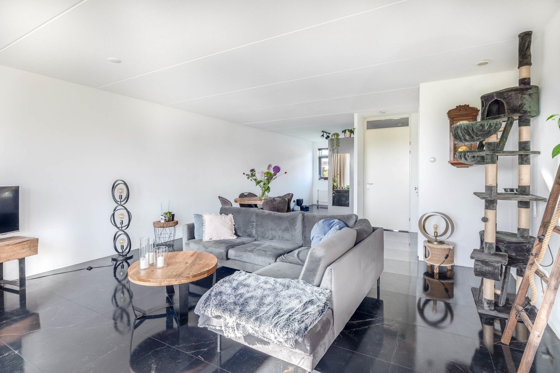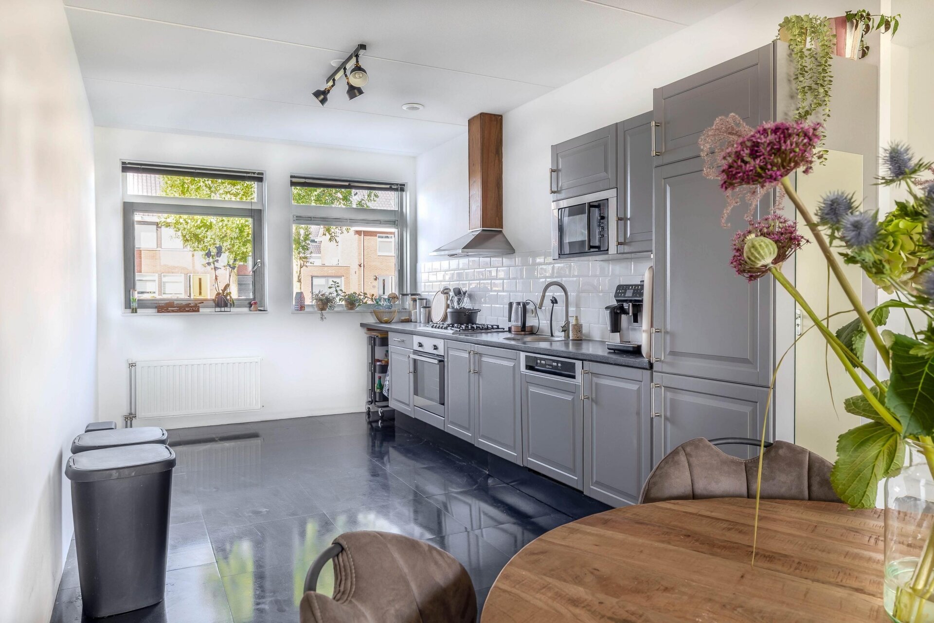 De woonkamer voelt direct ruim en aangenaam aan. Grote ramen zorgen voor veel lichtinval en een mooi uitzicht op zowel de straatzijde als de tuin. De laminaatvloer met de uitstraling van een zwarte plavuizenvloer geeft de ruimte een moderne, maar warme uitstraling. De zithoek en eethoek lopen vloeiend in elkaar over, waardoor je gemakkelijk contact houdt met je gezelschap. De halfopen keuken aan de voorzijde is praktisch ingedeeld en biedt alles wat je nodig hebt.