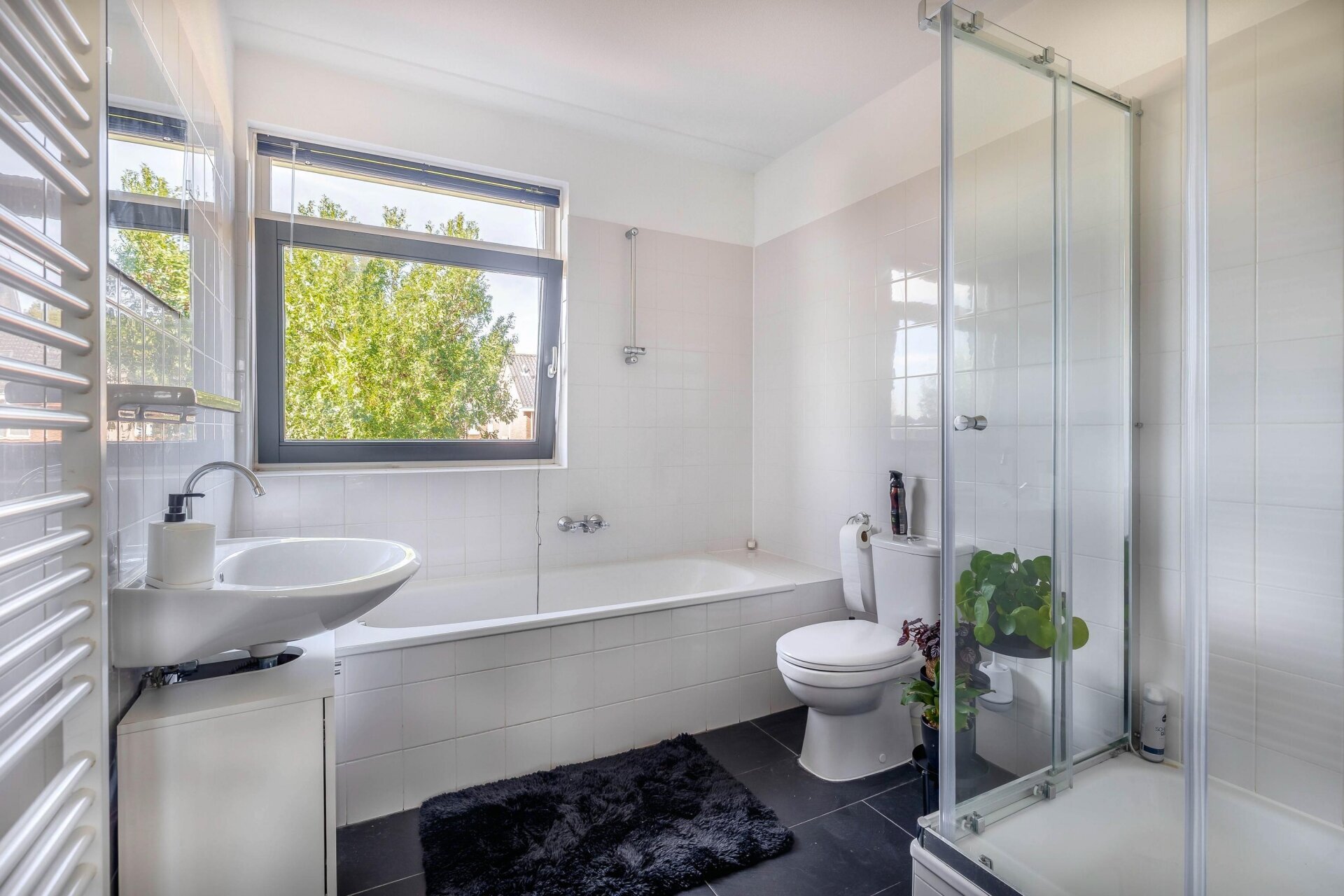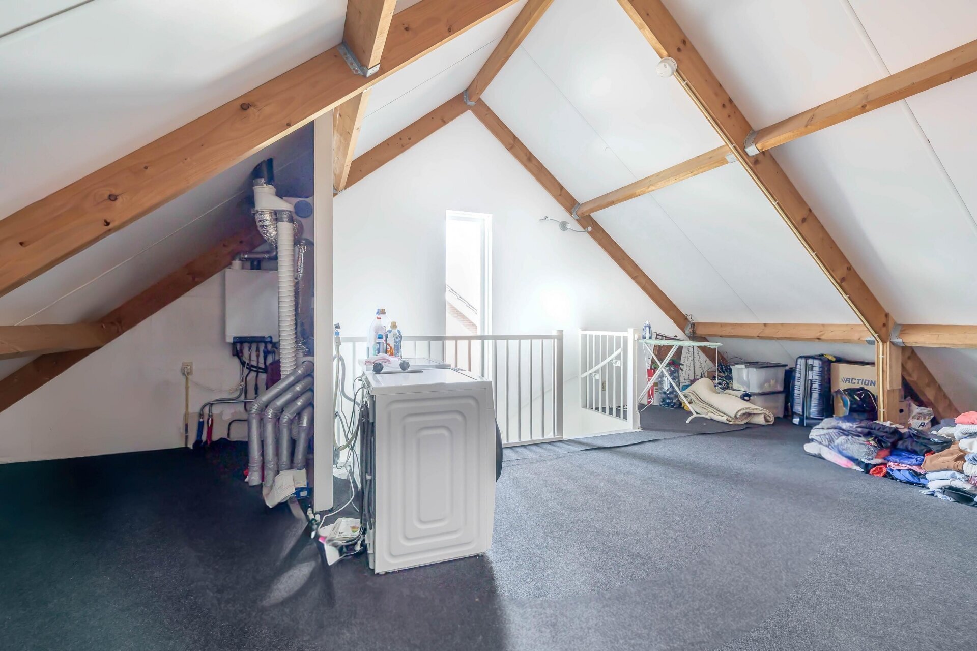 Op de eerste verdieping zijn drie volwaardige slaapkamers te vinden, waaronder een royale ouderslaapkamer met ruimte voor een groot bed en kastenwand. De andere twee kamers zijn ideaal als kinderkamer, werkkamer of logeerkamer. De badkamer is netjes en compleet, voorzien van een douche, wastafel, toilet en ligbad. De vaste trap naar zolder opent de deur naar nog meer ruimte: hier is eenvoudig een extra slaapkamer of werkruimte te realiseren. Dankzij het schuine dak behoort een dakkapel of dakraam ook tot de mogelijkheden.