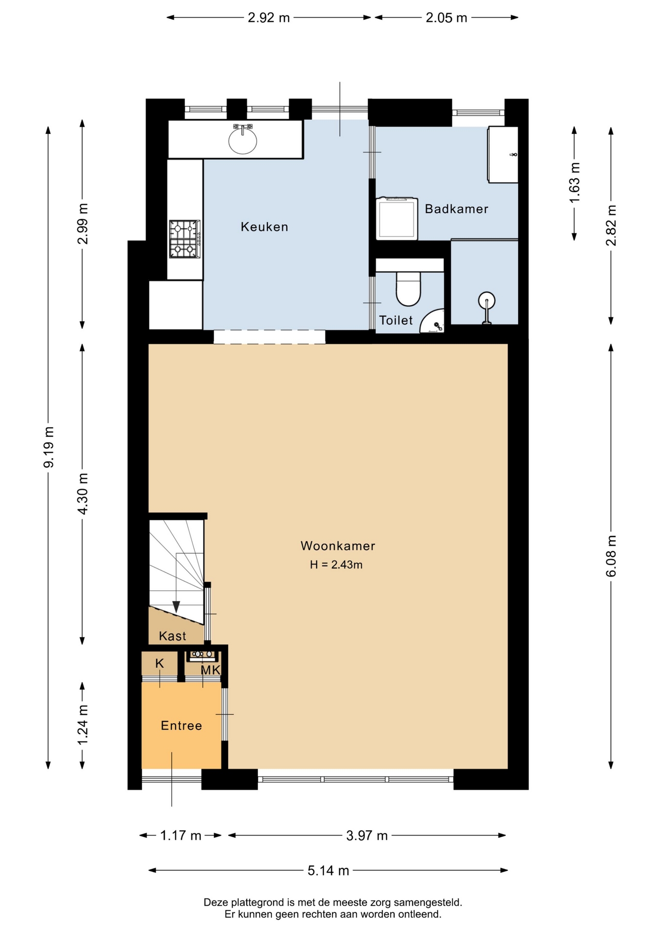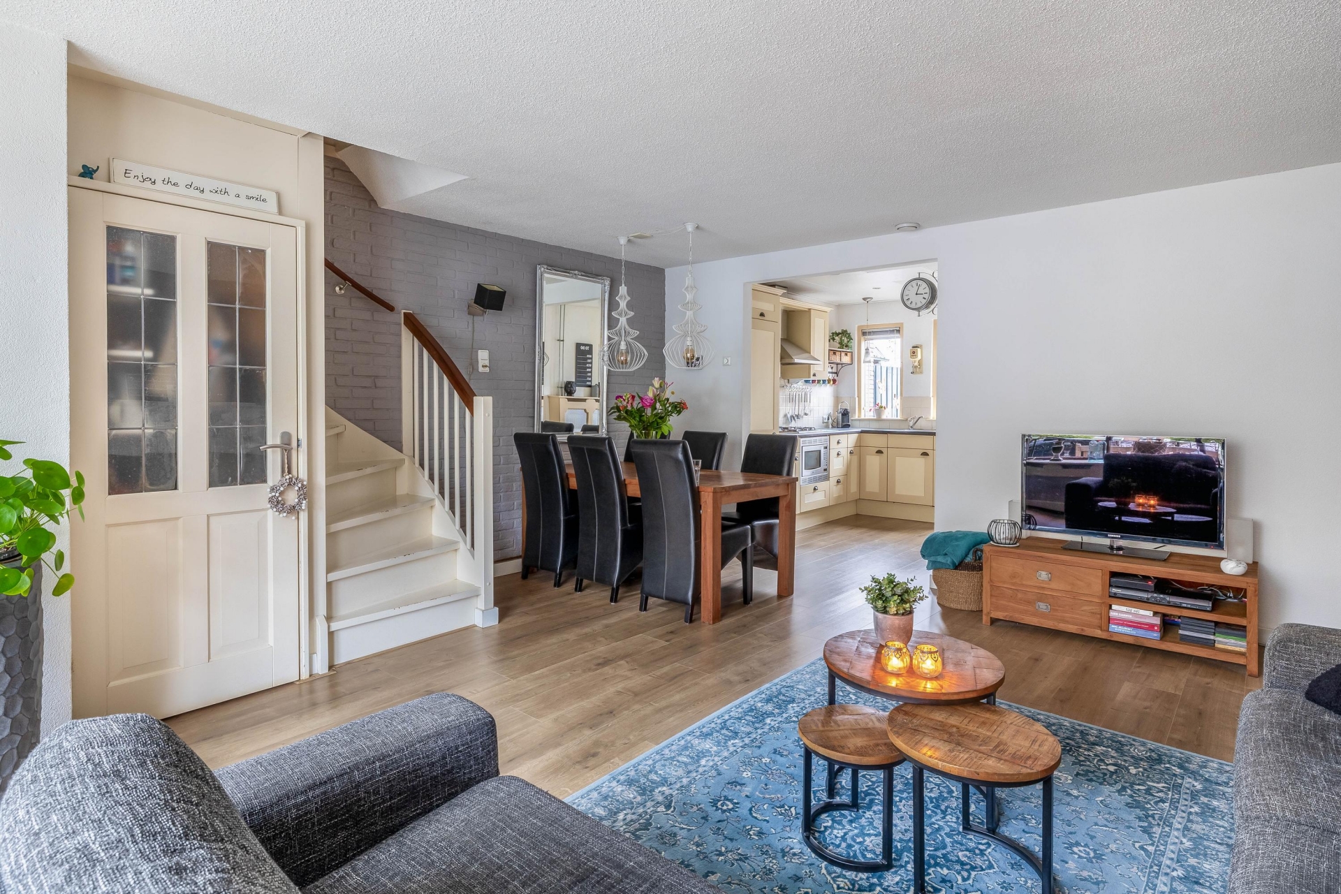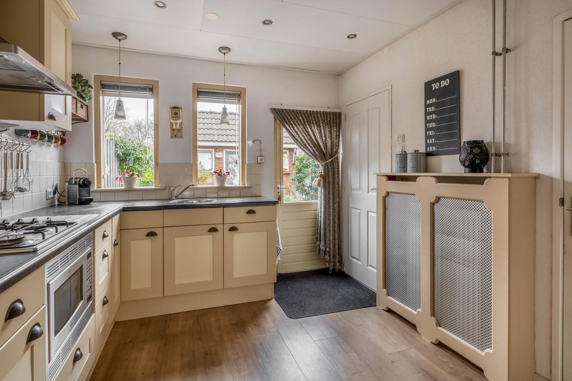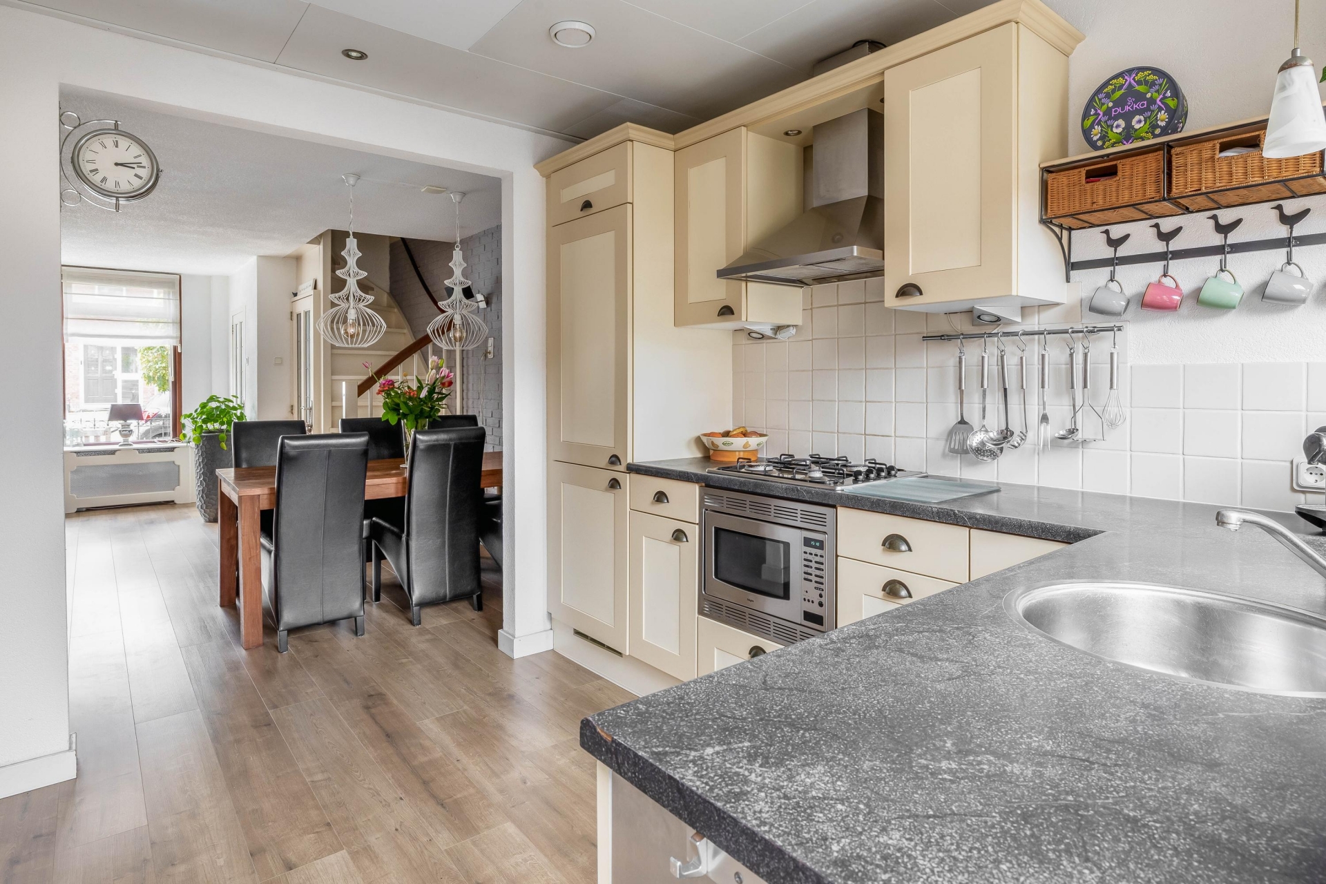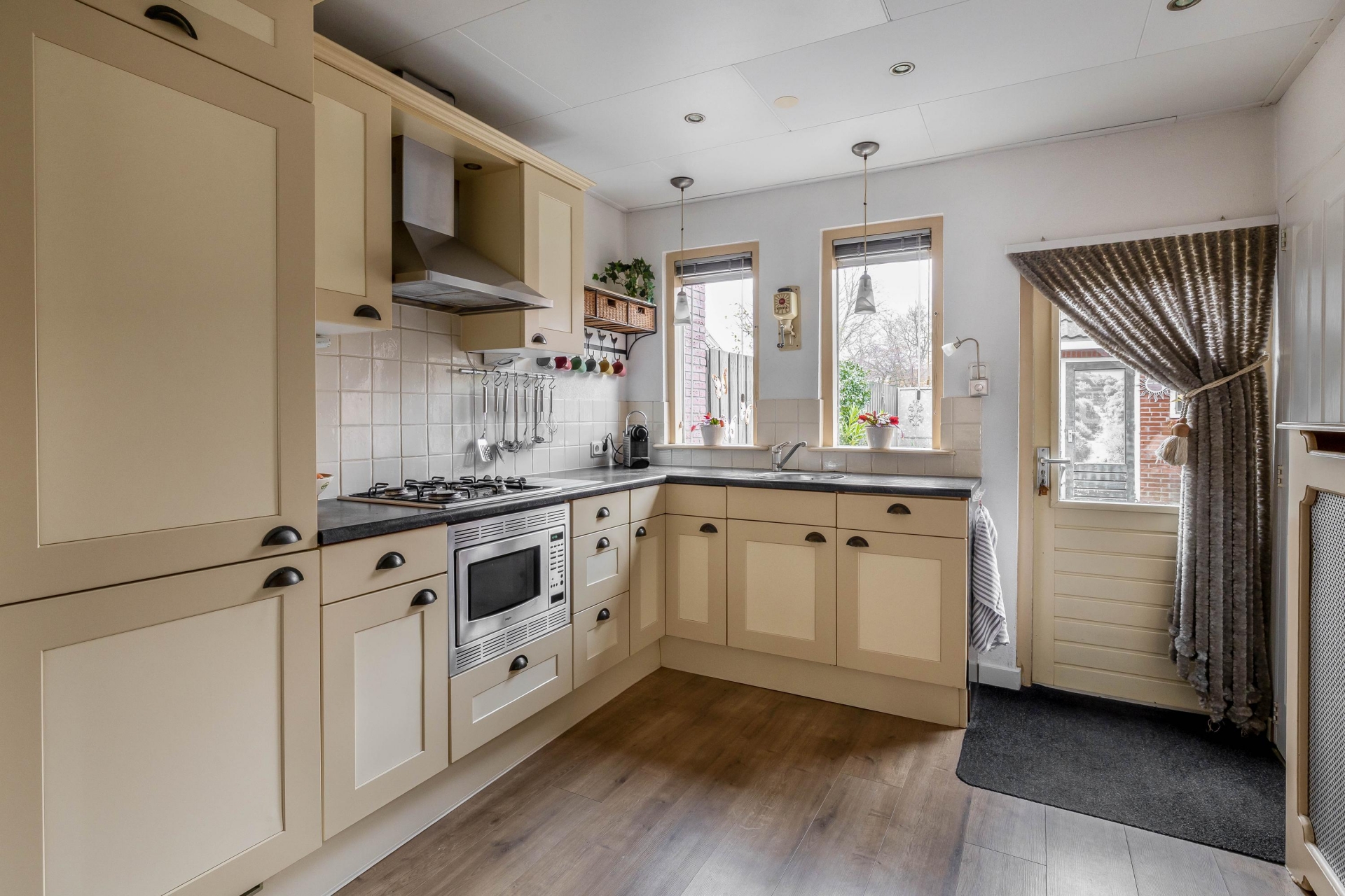 De woning beschikt over een sfeervolle woonkamer met een praktische trapkast. Aan de achterzijde bevindt zich het toilet met fontein. De badkamer is uitgerust met een inloopdouche, wastafelmeubel, wasmachineaansluiting en vloerverwarming. De keuken is voorzien van een koel-vriescombinatie, combimagnetron, 4-pits gasfornuis en afzuigkap.