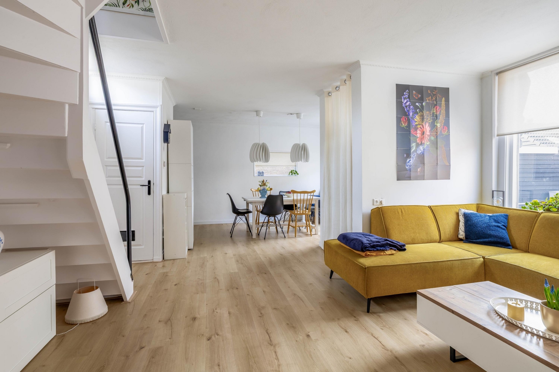 Binnenkomst is in de woonkamer, een fijne en lichte leefruimte waar je direct de prettige sfeer van het huis ervaart. Aan de voorzijde zorgen de ramen voor een mooie lichtinval en een open gevoel. Hier is voldoende ruimte voor een comfortabele zithoek, terwijl de opstelling van de ruimte ook zorgt voor een natuurlijke overgang richting de achterzijde van het huis.