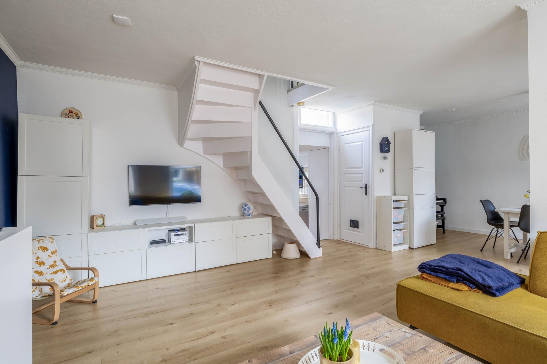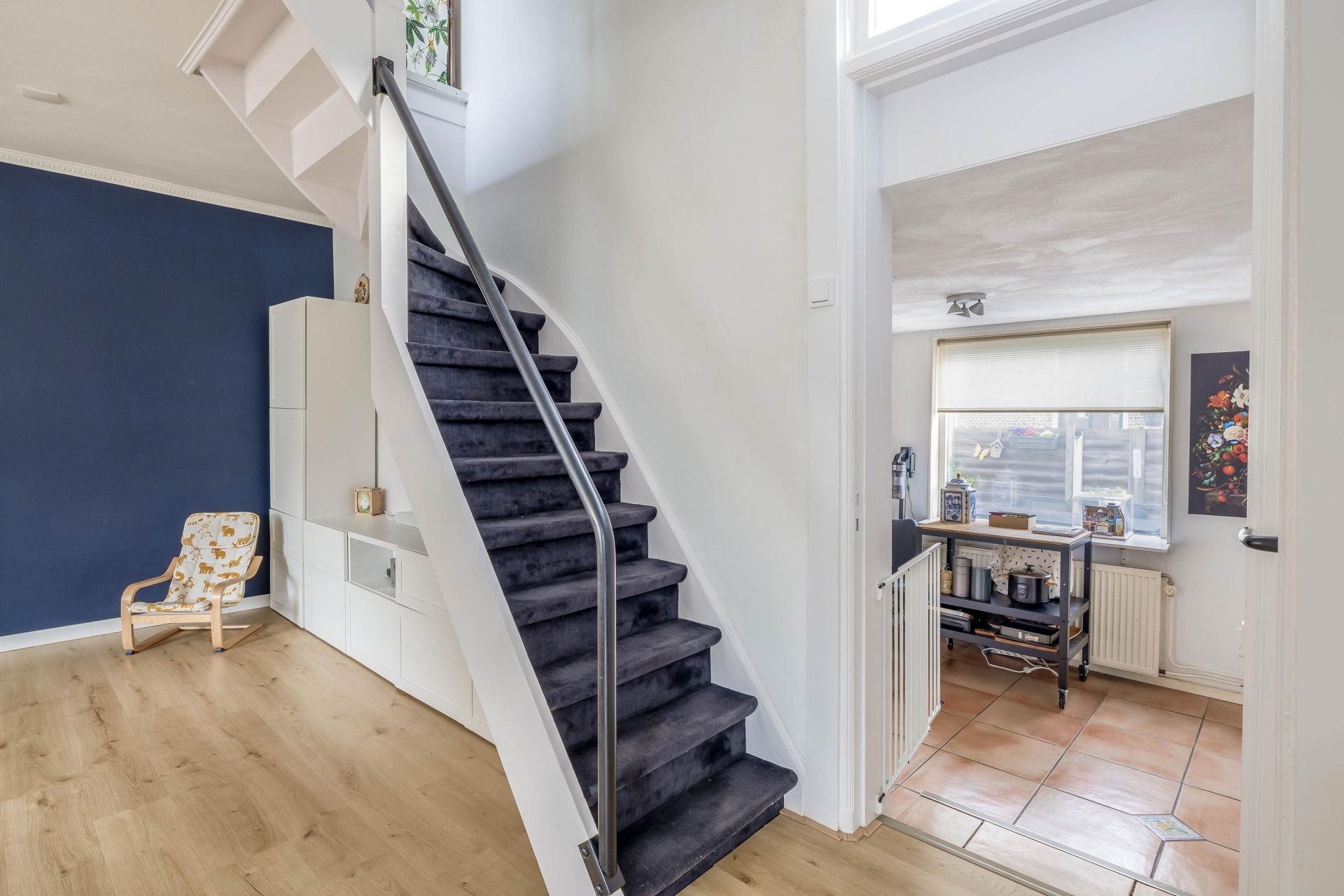 Via een doorgang loop je door naar de woonkeuken. Deze opzet geeft het huis een speels karakter en maakt de indeling verrassend leuk. De woonkamer voelt daardoor zelfstandig en gezellig aan, terwijl de keuken toch mooi in verbinding staat met het leefgedeelte.