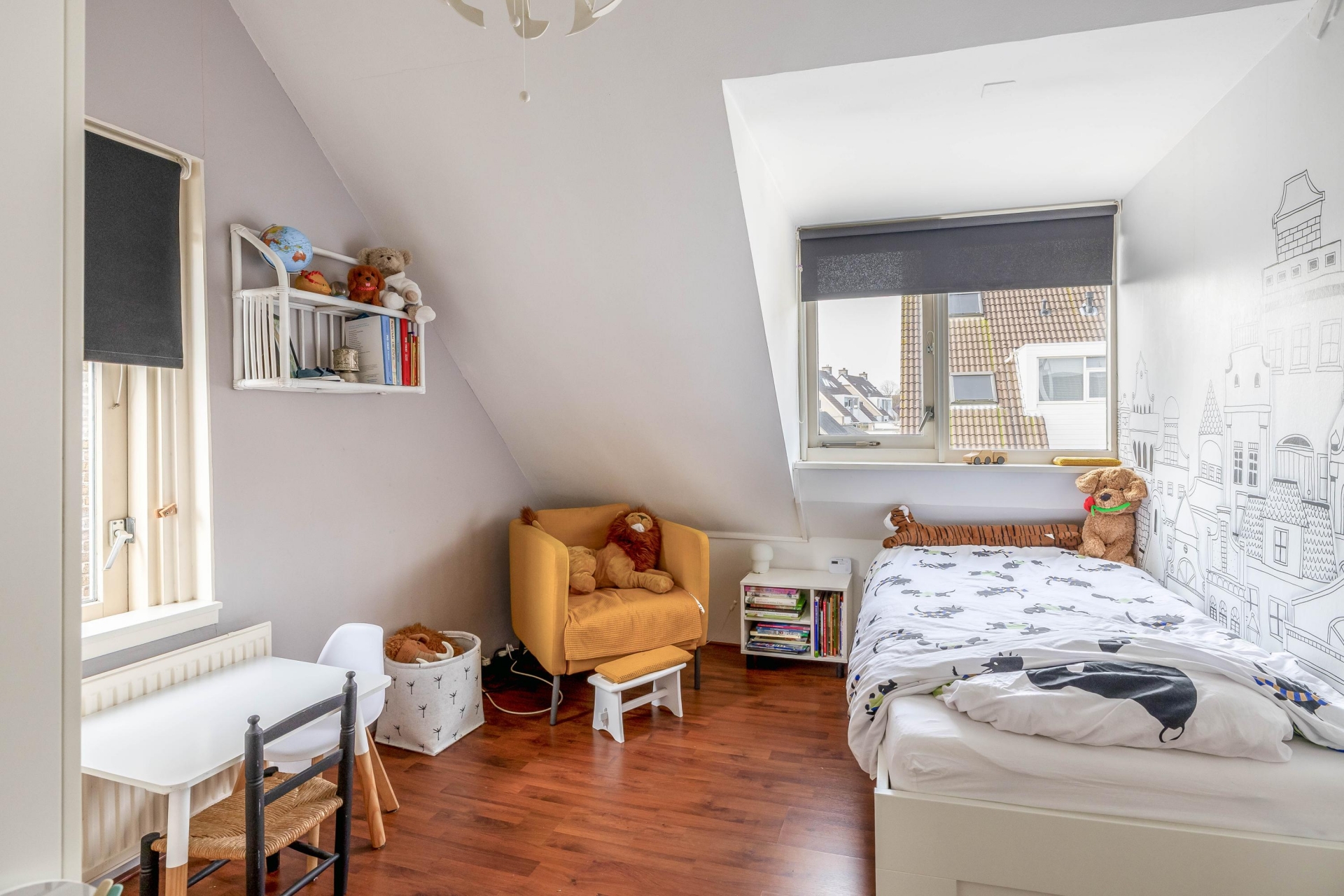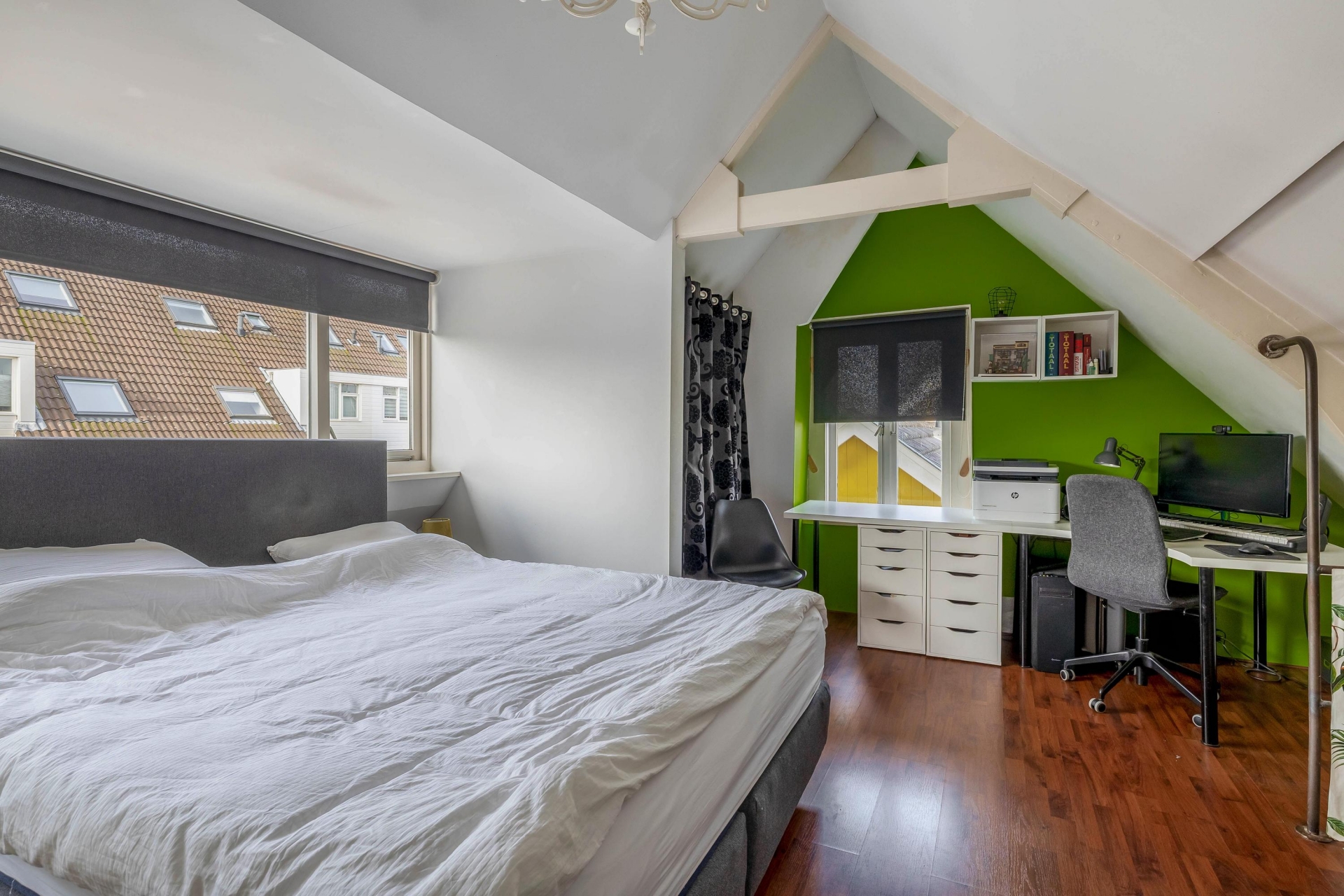 Op de verdieping zie je opnieuw dat dit huis net even anders is dan anders. Boven kom je in de grote ouderslaapkamer. Vanuit deze ruimte is er toegang tod de tweede slaapkamer.