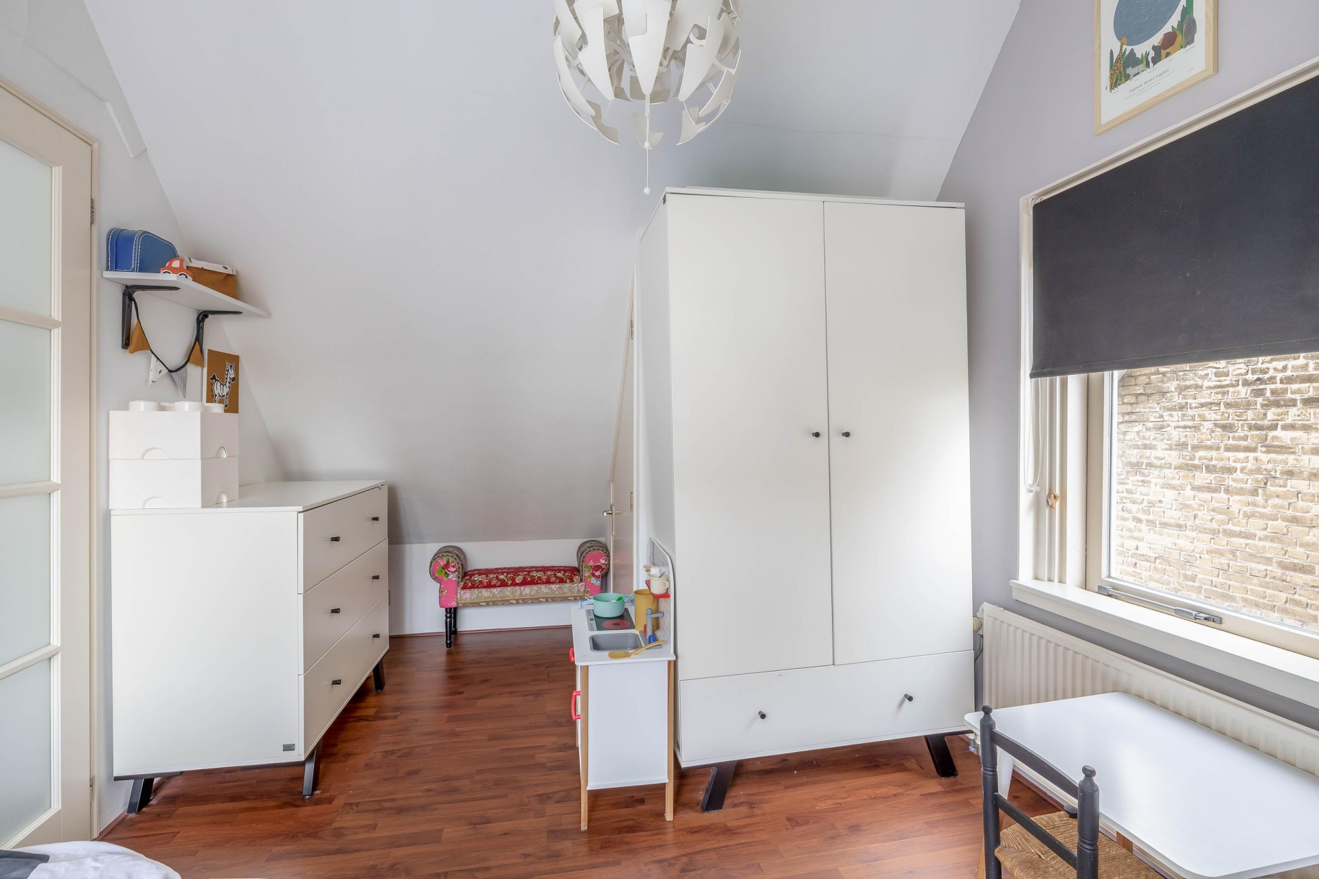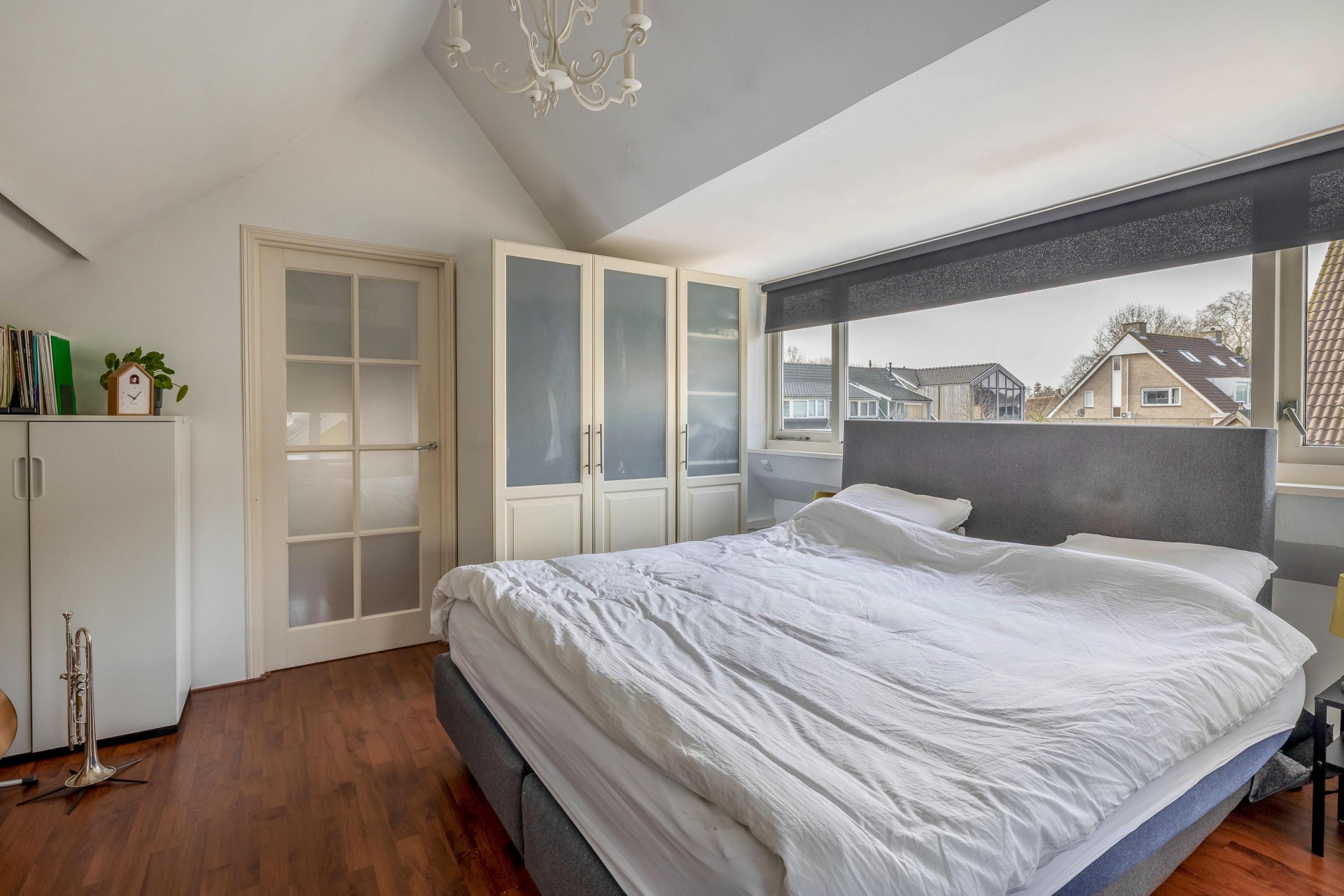 In de grote slaapkamer bevind zich een kleine bergruimte, ideaal voor het opbergen van spullen die je niet dagelijks nodig hebt.