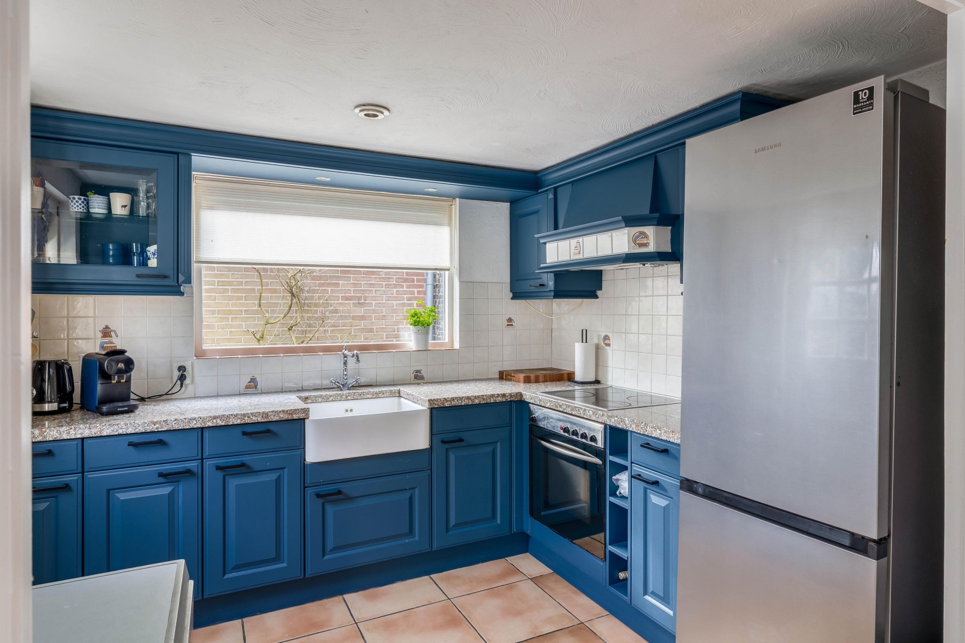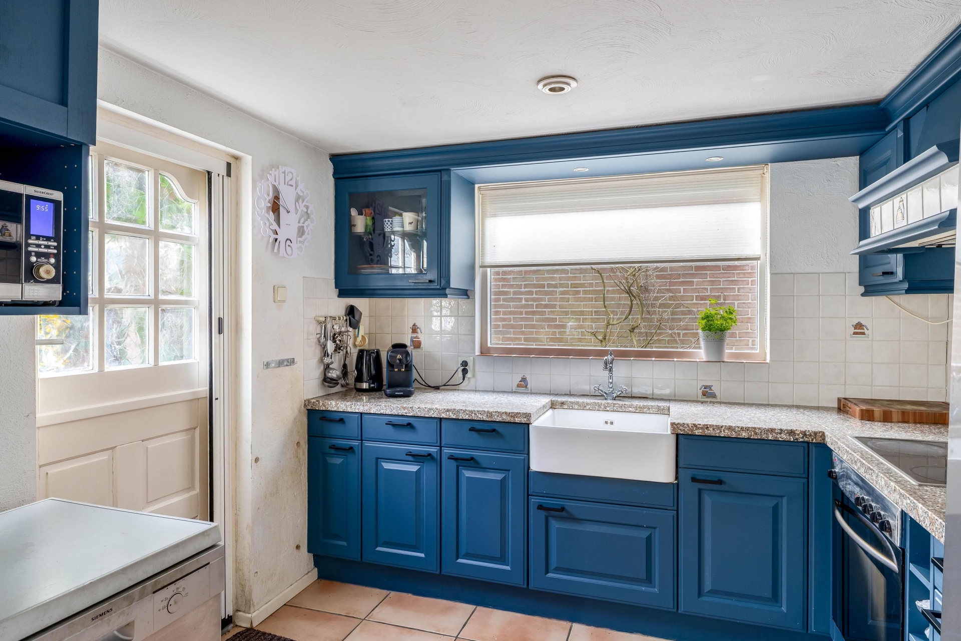 Aan de achterzijde bevindt zich de keuken met een extra eet- of werkgedeelte, waardoor het een heerlijke leefkeuken is. Dat maakt deze ruimte meer dan alleen een plek om te koken. Je kunt hier ook prima een eettafel kwijt of een gezellige plek maken om de dag te starten met een kop koffie. De keuken heeft een praktische opstelling en kijkt uit op de buitenruimte, wat zorgt voor een prettige verbinding met buiten.