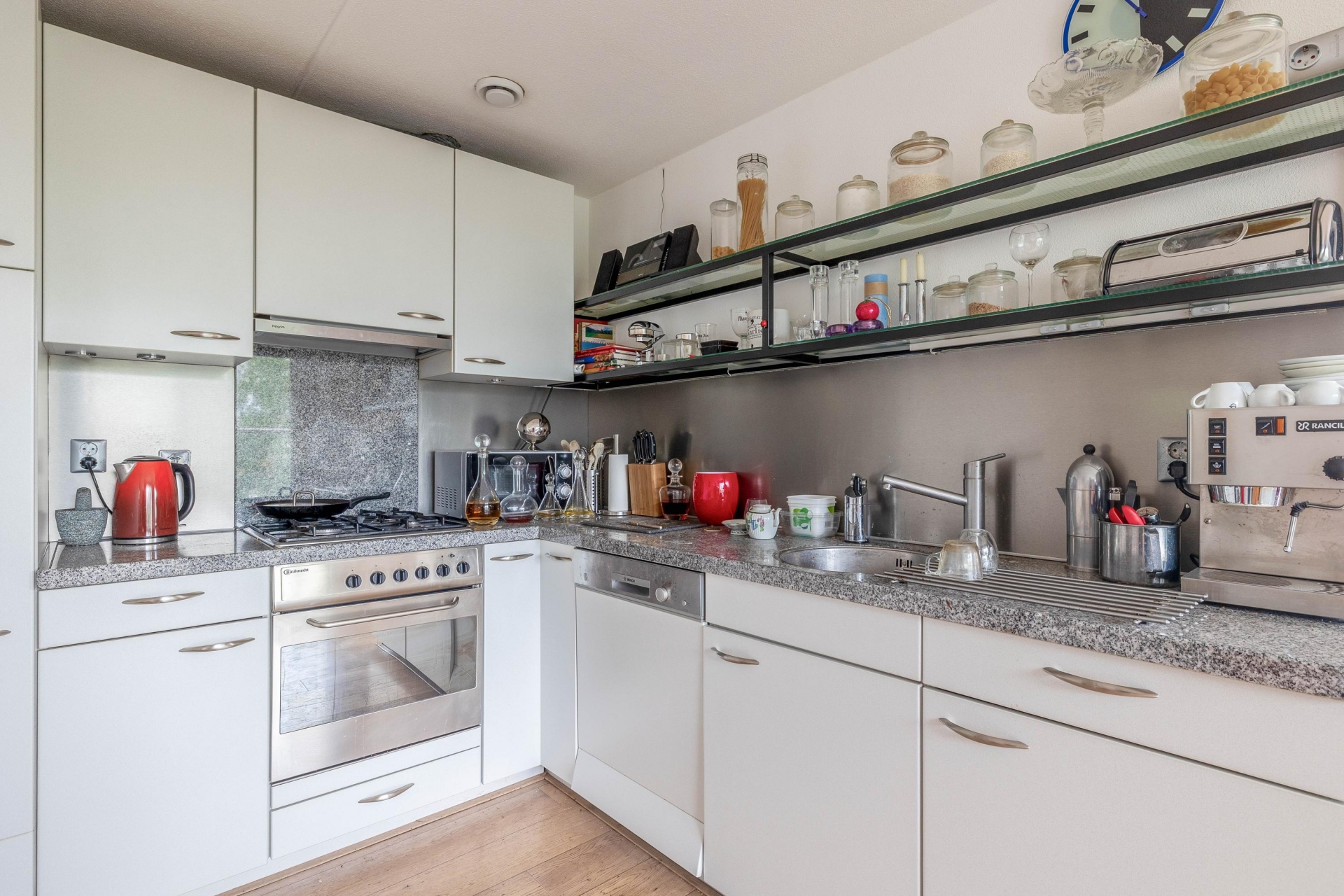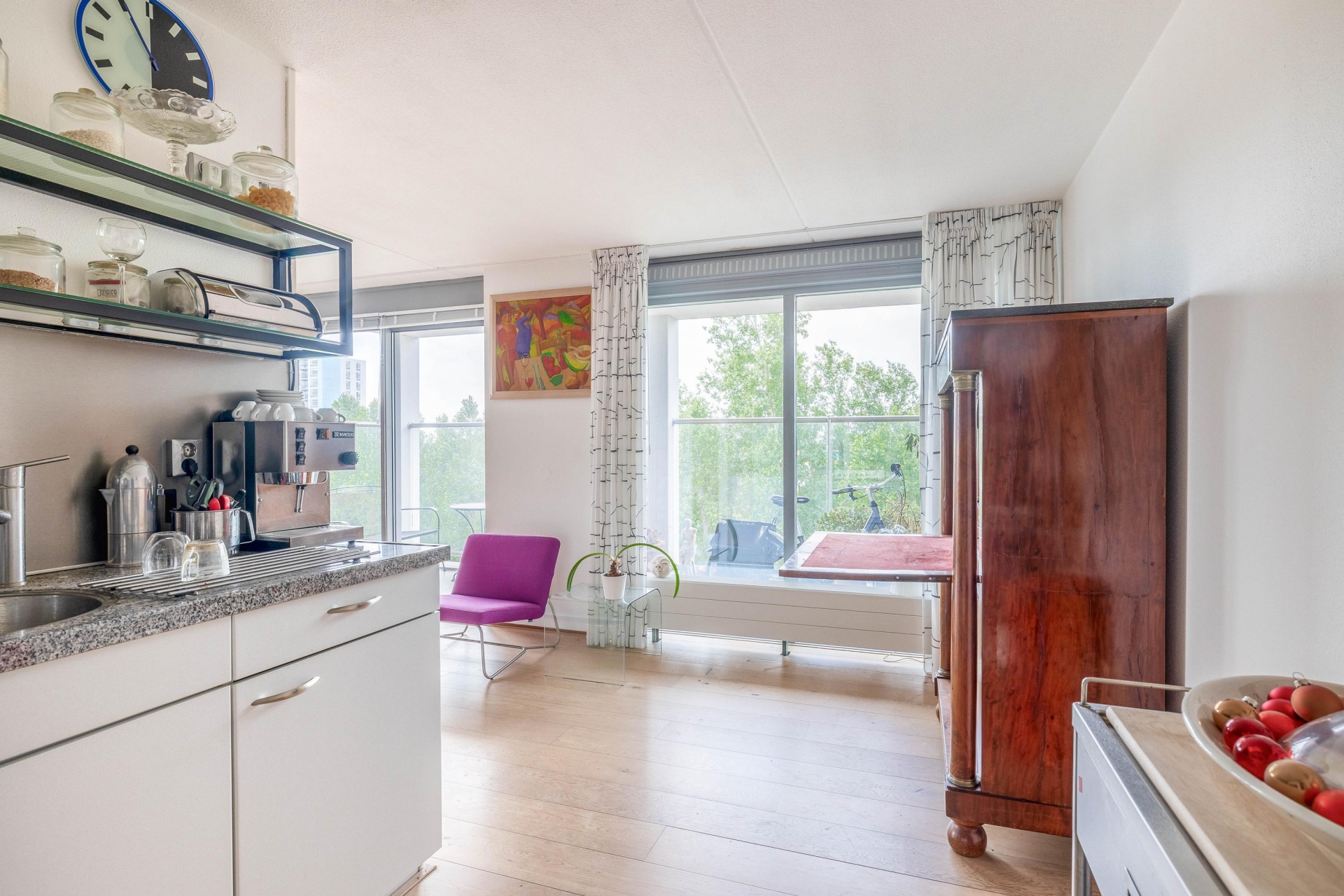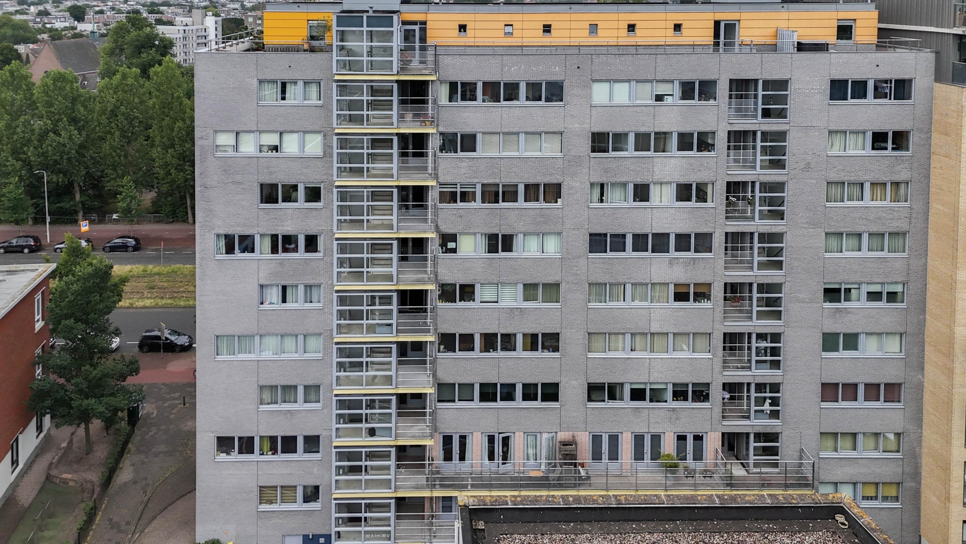 Gesloten entree met brievenbussen- en bellentableau en videofoon-installatie; trappenhuis en lift naar 5e etage; woningentree via ruime gang, voorzien van laminaat, meterkast en ruime inpandige berging met opstelplaats c.v.-combiketel en aansluiting voor wasmachine en droger; modern toilet met fontein; slaapkamer 1, voorzien van laminaat; slaapkamer 2, voorzien van laminaat; riante woonkamer, voorzien van laminaat en toegang tot de 2 balkons; half open keuken, voorzien van diverse apparatuur; badkamer, voorzien van inloopdouche, ligbad en wastafelmeubel; collectieve fietsenberging in de onderbouw.