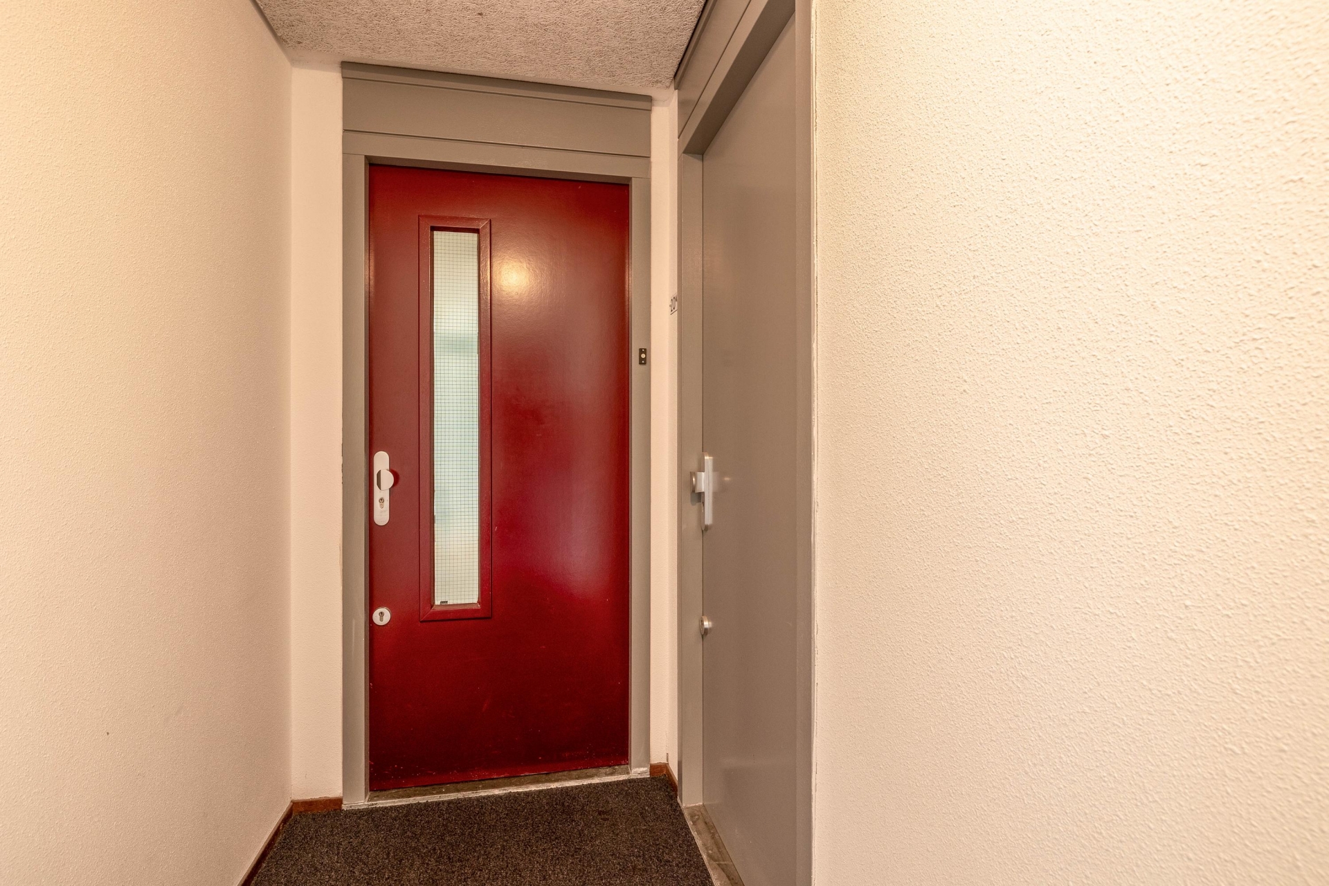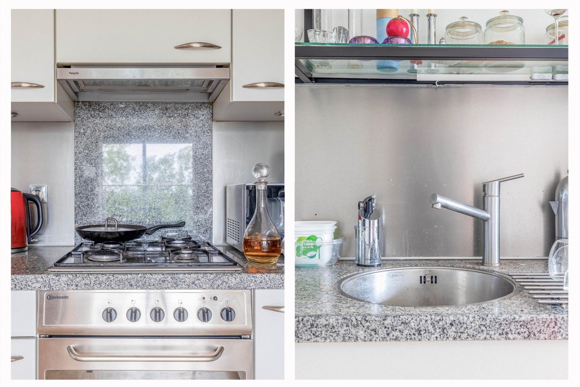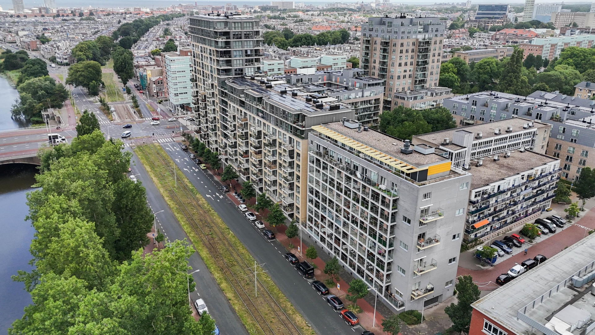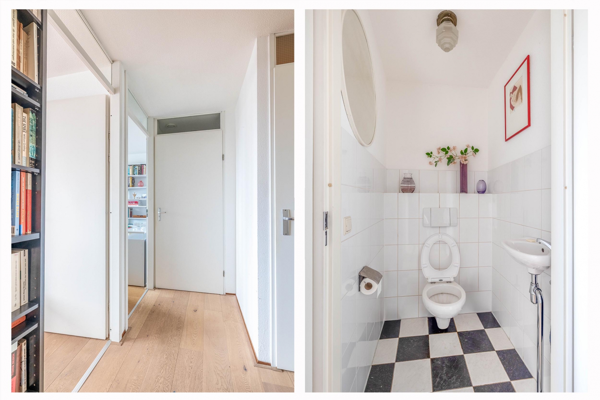 Gesloten entree met brievenbussen- en bellentableau en videofoon-installatie; trappenhuis en lift naar 5e etage; woningentree via ruime gang, voorzien van laminaat, meterkast en ruime inpandige berging met opstelplaats c.v.-combiketel en aansluiting voor wasmachine en droger; modern toilet met fontein; slaapkamer 1, voorzien van laminaat; slaapkamer 2, voorzien van laminaat; riante woonkamer, voorzien van laminaat en toegang tot de 2 balkons; half open keuken, voorzien van diverse apparatuur; badkamer, voorzien van inloopdouche, ligbad en wastafelmeubel; collectieve fietsenberging in de onderbouw.
