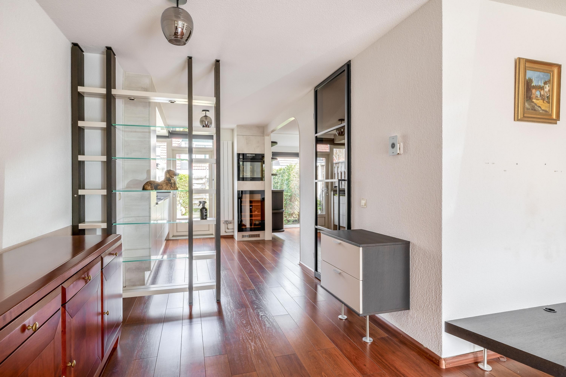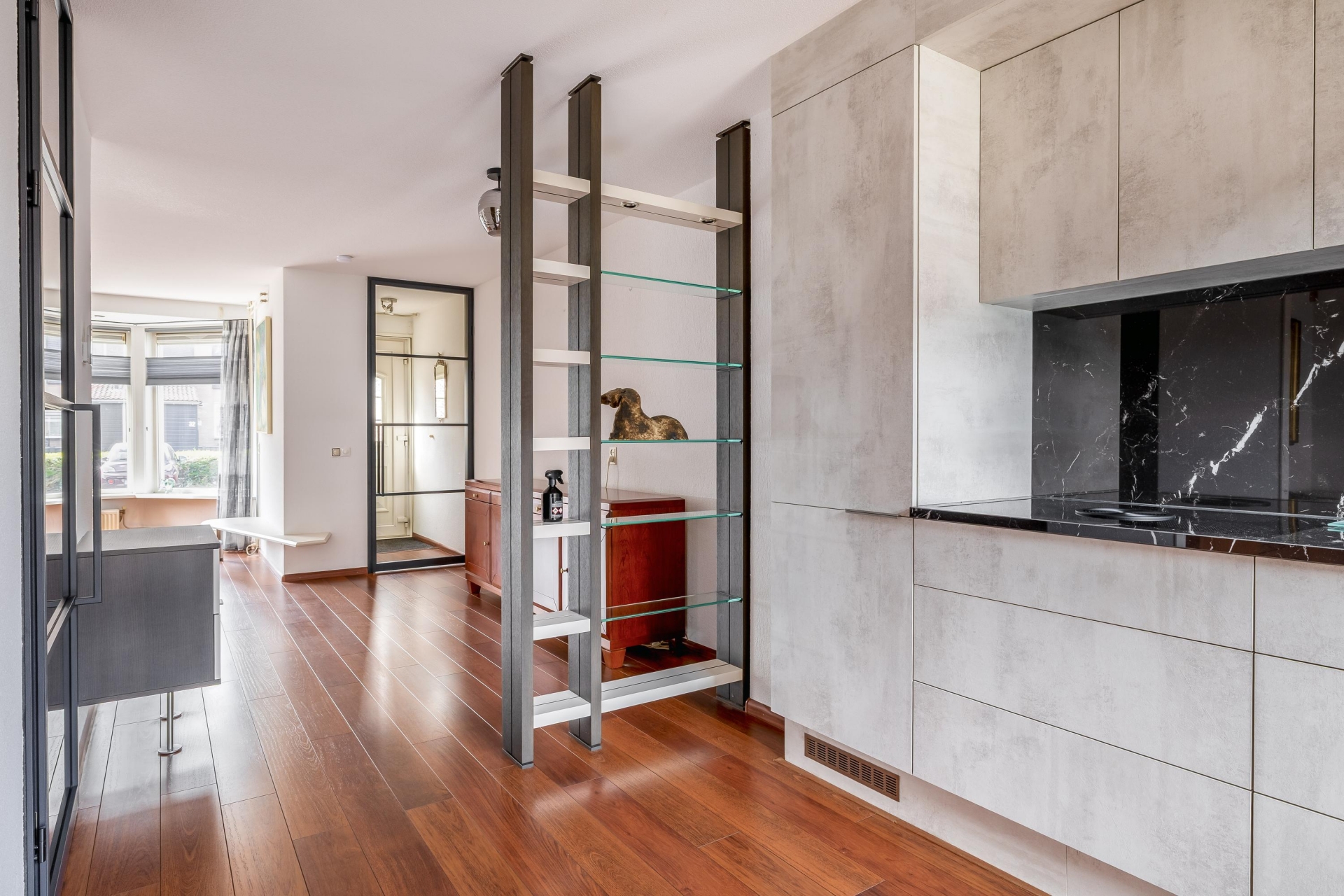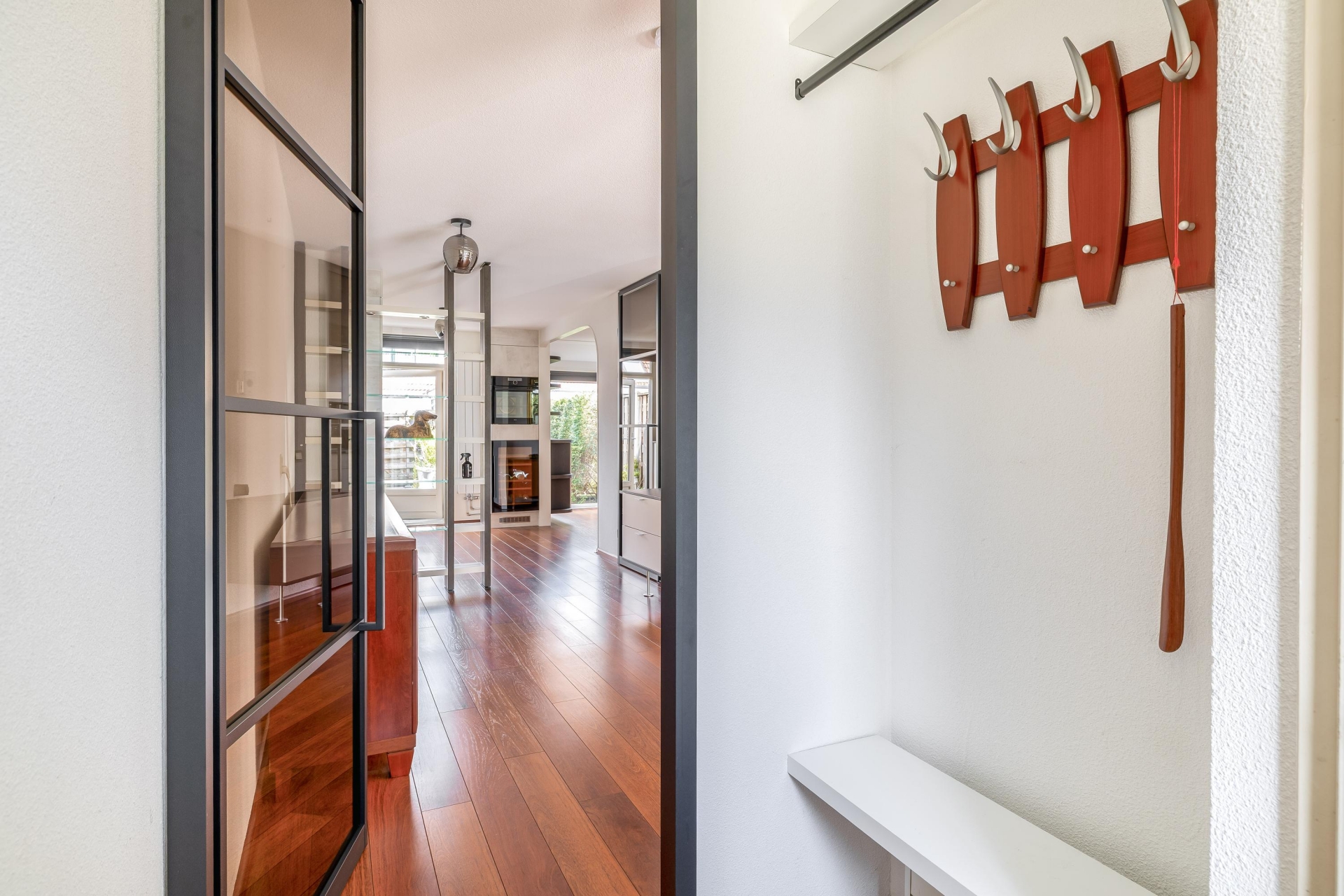 Wat hier echt in het oog springt zijn de luxe zwart stalen deuren. Deze geven het huis een moderne en stoere uitstraling en zorgen tegelijkertijd voor een speelse afscheiding tussen de verschillende leefruimtes. Het is zo’n detail dat het huis net even onderscheidt van de rest.