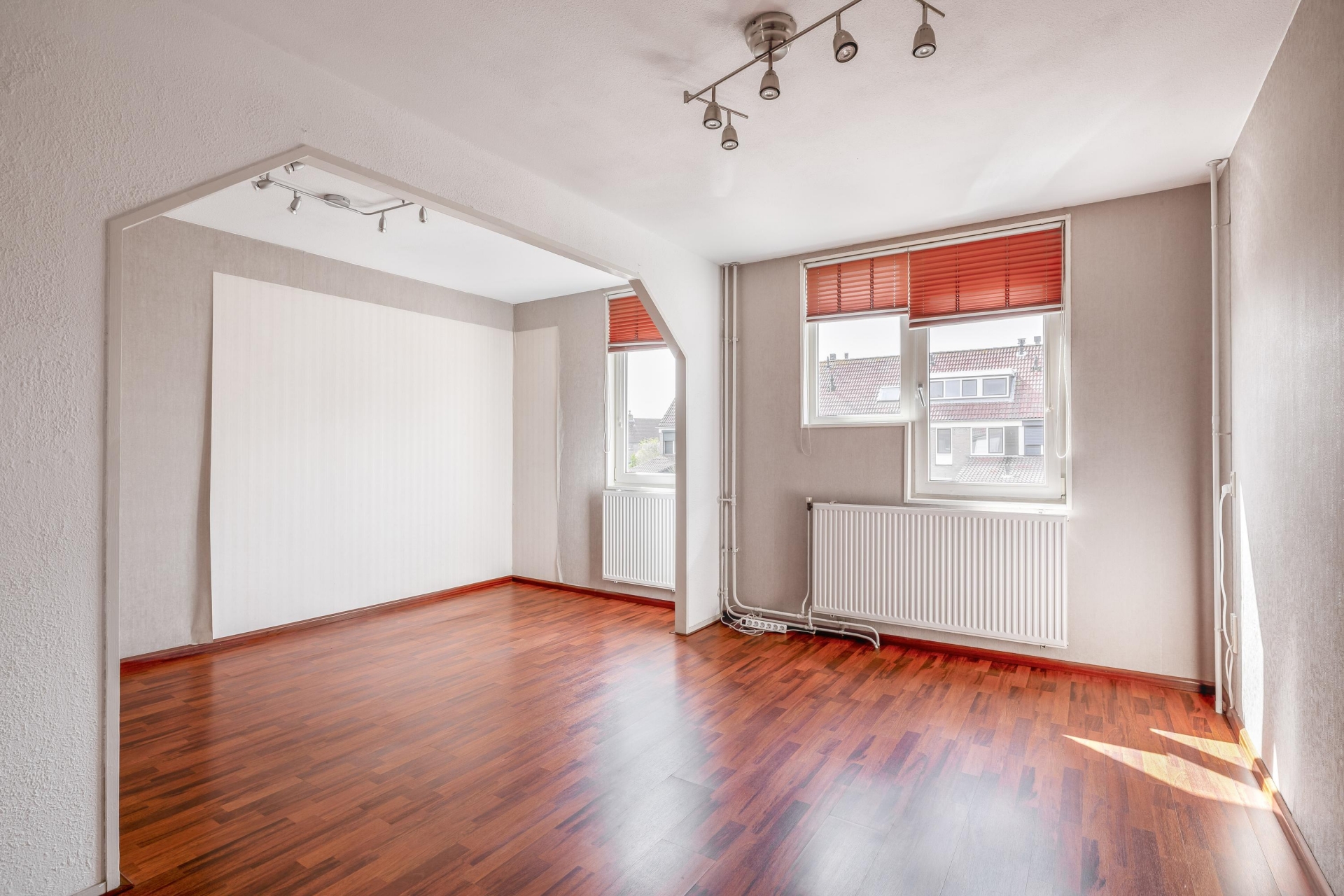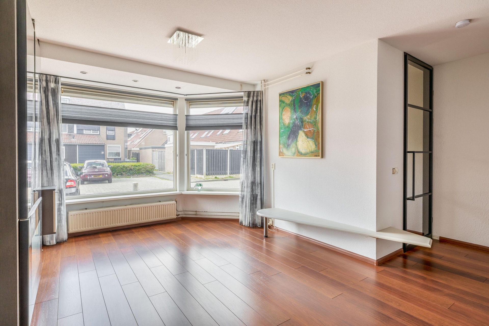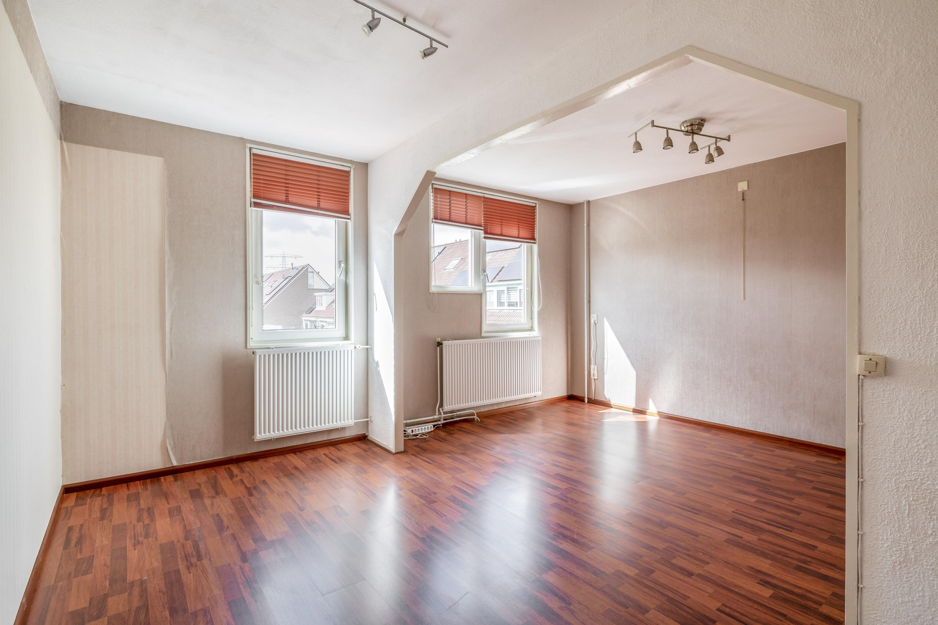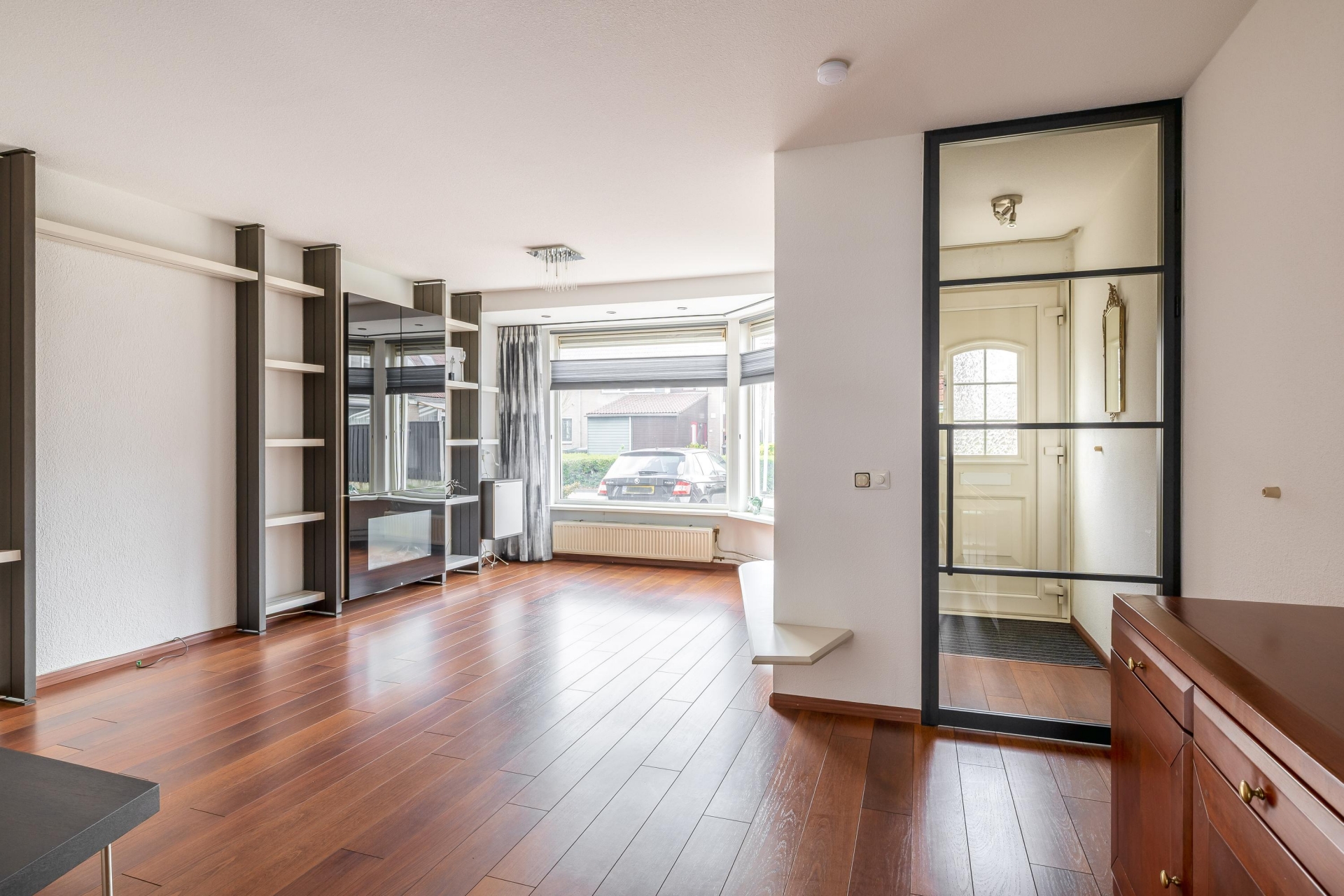 Bij binnenkomst valt direct de fijne indeling op. De woonkamer is heerlijk licht door de grote raampartij aan de voorzijde en biedt meer dan genoeg ruimte voor een gezellige zithoek én een ruime eettafel. De warme vloerafwerking zorgt direct voor sfeer en maakt het geheel compleet.