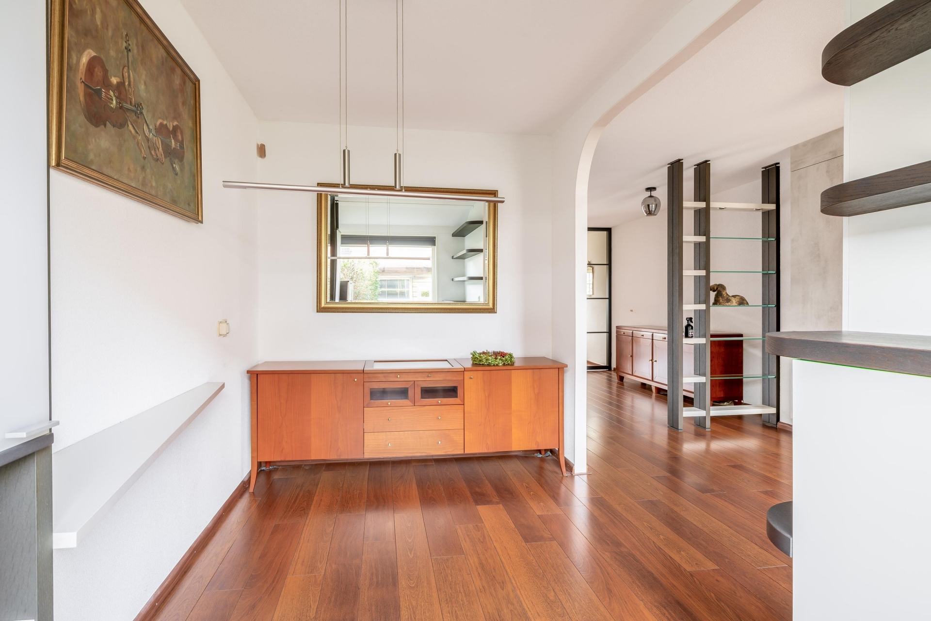 Aan de achterzijde vind je de eetkamer, die naadloos overloopt in de keuken.