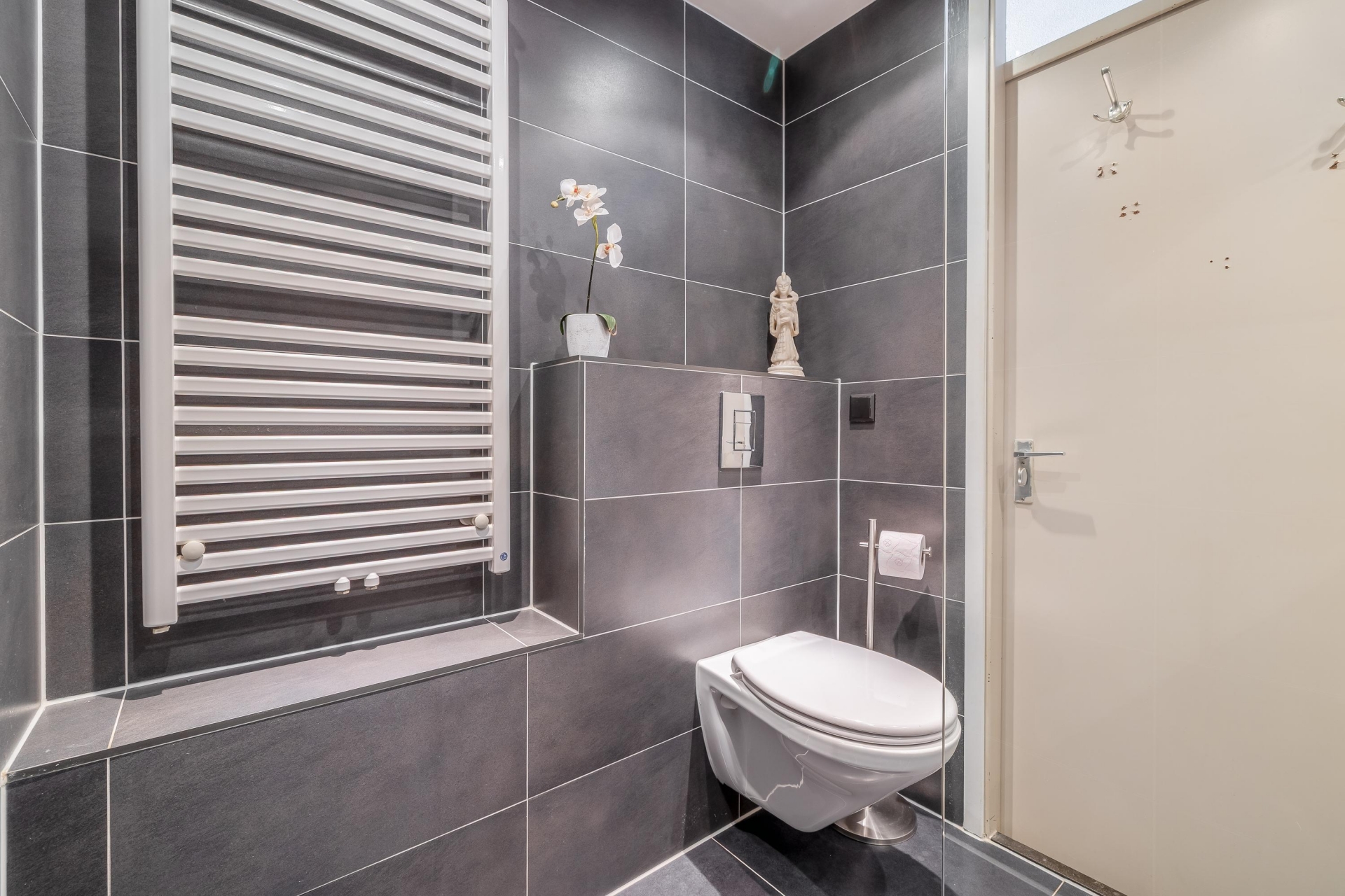 De badkamer is modern uitgevoerd en beschikt over een inloopdouche, wastafelmeubel en een tweede toilet. De donkere tegels in combinatie met het strakke sanitair zorgen voor een luxe uitstraling.