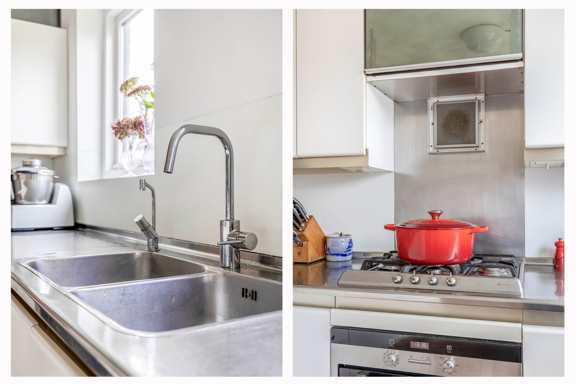 Naast de keuken vind je de meterkast (recent vernieuwd) en een kast met de cv-installatie. Vanuit de woonkamer stap je via openslaande deuren het balkon op, met een trap die direct toegang geeft tot de tuin. Een fijne plek om in de zomer te genieten van zon en groen.