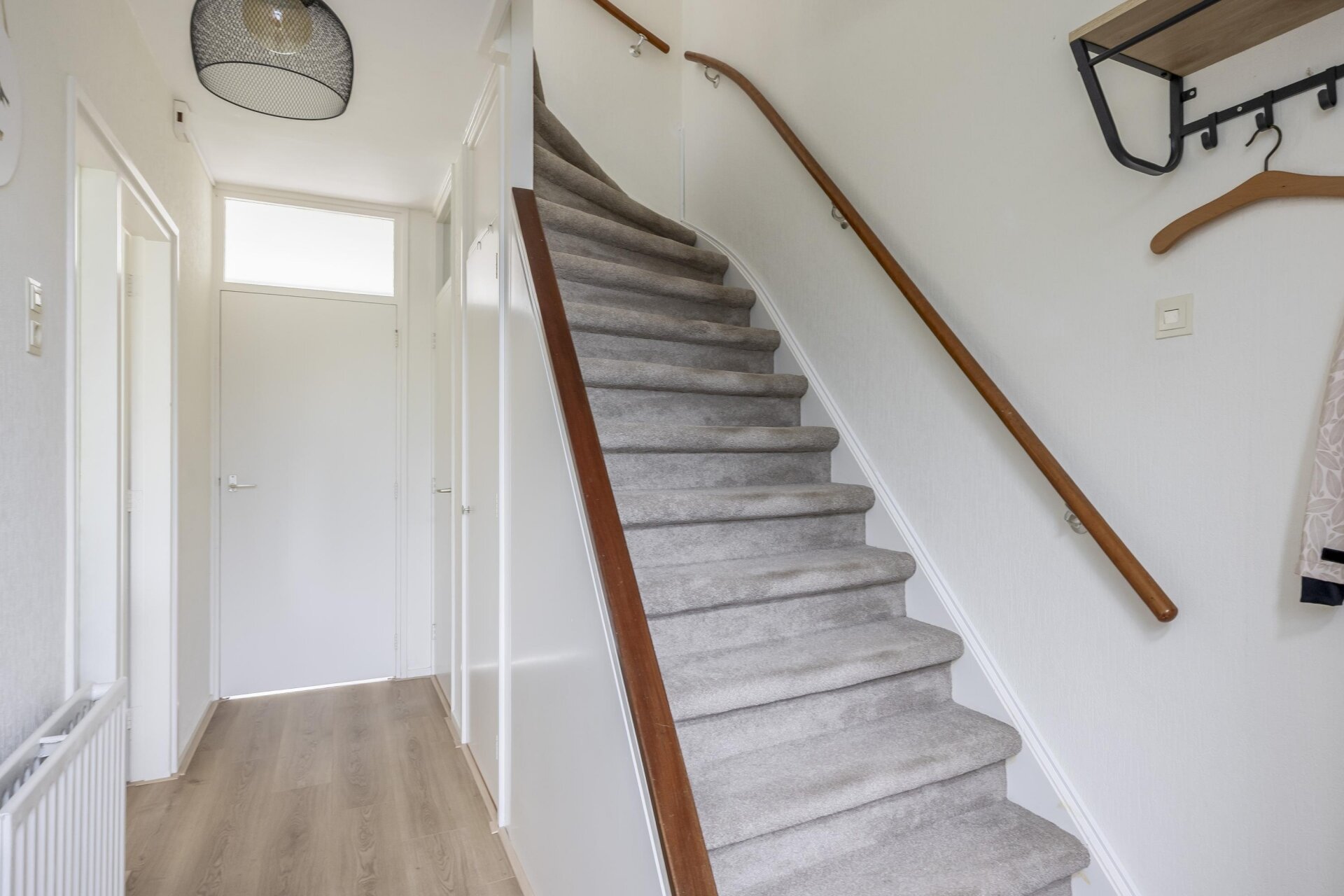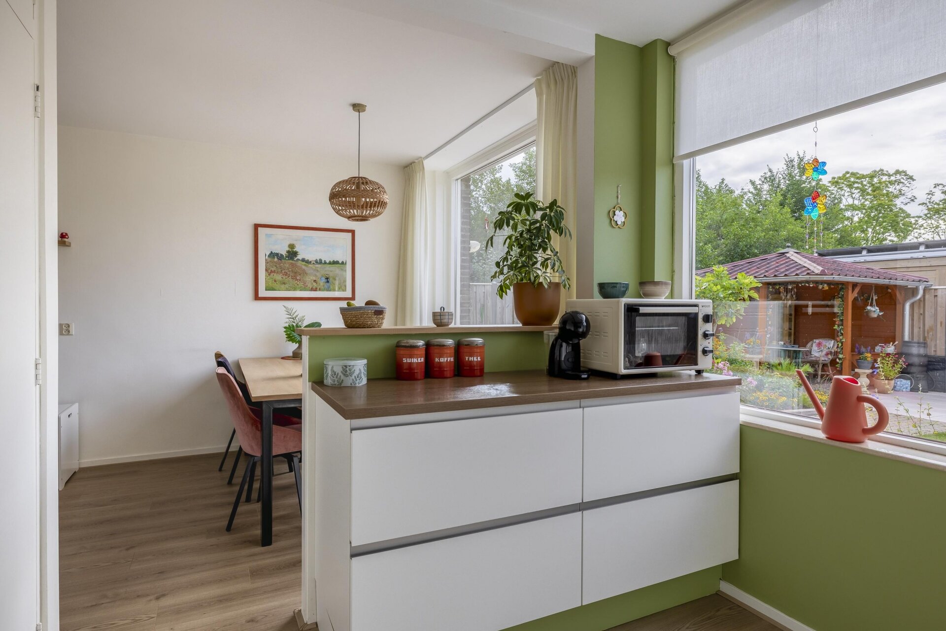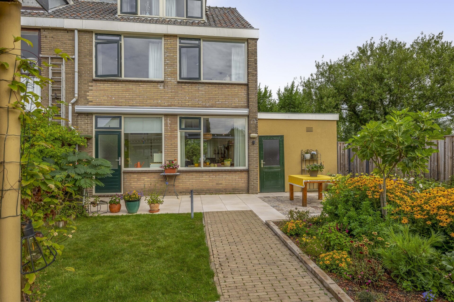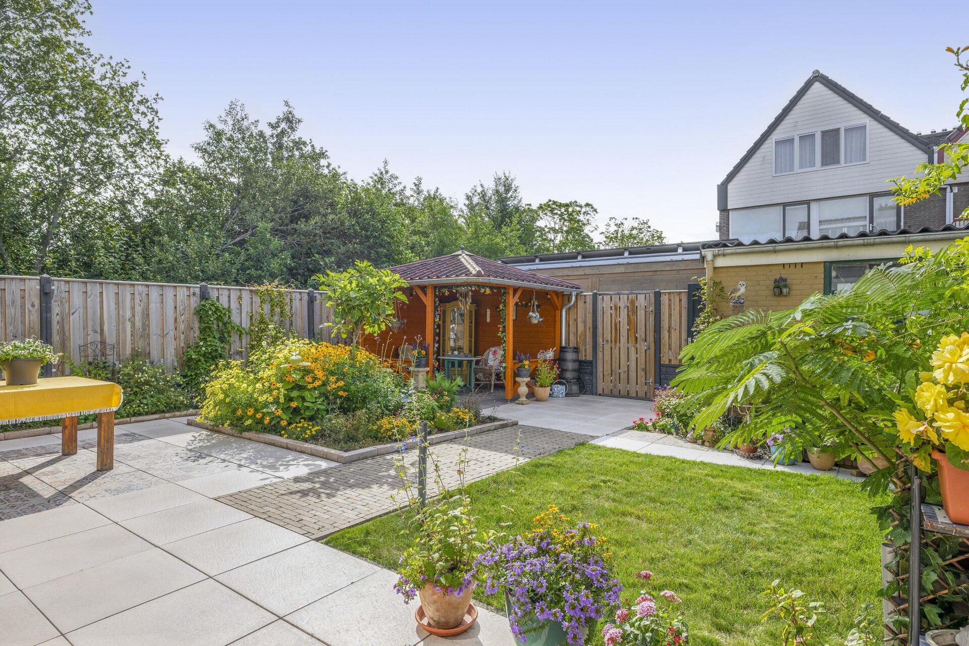 Entree van de woning via de ruime voortuin; hal met meterkast, trapkast, toilet met hangend closet. Lichte doorzon woonkamer met haard en nette keuken voorzien van diverse inbouwapparatuur waaronder een koelkast, vriezer, kookplaat, vaatwasser, oven en afzuigkap. Via de keuken is er toegang tot de ruime zonnige en brede achtertuin met aan de achterzijde een stenen berging met elektra. Via de tuin is de aanpandige garage bereikbaar welke is voorzien van elektra en een elektrische sectionaldeur. De achtertuin is fraai afgewerkt en voorzien van diverse zithoeken en een loungehoek.