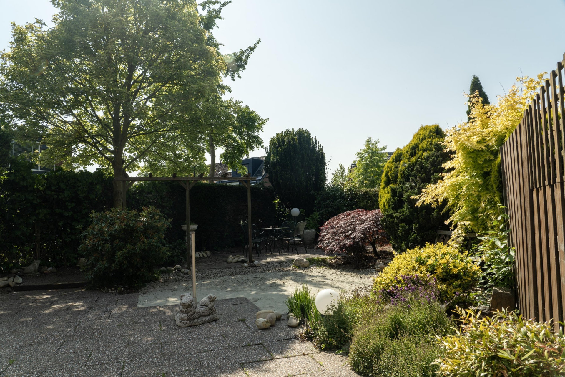 De zonnige achtertuin biedt altijd een prettige plek om te zitten, in de zon of juist in de schaduw. Een heerlijke plek om te ontspannen, buiten te eten of te barbecueën tijdens lange zomeravonden.